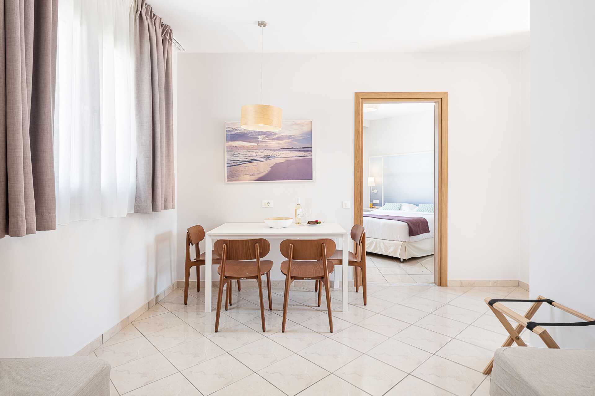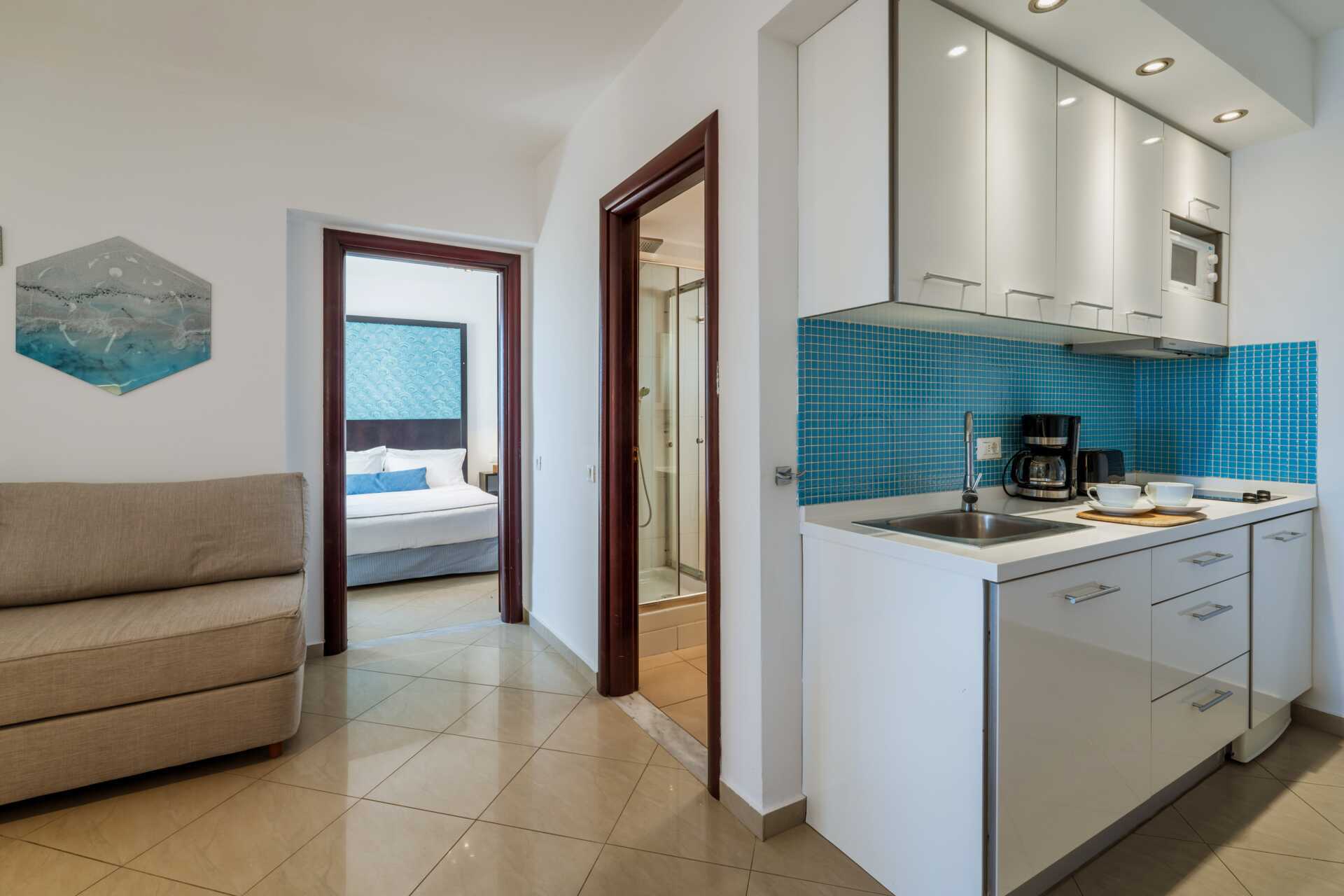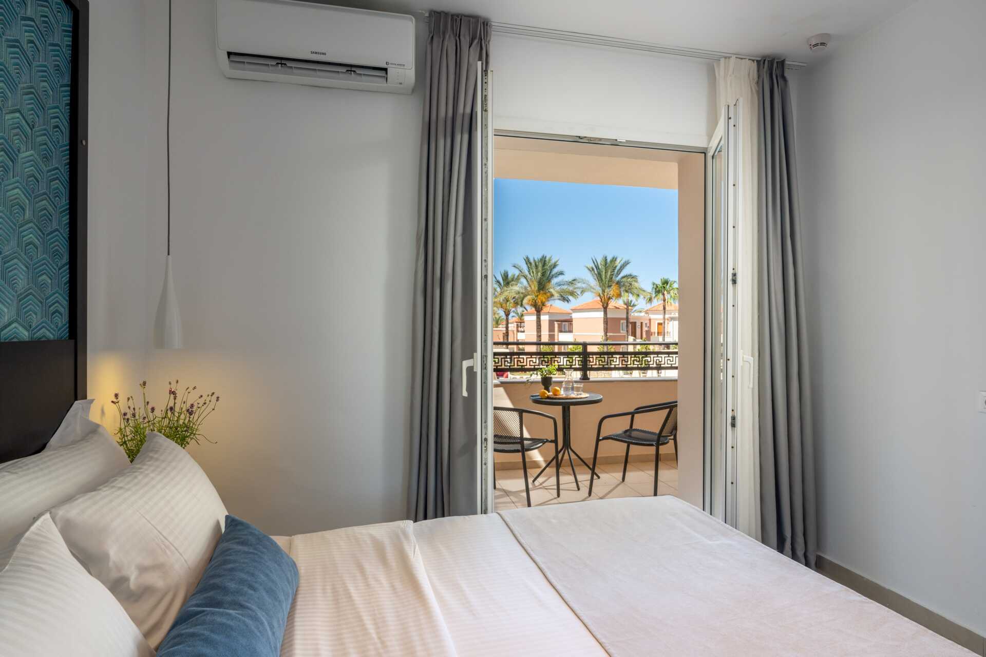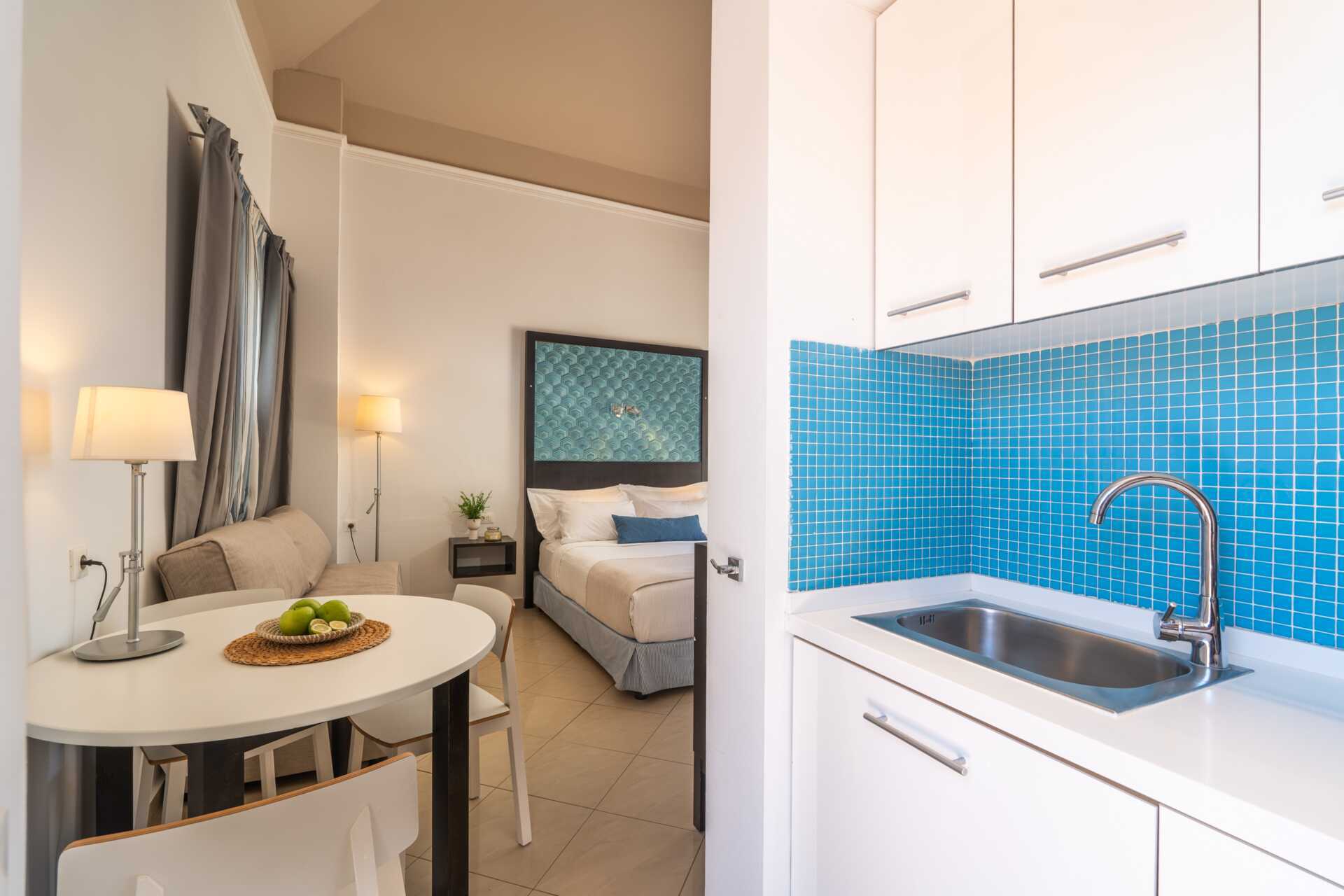 Tweekamerappartement met balkon, deels met zeezicht of beperkt zeezicht. De appartementen bevinden zich in het Aphrodite-gedeelte van het hotel, dichter bij de zee. De kamers voor maximaal drie personen zijn circa 28-30 vierkante meter, de kamers voor maximaal vier personen circa 30-40 vierkante meter. Slaapkamer en gecombineerde woonkamer met kitchenette. Een tweepersoonsbed. Mogelijkheid voor extra bedden in slaapbank. Minikeuken met koelkast, kookplaat, waterkoker en eenvoudige keukenapparatuur. Wifi, airconditioning en kluis inbegrepen. TV met internationale zenders. Föhn. Badkamer met douche en wc. Schoonmaak 6 keer/week.