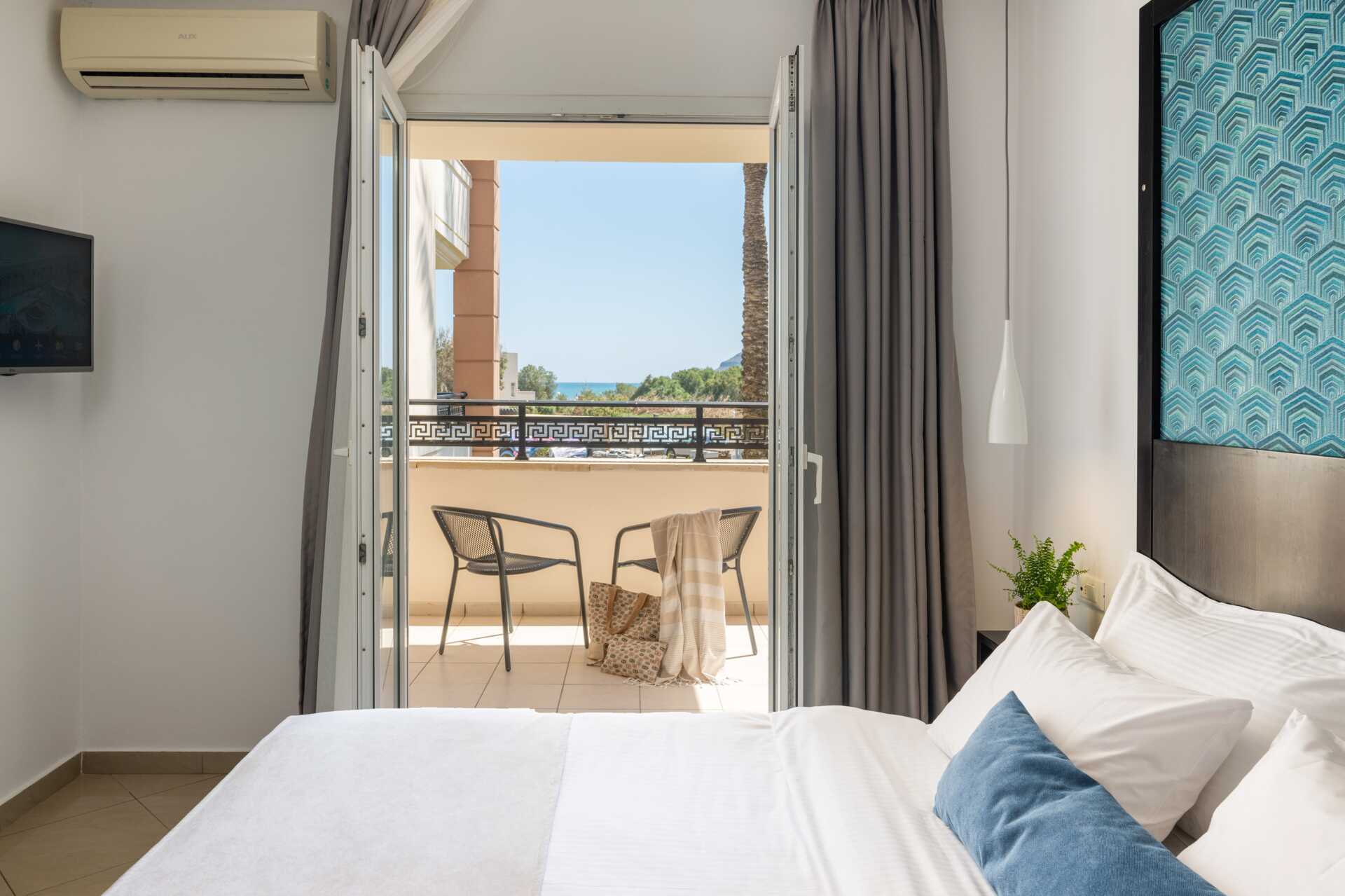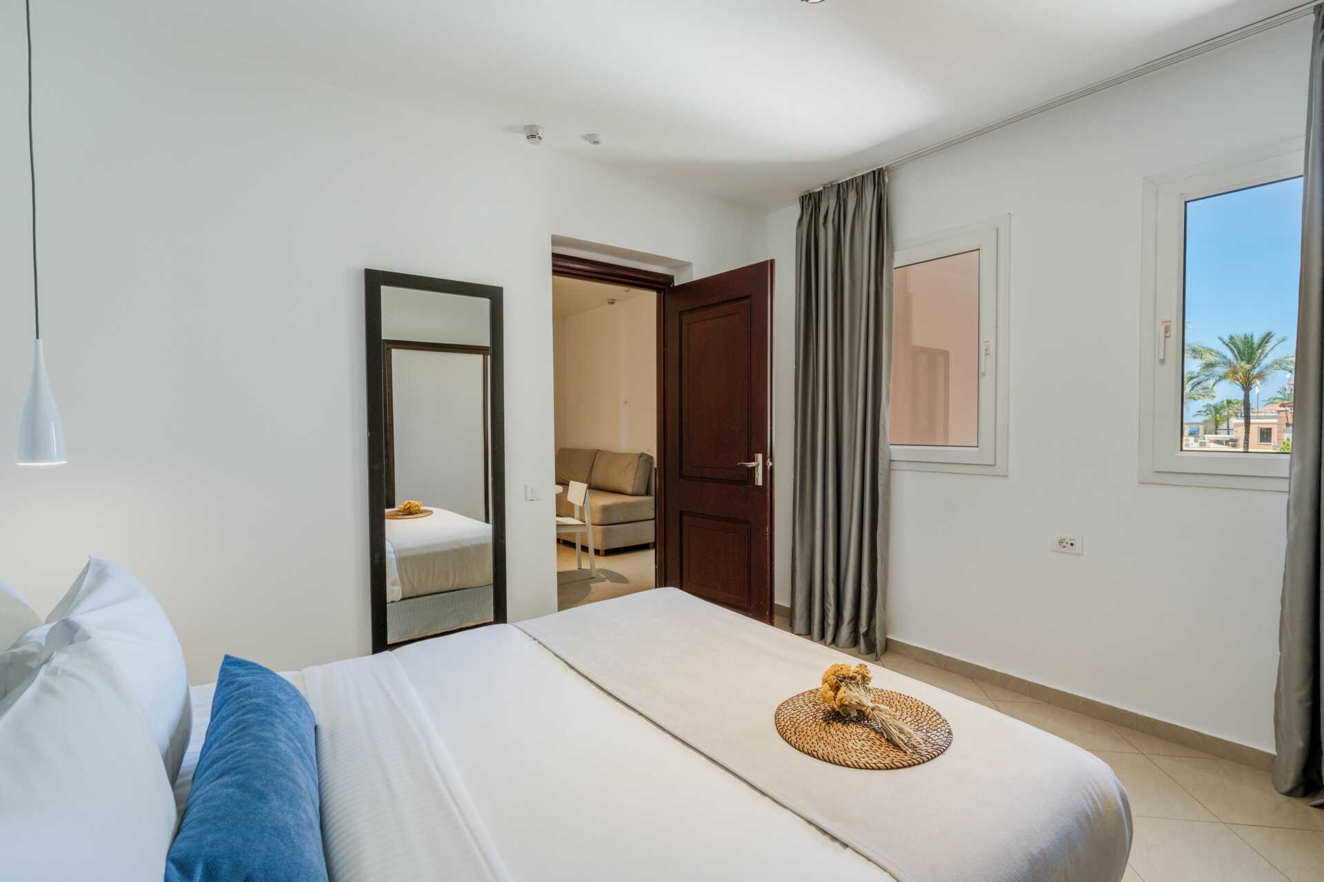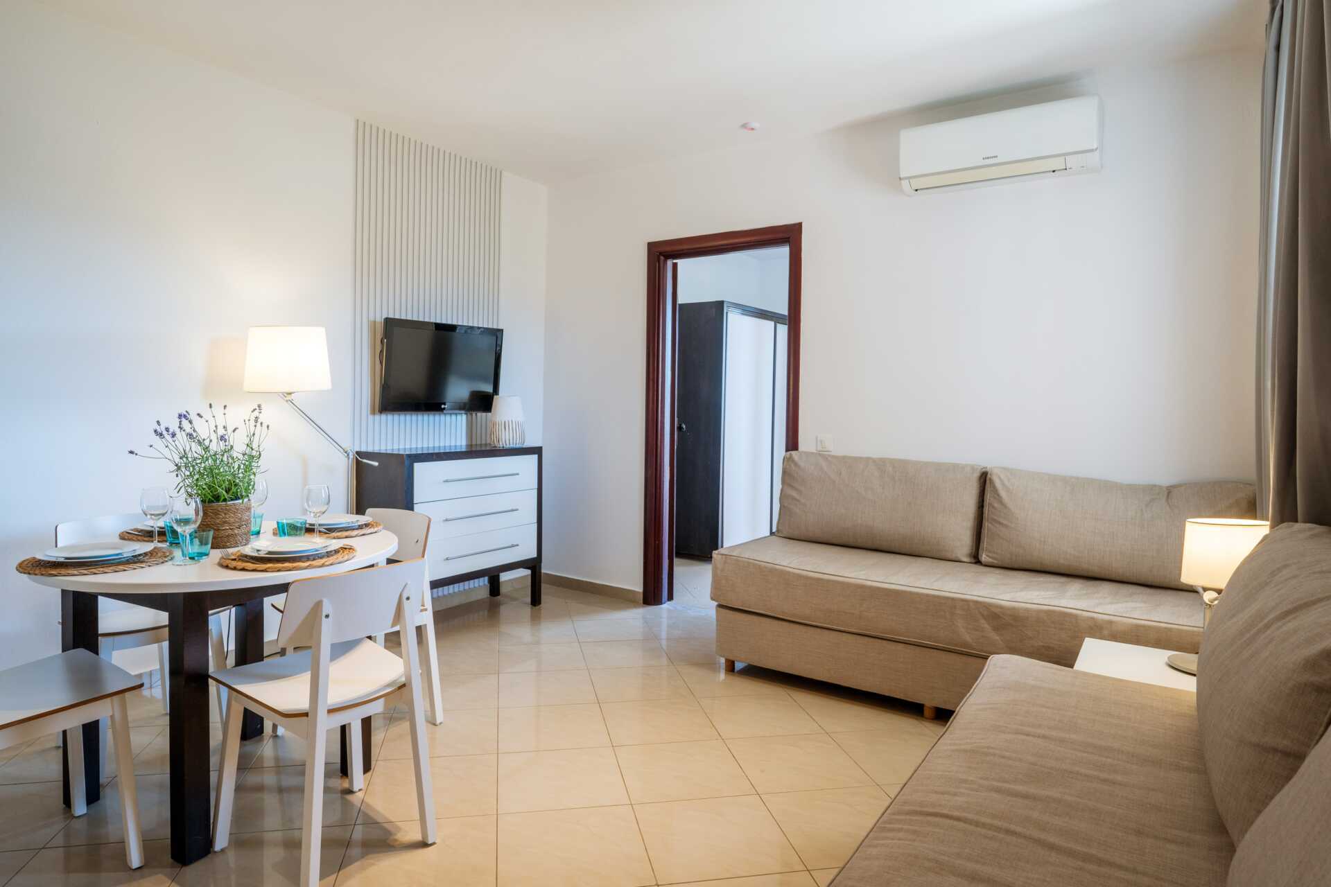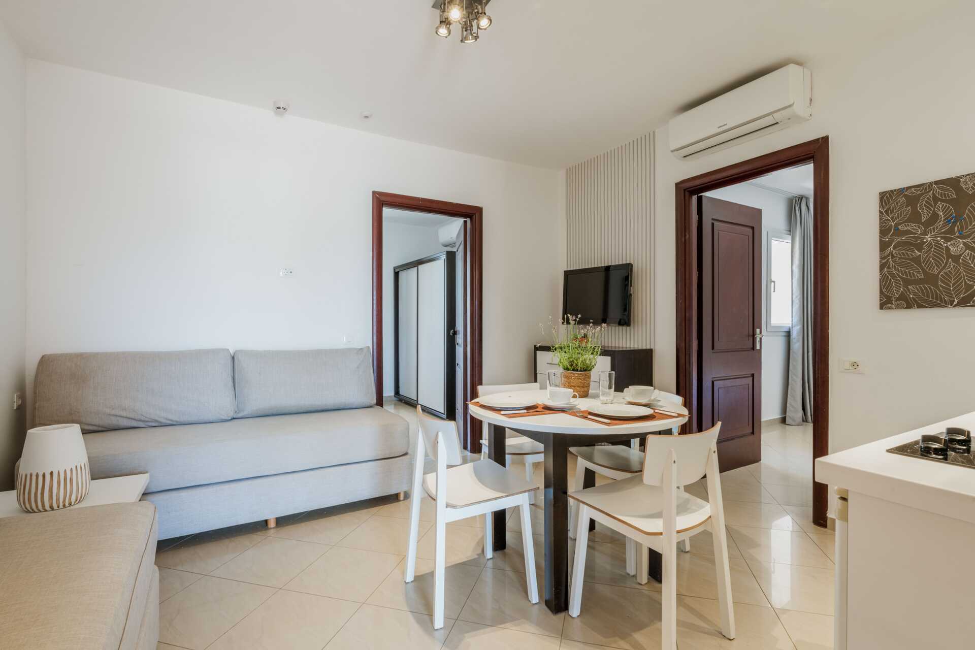 Tweekamerappartement met balkon, deels met zeezicht of beperkt zeezicht. De appartementen bevinden zich in het Aphrodite-gedeelte van het hotel, dichter bij het strand. Slaapkamer en gecombineerde woonkamer met kitchenette. Een tweepersoonsbed in elke slaapkamer. Mogelijkheid voor extra bedden in slaapbank. Minikeuken met koelkast, kookplaat, waterkoker en eenvoudige keukenapparatuur. Wifi, airconditioning en kluis inbegrepen. TV met internationale zenders. Föhn. Badkamer met douche en wc. Schoonmaak 6 keer/week.