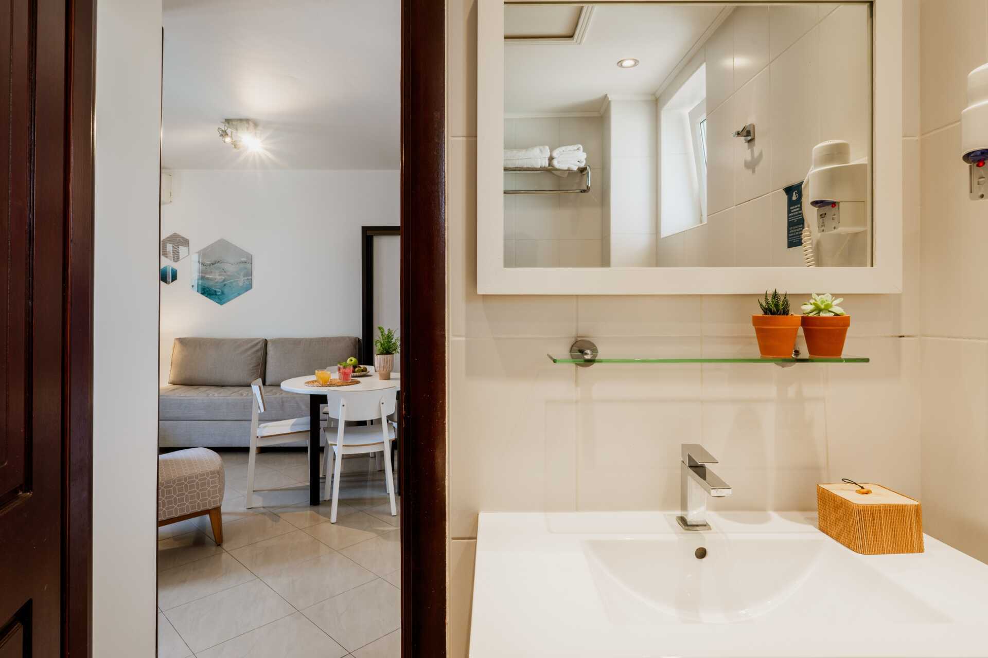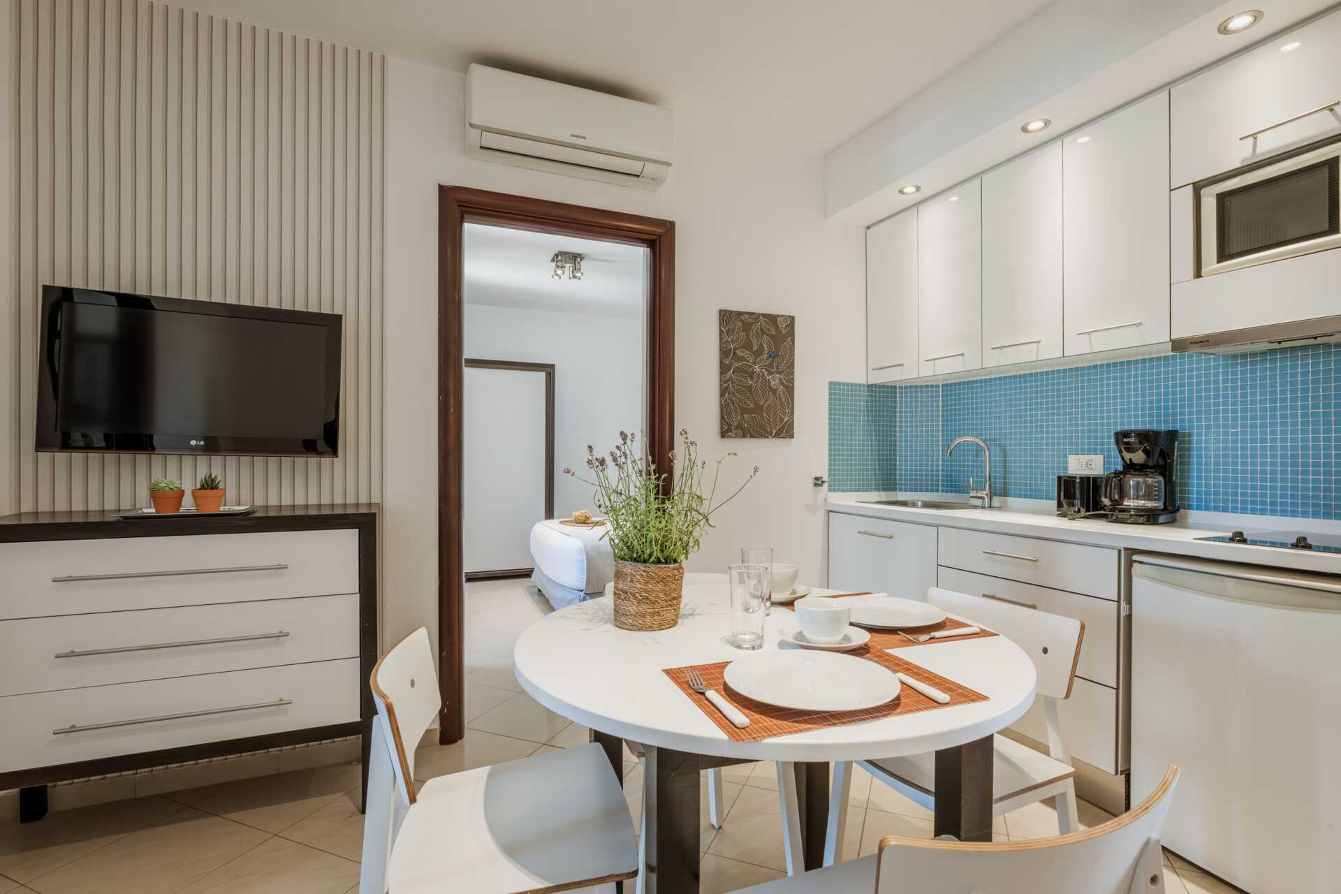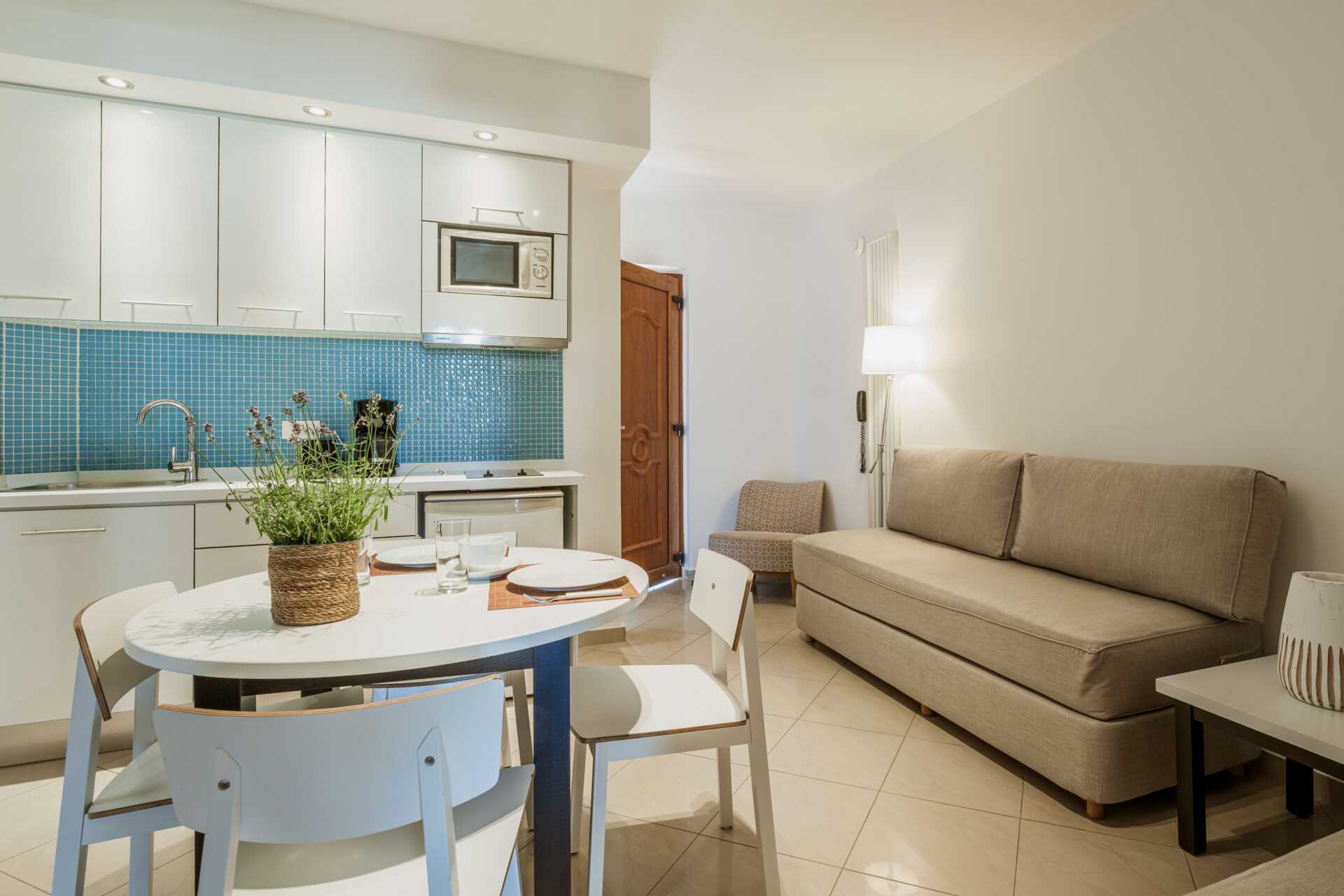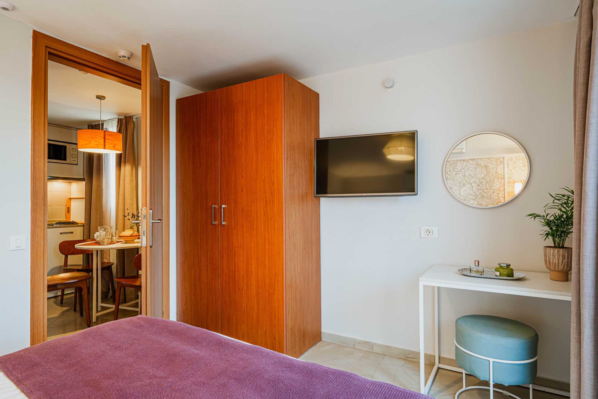 Tweekamerappartement met balkon, deels met zeezicht of beperkt zeezicht. De appartementen bevinden zich in het Aphrodite-gedeelte van het hotel, dichter bij het strand. Slaapkamer en gecombineerde woonkamer met kitchenette. Een tweepersoonsbed in elke slaapkamer. Mogelijkheid voor extra bedden in slaapbank. Minikeuken met koelkast, kookplaat, waterkoker en eenvoudige keukenapparatuur. Wifi, airconditioning en kluis inbegrepen. TV met internationale zenders. Föhn. Badkamer met douche en wc. Schoonmaak 6 keer/week.