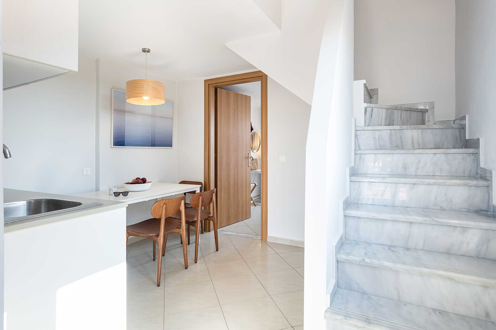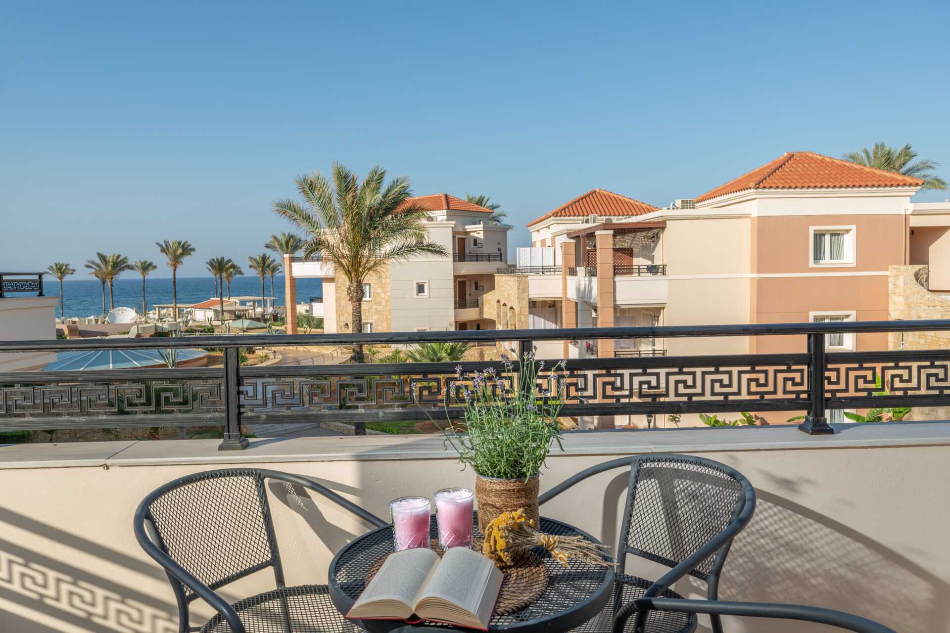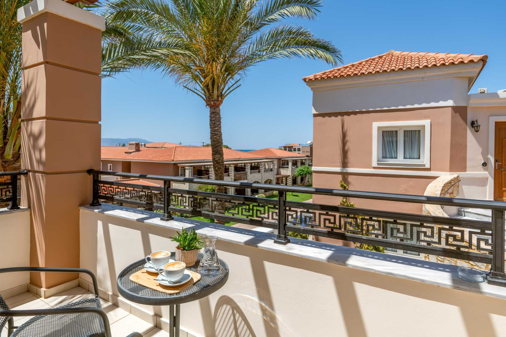 Groter tweekamerappartement in maisonnette met balkon, deels met zeezicht of beperkt zeezicht. De appartementen bevinden zich in het Aphrodite-gedeelte van het hotel, dichter bij de zee. Op de entreeverdieping bevindt zich een kitchenette en een slaapkamer met een tweepersoonsbed. Boven is er de mogelijkheid voor extra bedden op slaapbanken op een slaapzolder. Minikeuken met koelkast, kookplaat, waterkoker en eenvoudige keukenapparatuur. Wifi, airconditioning en kluisje inbegrepen. Tv met internationale zenders. Föhn. Badkamer met douche en toilet. Schoonmaak 6 keer/week.