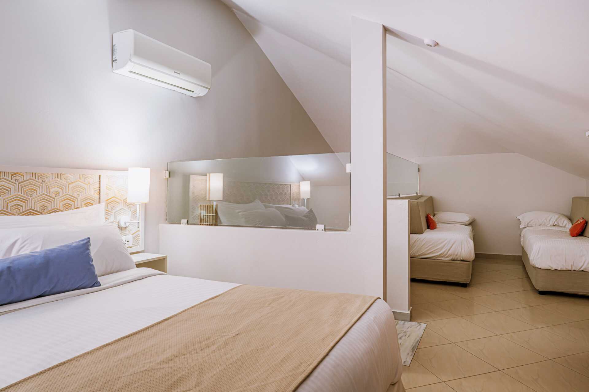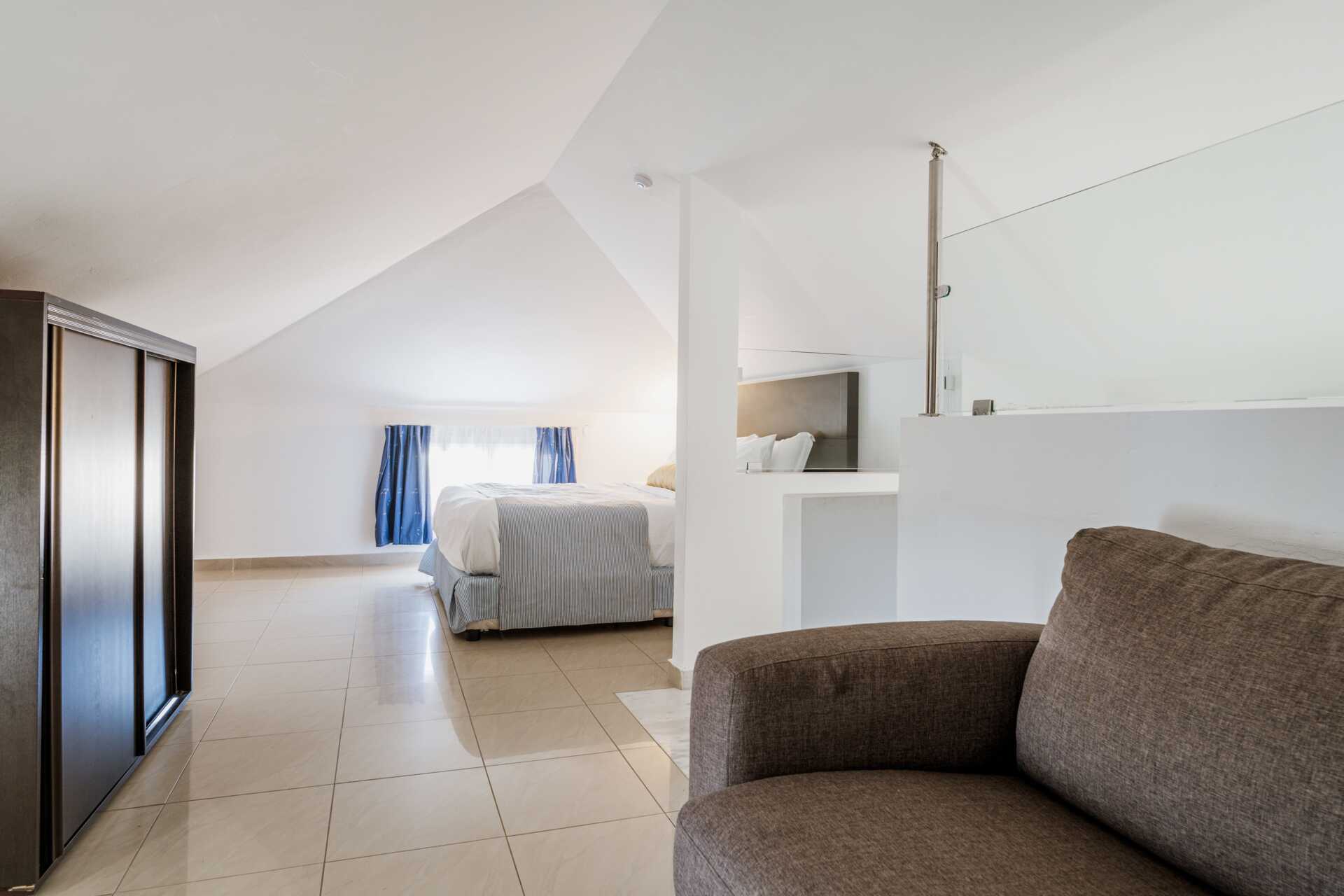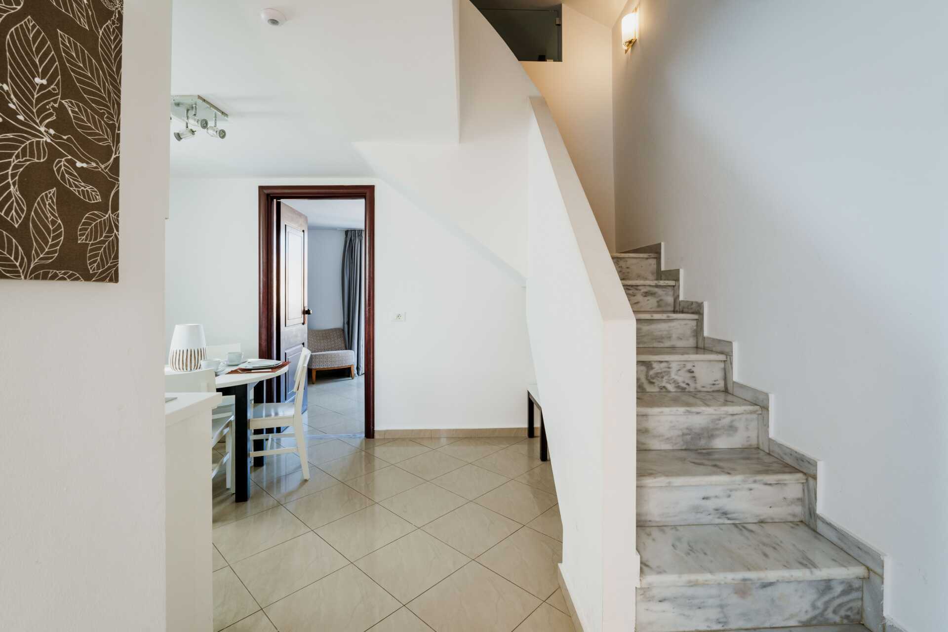 Groter tweekamerappartement in maisonnette met balkon, deels met zeezicht of beperkt zeezicht. De appartementen bevinden zich in het Aphrodite-gedeelte van het hotel, dichter bij de zee. Op de entreeverdieping bevindt zich een kitchenette en een slaapkamer met een tweepersoonsbed. Boven is er de mogelijkheid voor extra bedden op slaapbanken op een slaapzolder. Minikeuken met koelkast, kookplaat, waterkoker en eenvoudige keukenapparatuur. Wifi, airconditioning en kluisje inbegrepen. Tv met internationale zenders. Föhn. Badkamer met douche en toilet. Schoonmaak 6 keer/week.