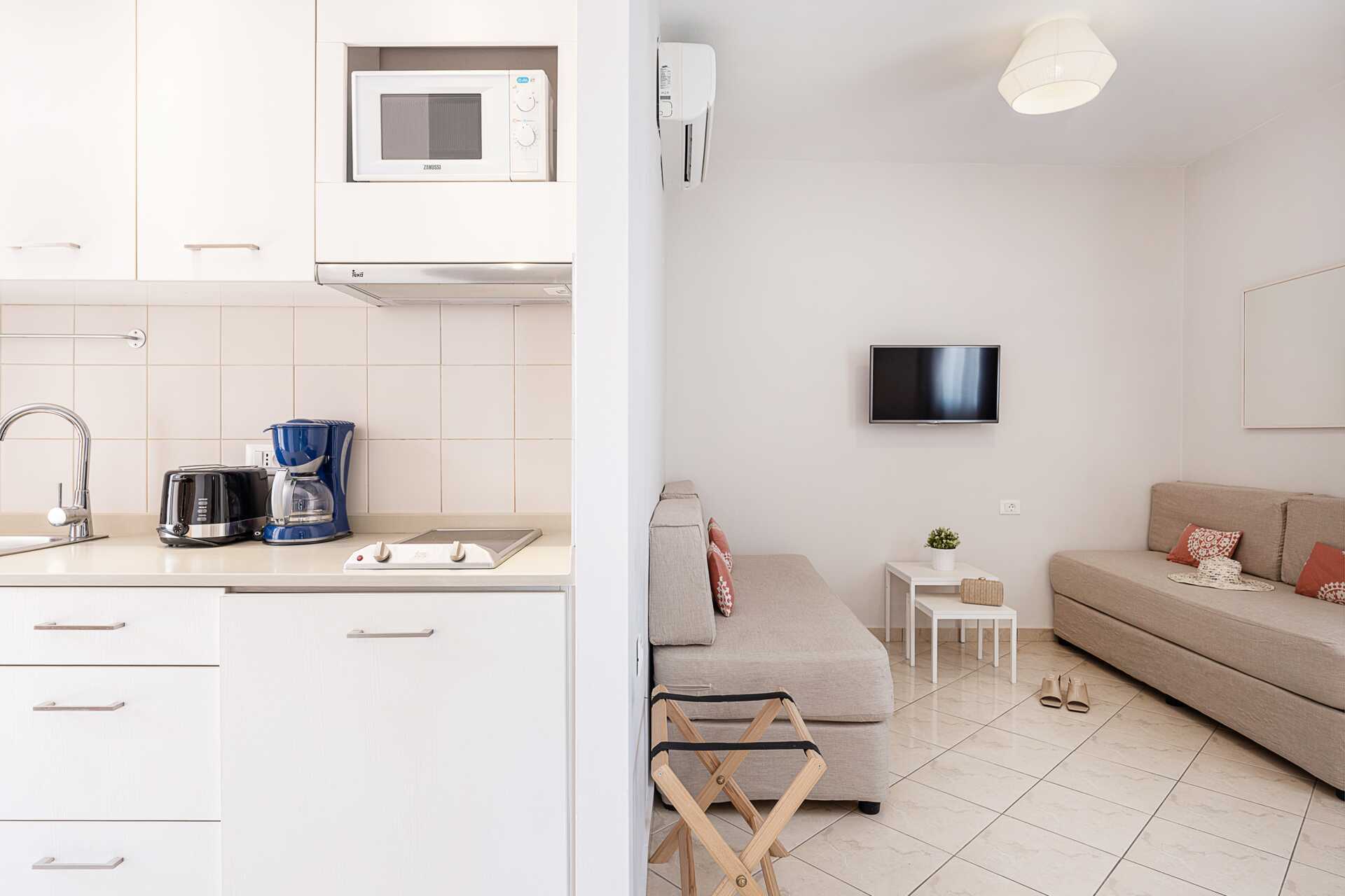 Studio met balkon, sommige met beperkt uitzicht op zee. De appartementen bevinden zich in het Aphrodite-gedeelte van het hotel, dichter bij de zee. Op de begane grond is er een minikeuken en een slaapkamer met een tweepersoonsbed. Boven is er de mogelijkheid voor extra bedden op slaapbanken op een slaapzolder. Minikeuken met koelkast, kookplaat, waterkoker en eenvoudige keukenapparatuur. Wifi, airconditioning en kluis inbegrepen. Televisie met internationale zenders. Föhn. Badkamer met douche en wc. Schoonmaak 6 keer/week.