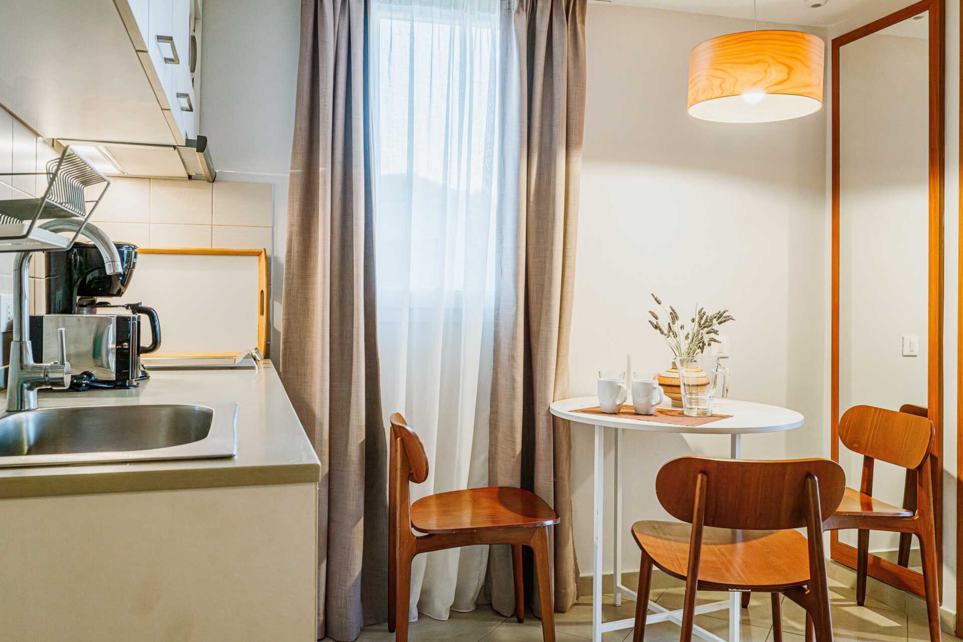 Tweekamerappartement met balkon, sommige met uitzicht op het zwembad. De appartementen bevinden zich in het Olympus-gedeelte van het hotel. De kamers voor maximaal drie personen zijn ongeveer 24-30 vierkante meter, de kamers voor maximaal vier personen ongeveer 32-43 vierkante meter. Slaapkamer en gecombineerde woonkamer met kitchenette. Een tweepersoonsbed. Mogelijkheid voor extra bedden op de slaapbank. Minikeuken met koelkast, kookplaat, waterkoker en eenvoudige keukenapparatuur. Wifi, airconditioning en kluis inbegrepen. TV met internationale zenders. Föhn. Badkamer met douche en wc. Schoonmaak 6 keer/week.