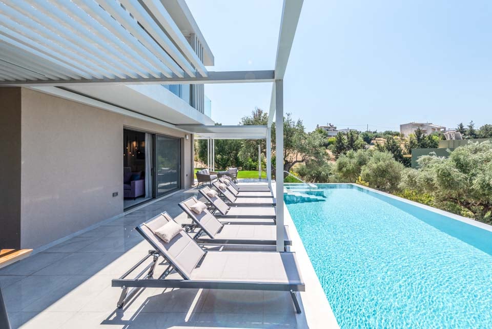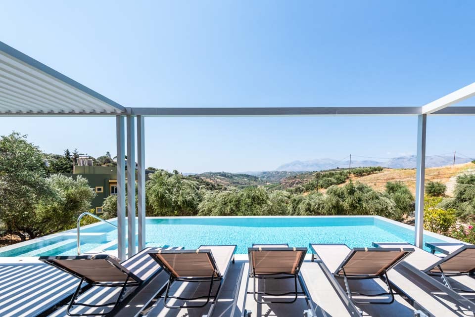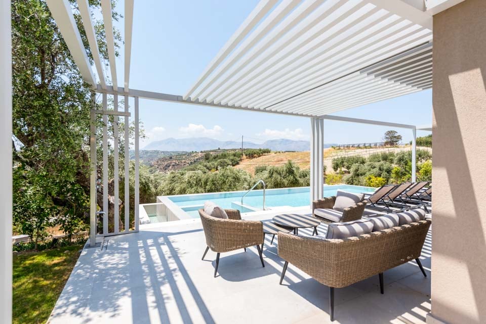 Stap naar buiten en ontdek je eigen privéparadijs. Het overloopzwembad met bubbelbad vormt het middelpunt van de buitenruimte en biedt de perfecte plek om te ontspannen en te genieten van het adembenemende uitzicht op het omliggende landschap. De villa beschikt tevens over een ruim zonneterras met ligstoelen voor ultieme ontspanning, evenals een schaduwrijk eetgedeelte om te genieten van maaltijden met uitzicht.