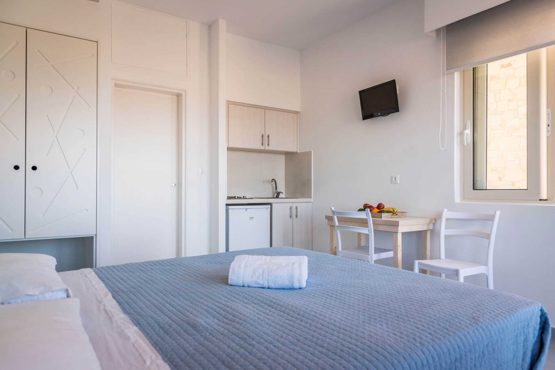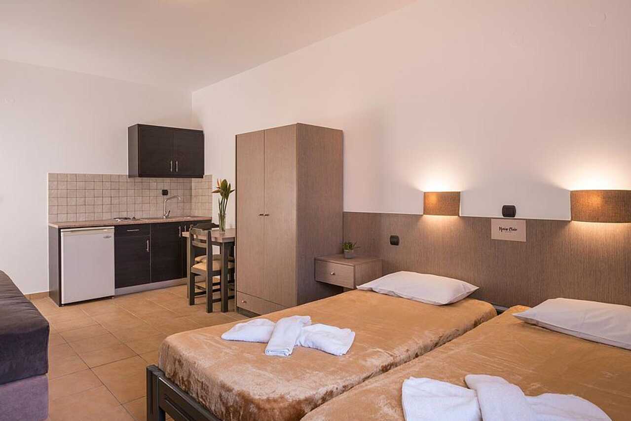 Studio met balkon, sommige met uitzicht op zee of het zwembad of met een terras op de begane grond en uitzicht op zee. Een tweepersoonsbed of twee eenpersoonsbedden. Mogelijkheid voor een extra bed op de slaapbank. Gecombineerde slaapkamer met kitchenette. Minikeuken met kookplaten, koelkast met vriesvak, magnetron, koffiezetapparaat, waterkoker, broodrooster en eenvoudige keukenapparatuur. Wifi en airconditioning inbegrepen. Kluisje tegen betaling. Föhn. Badkamer met douche en toilet. Schoonmaak 6 keer/week.
