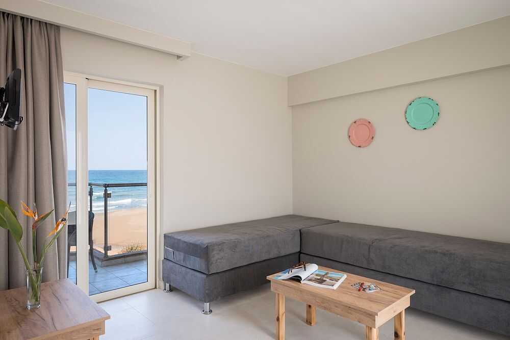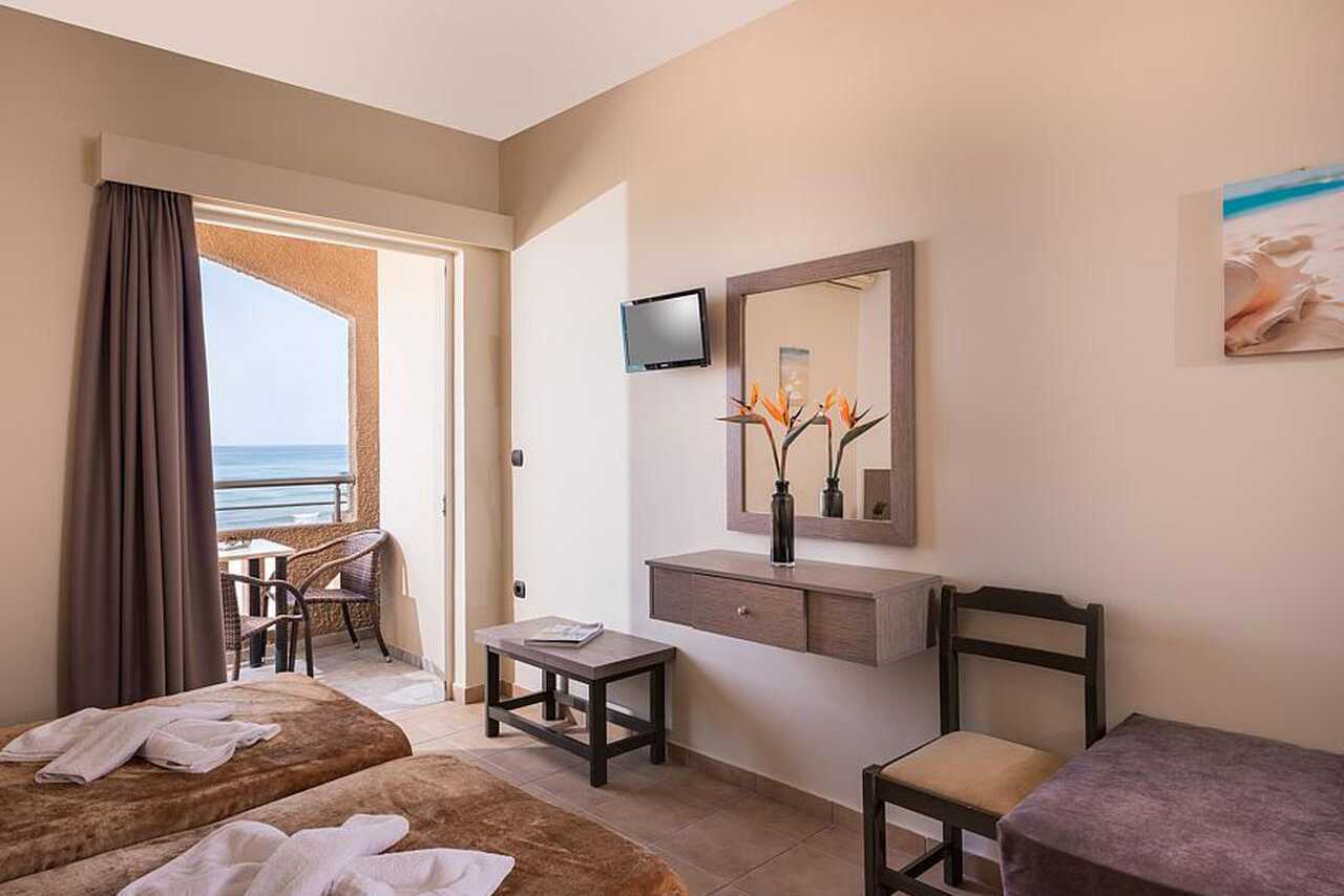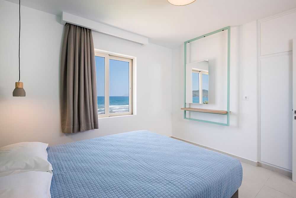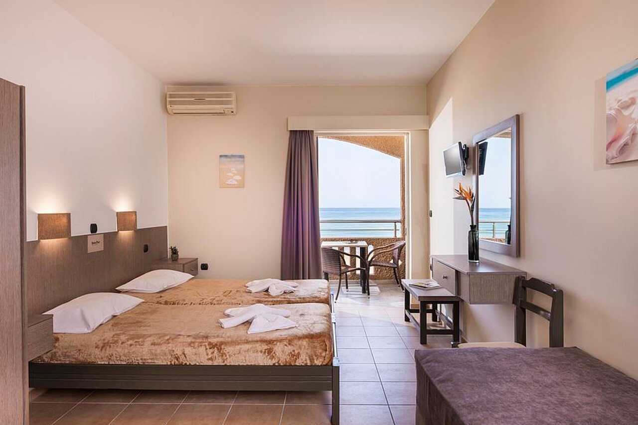 Tweekamerappartementen met balkon en uitzicht op zee. Slaapkamer en gecombineerde woonkamer met kitchenette. Een tweepersoonsbed of twee eenpersoonsbedden. Mogelijkheid voor extra bedden in slaapbank. Minikeuken met kookplaten, koelkast met vriesvak, magnetron, koffiezetapparaat, waterkoker, broodrooster en eenvoudige keukenapparatuur. Wifi en airconditioning inbegrepen. Kluisje tegen betaling. Föhn. Badkamer met douche en toilet. Schoonmaak 6 keer/week.