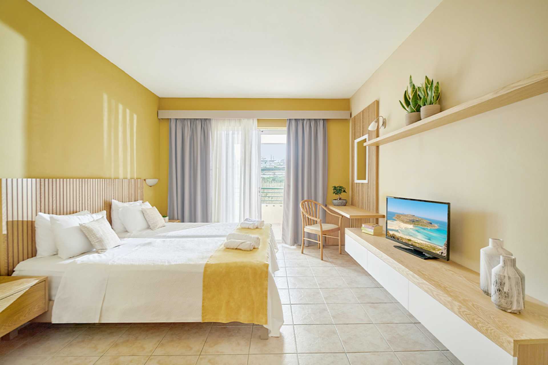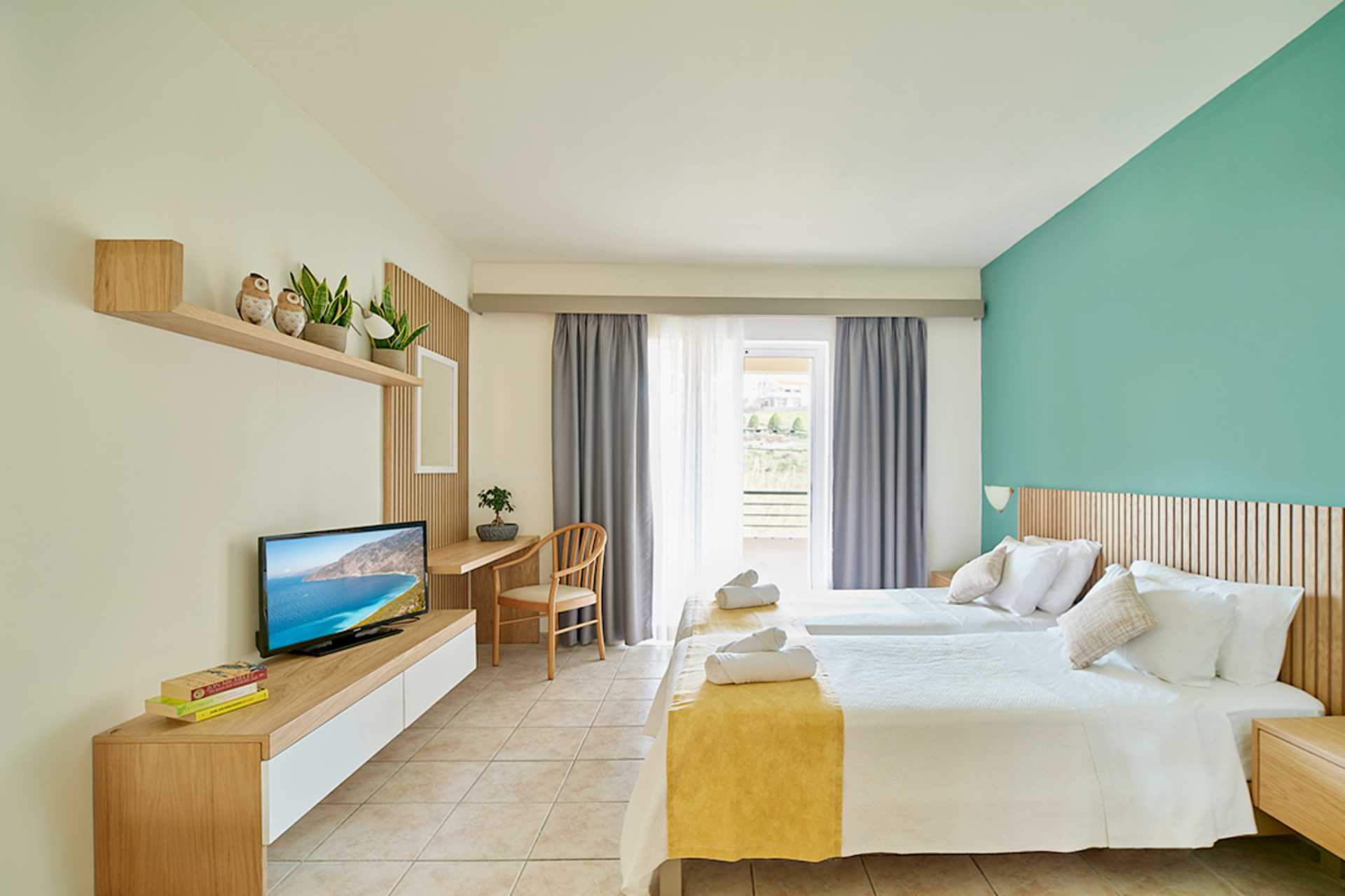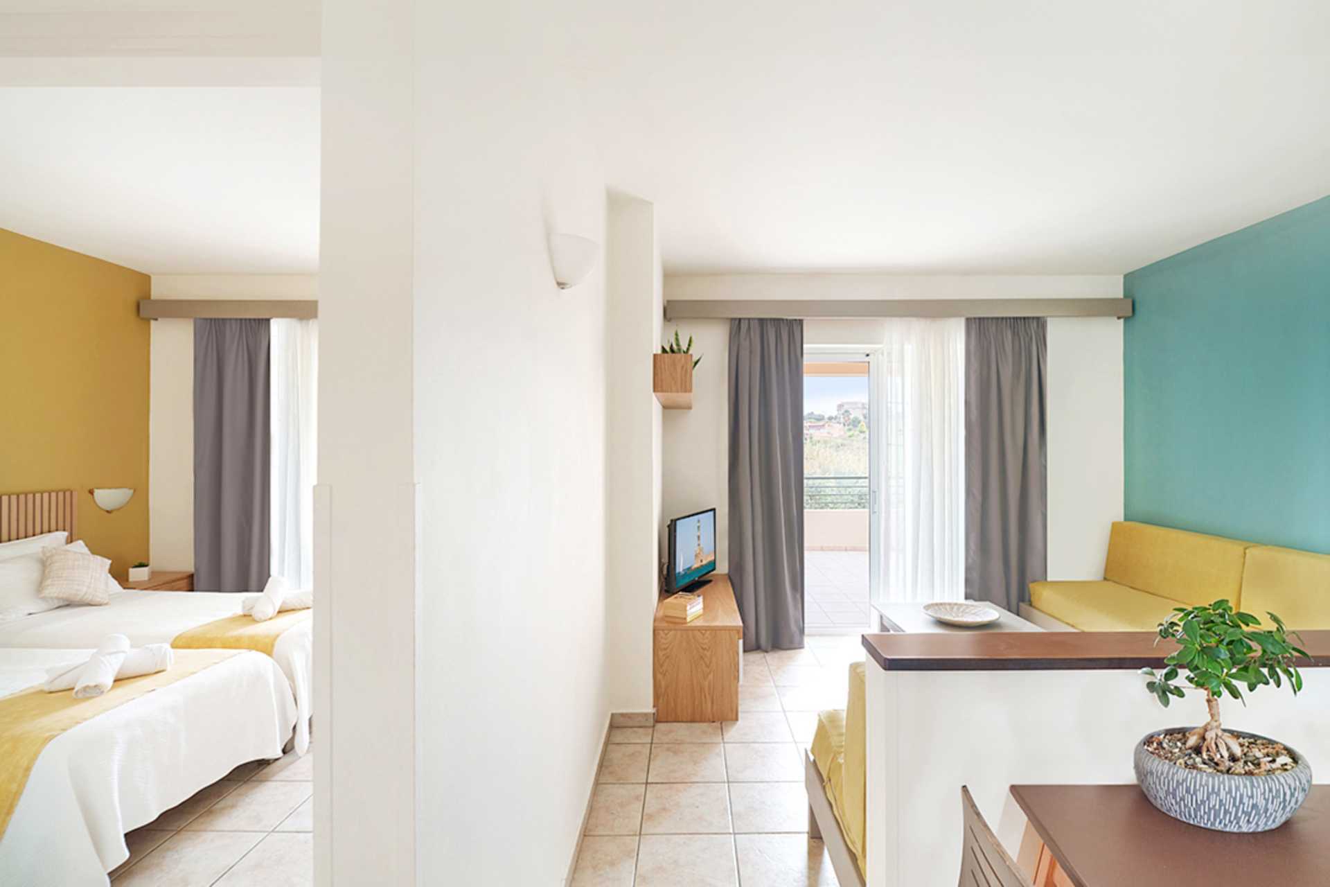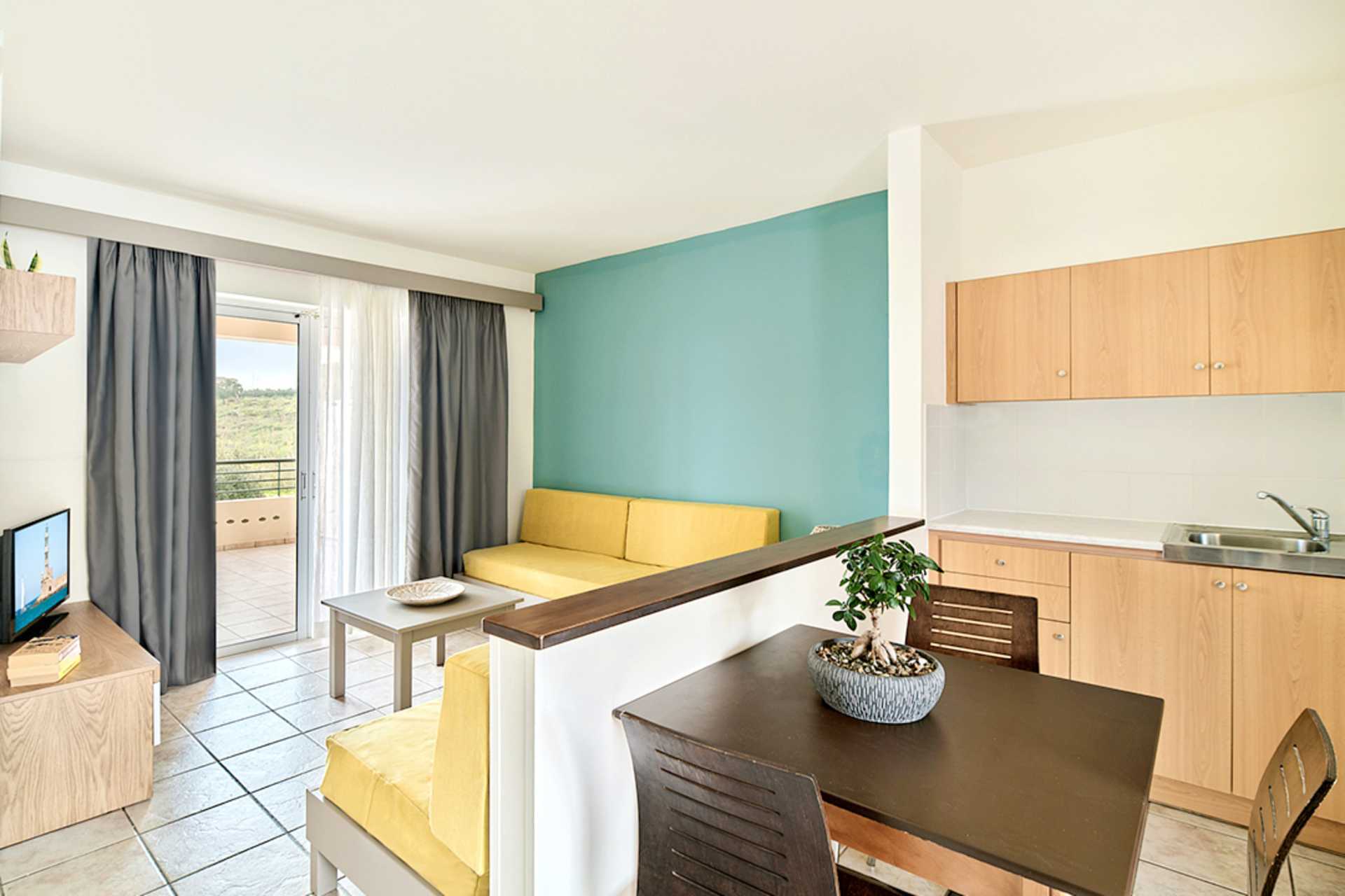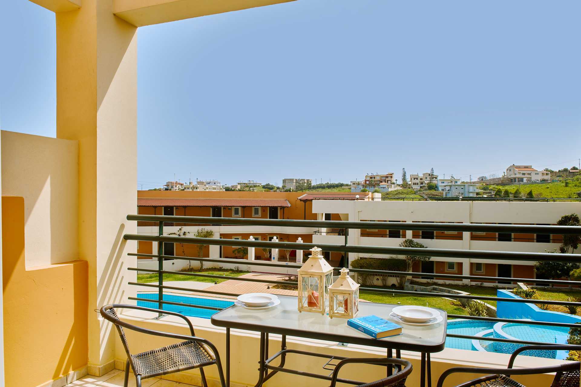 Driekamerappartement met balkon, sommige met uitzicht op het zwembad. Twee slaapkamers en een gecombineerde woonkamer/keuken. Twee eenpersoonsbedden in elke slaapkamer. Mogelijkheid voor extra bed op slaapbank met uitschuifbaar bed. Sommige appartementen hebben niveauverschillen met enkele treden. Minikeuken met kookplaten, koelkast met vriesvak, magnetron, koffiezetapparaat, waterkoker, broodrooster en eenvoudige keukenapparatuur. Wifi, airconditioning en kluis inbegrepen. TV met internationale zenders. Föhn. Badkamer met bad of douche en toilet. Schoonmaak 6 keer/week.