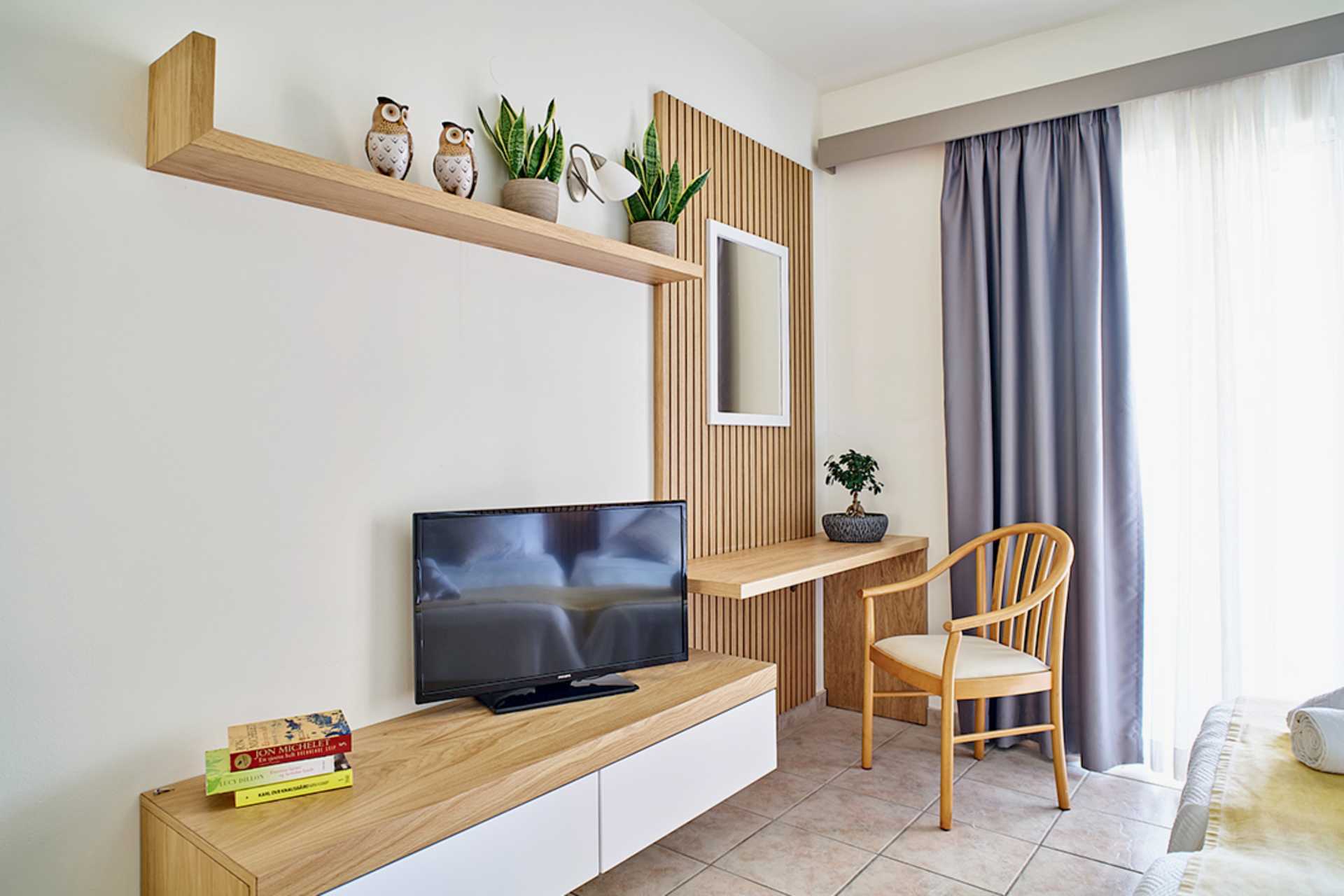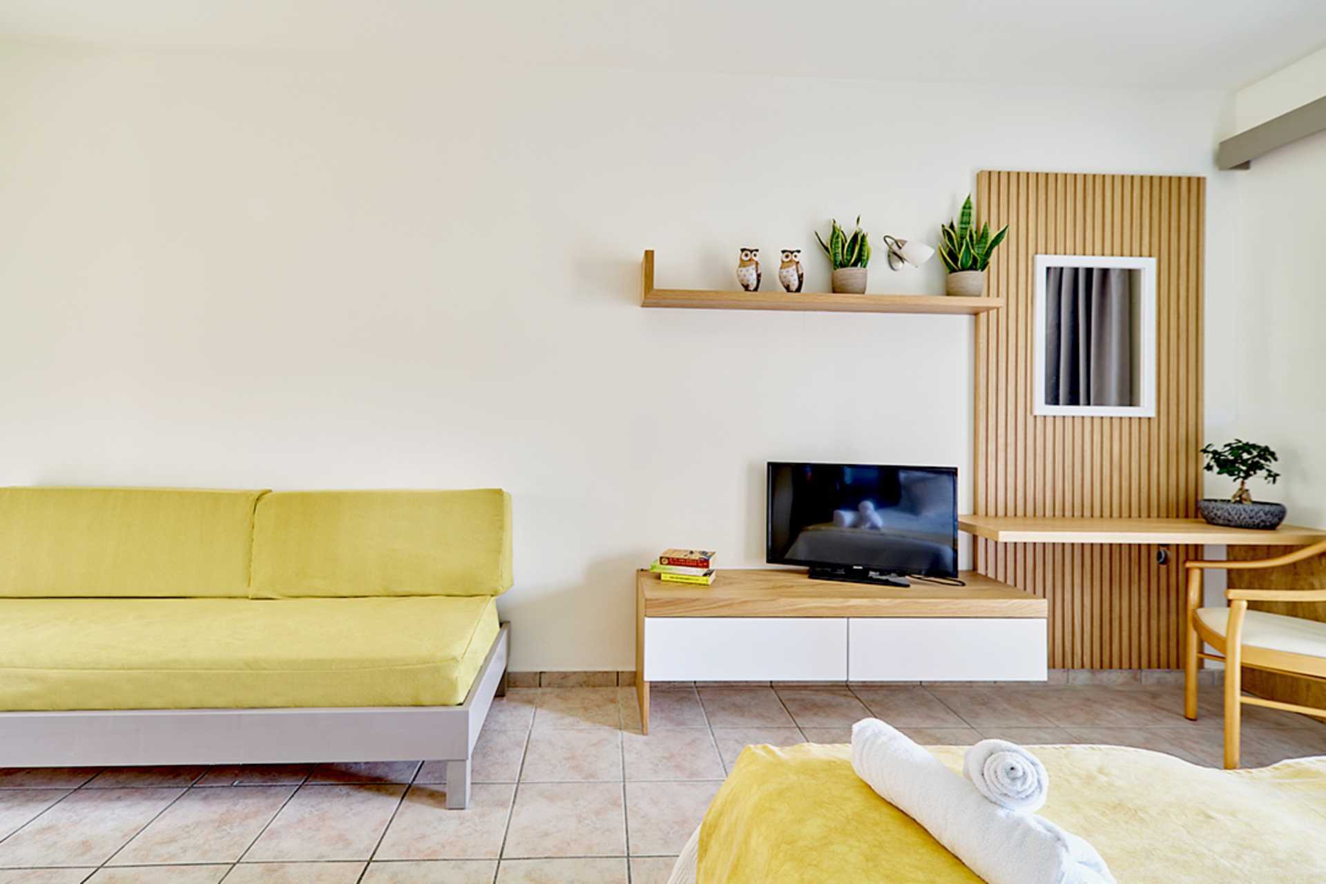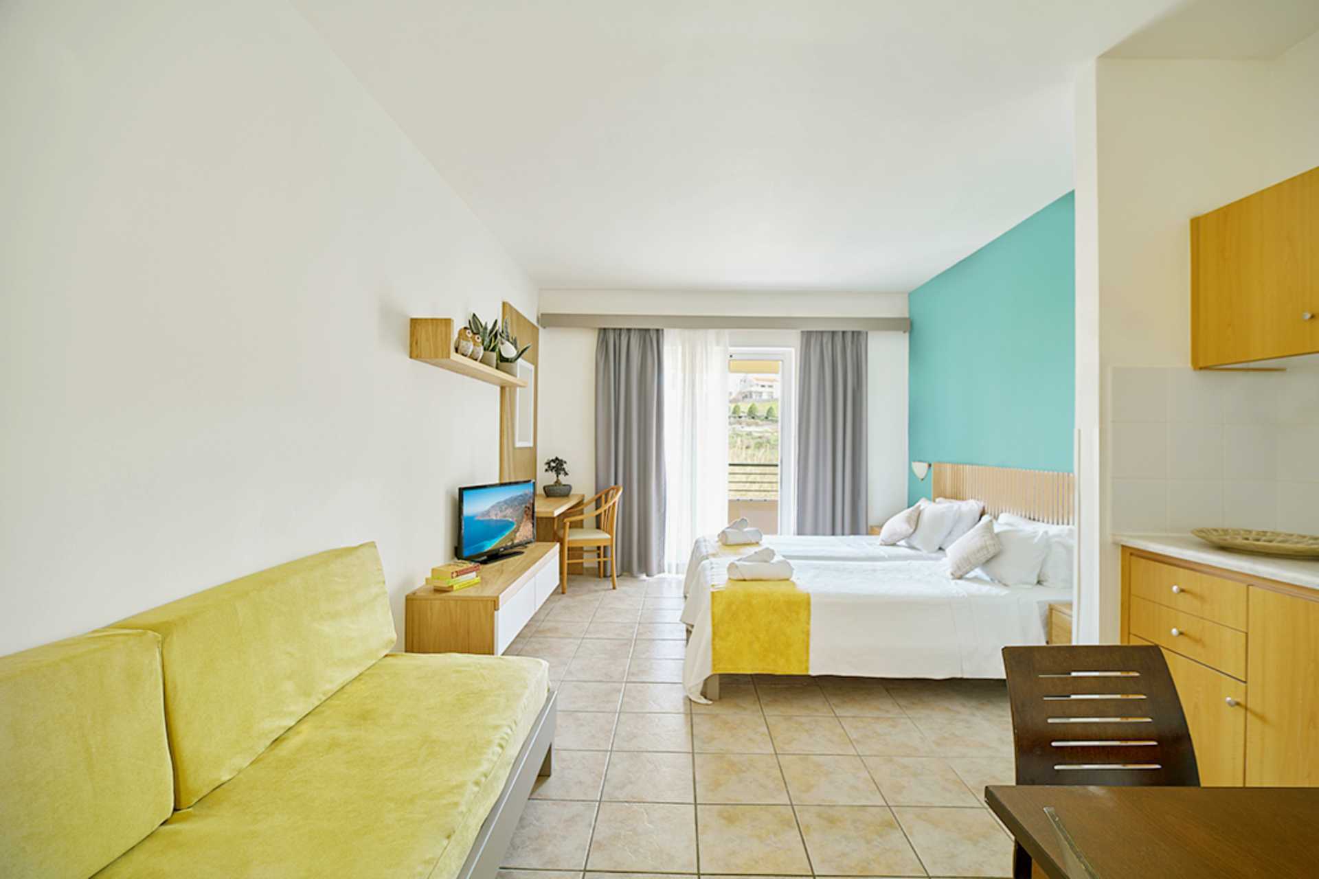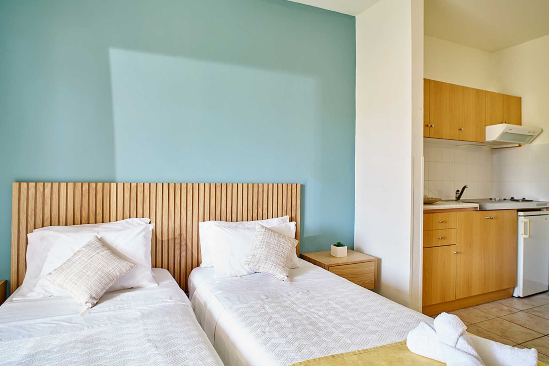 Studio met balkon of terras, sommige met uitzicht op het zwembad. Gecombineerde slaapkamer met kitchenette. In sommige appartementen zijn er enkele treden. Twee eenpersoonsbedden. Mogelijkheid voor een extra bed op de slaapbank. Minikeuken met kookplaten, koelkast met vriesvak, magnetron, koffiezetapparaat, waterkoker, broodrooster en eenvoudige keukenapparatuur. Wifi, airconditioning en kluis inbegrepen. TV met internationale zenders. Föhn. Badkamer met douche en toilet. Schoonmaak 6 keer/week.