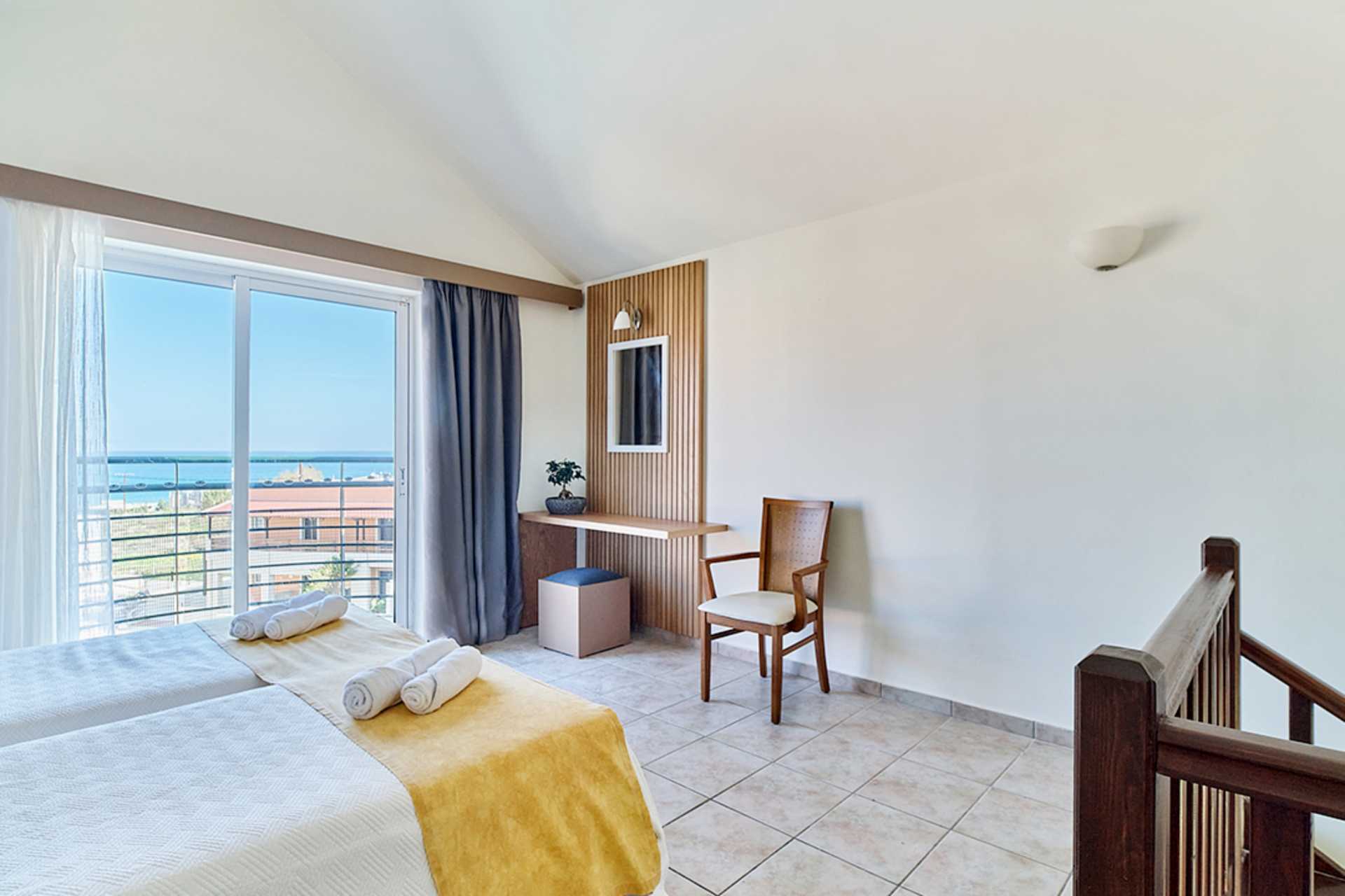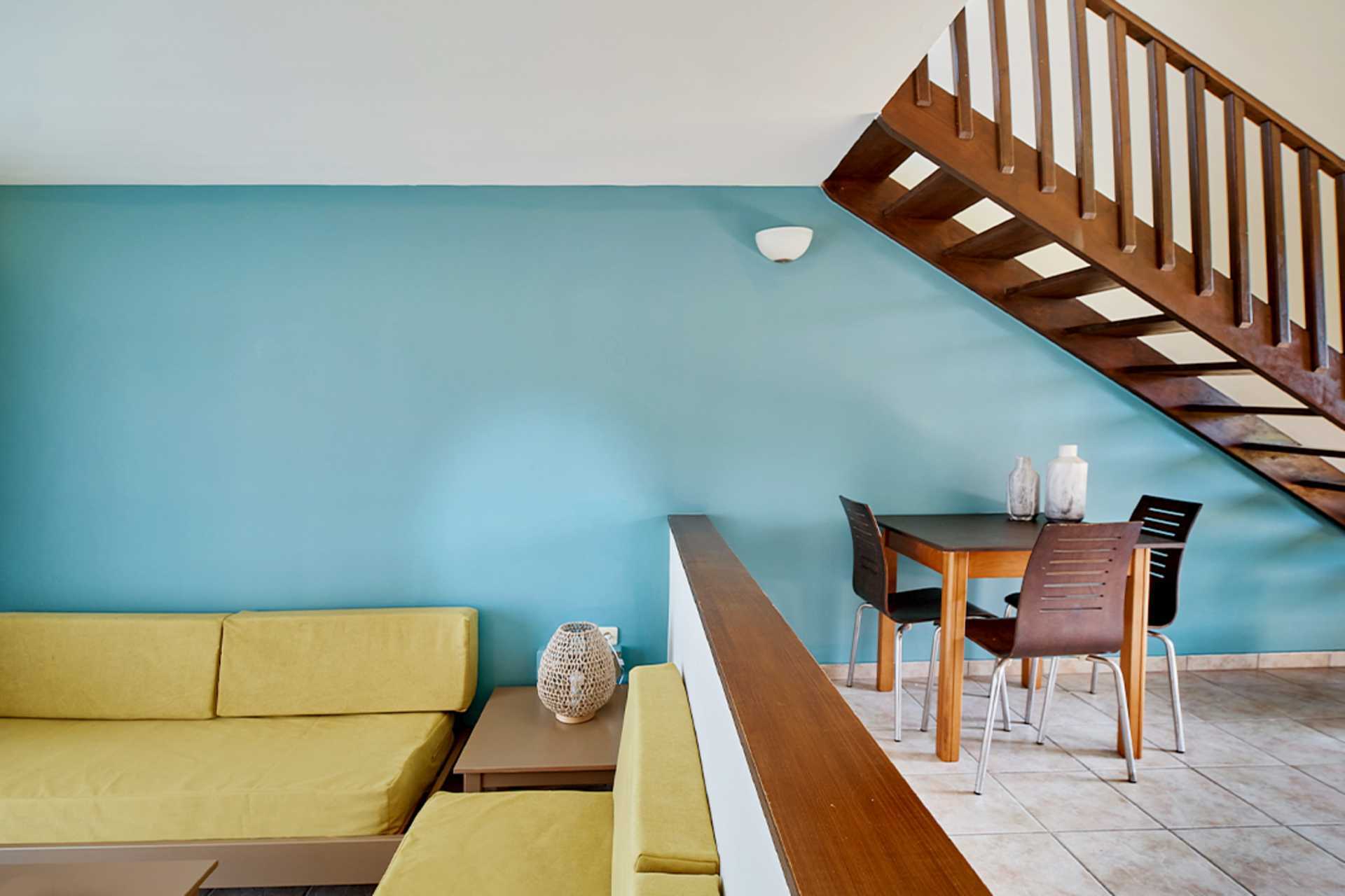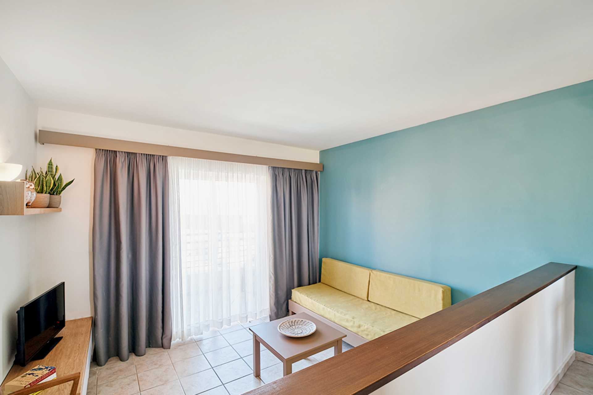Tweekamerappartement met balkon, sommige met uitzicht op het zwembad. Op de begane grond bevindt zich de woonkamer met twee slaapbanken, een minikeuken en een badkamer met haardroger, bad of douche en toilet en een balkon. Boven is er een vide met twee eenpersoonsbedden, een badkamer met föhn, bad of douche, toilet en een balkon. Open plattegrond tussen verdiepingen. Wifi, airconditioning en kluisje inbegrepen. Minikeuken met kookplaten, koelkast met vriesvak, magnetron, koffiezetapparaat, waterkoker, broodrooster en eenvoudige keukenapparatuur. Tv met internationale zenders. Schoonmaak 6 keer/week.