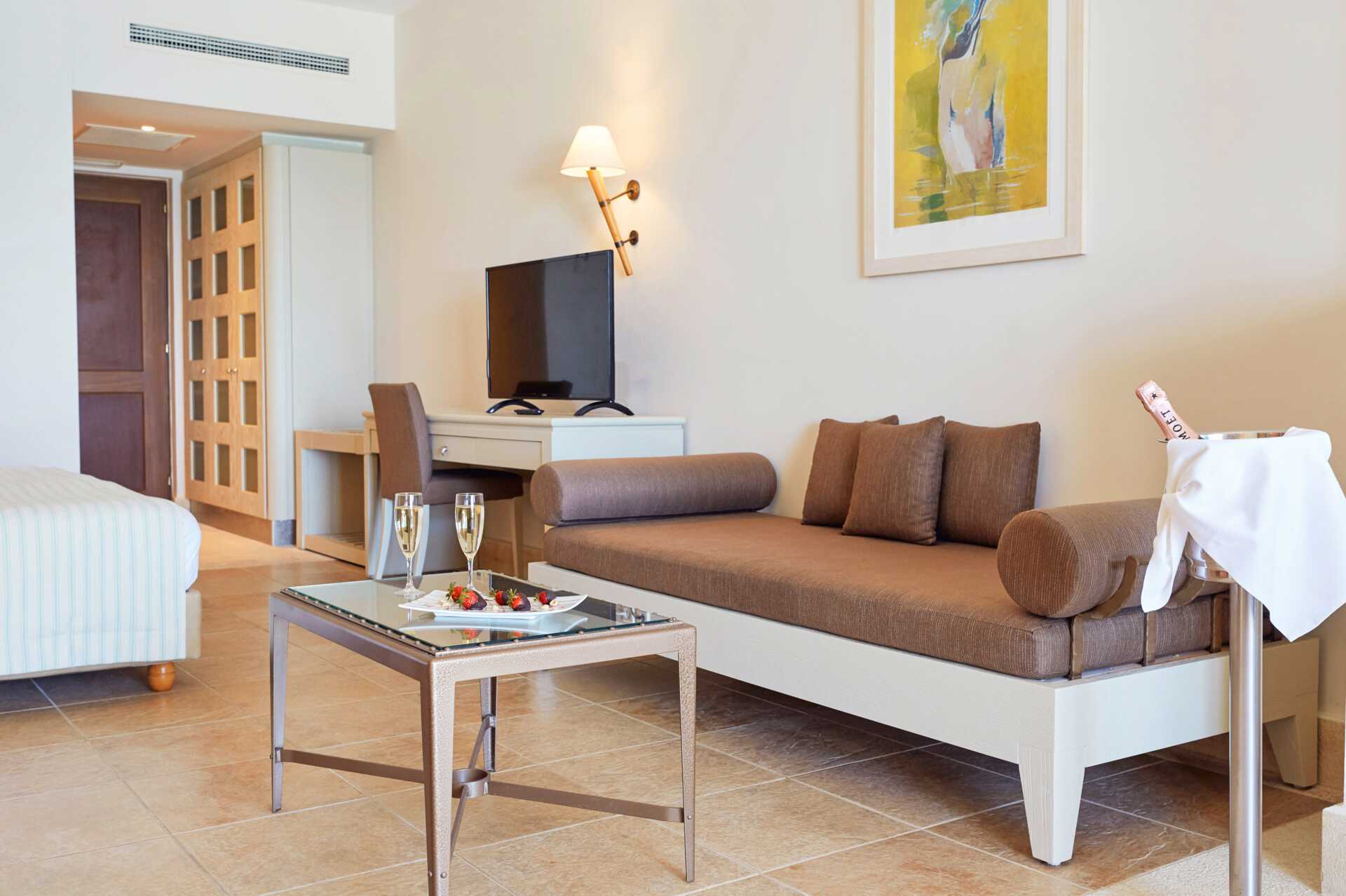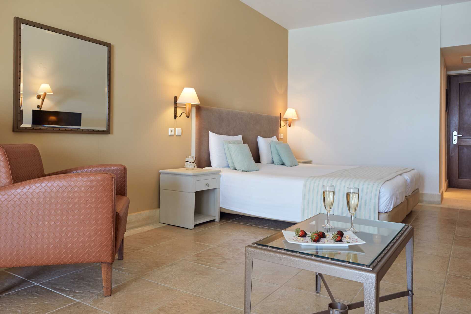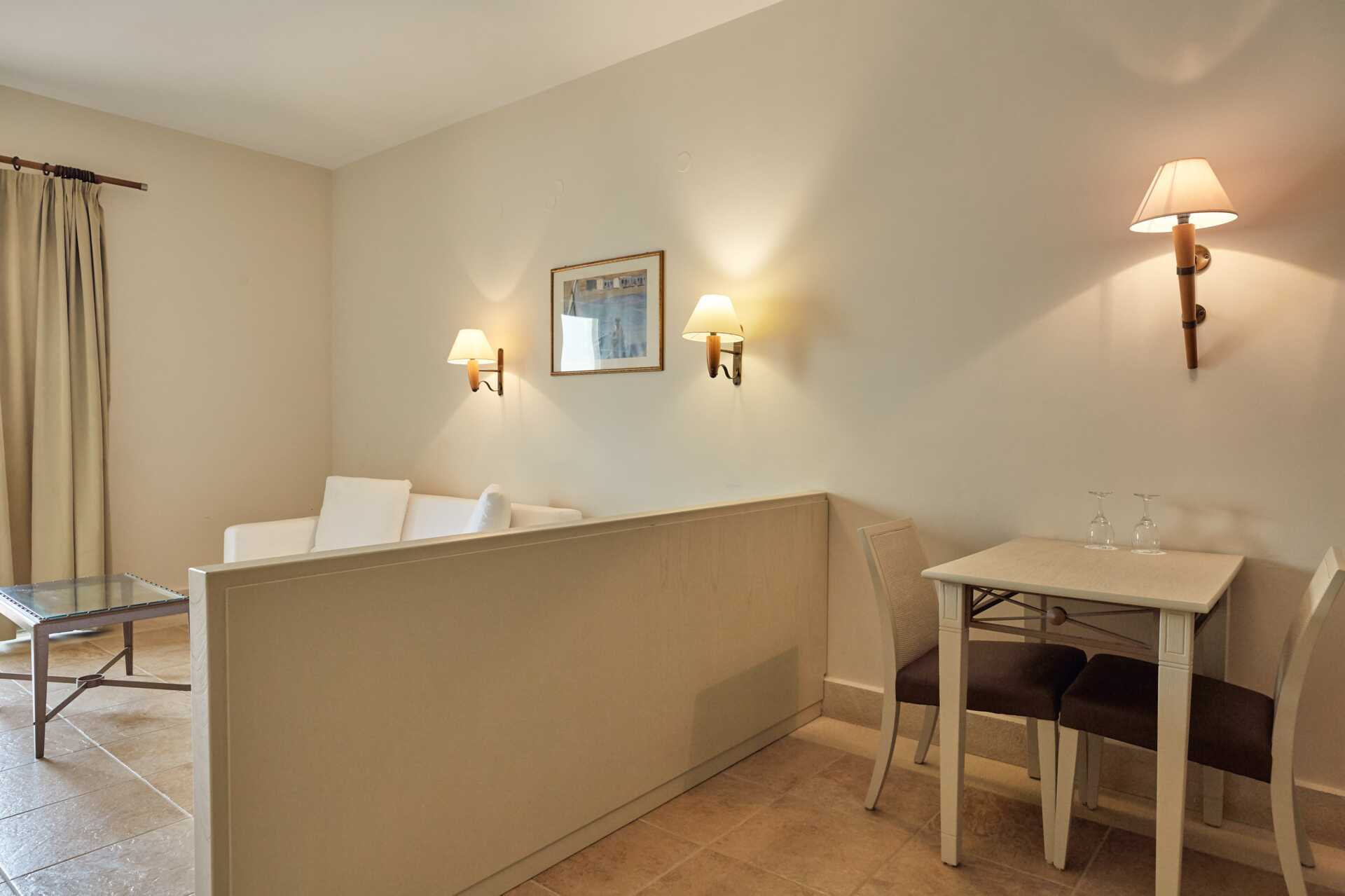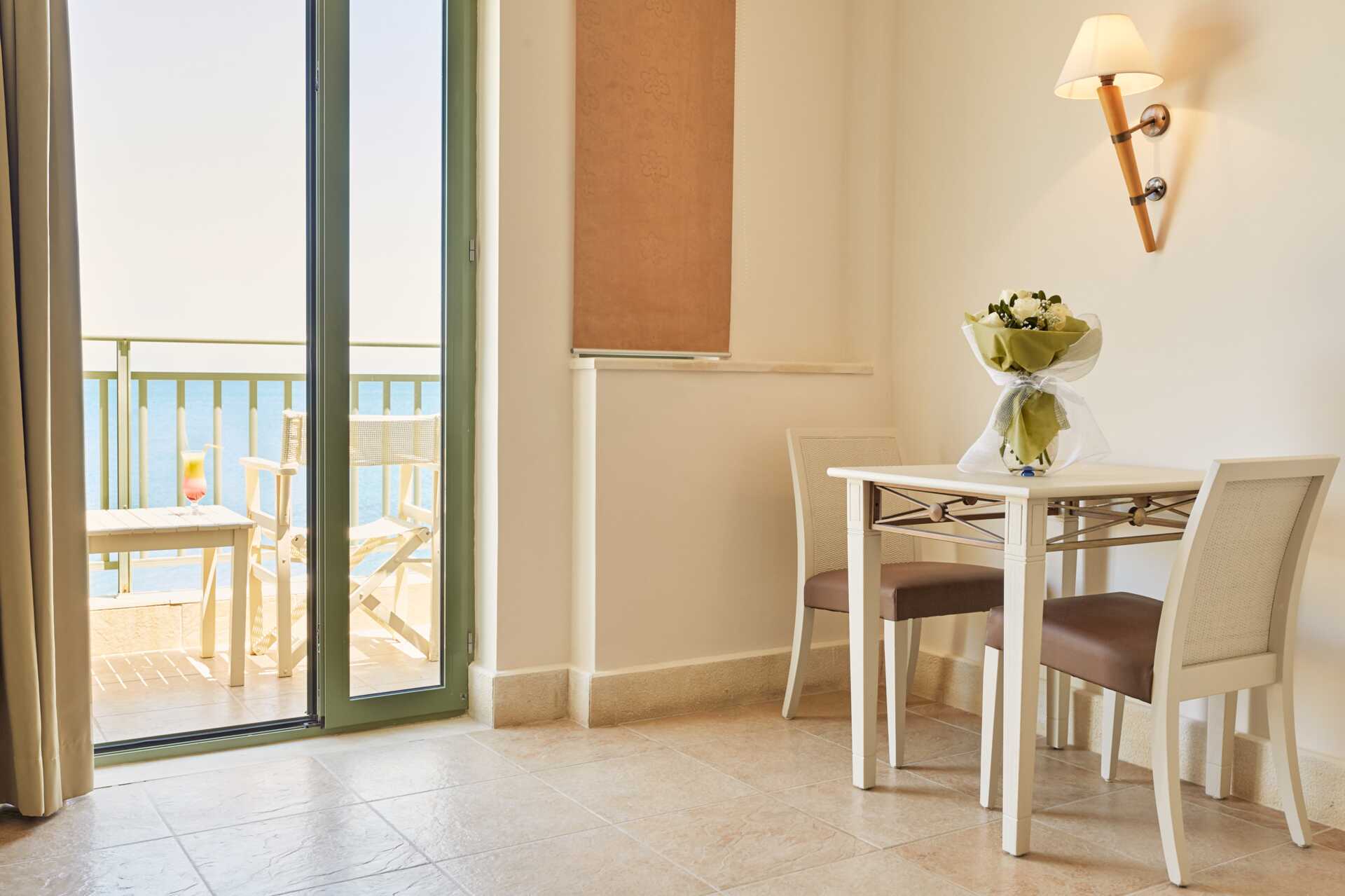 Junior suites met terras op de grond met directe toegang tot het zwembad en uitzicht op zee. Er zijn een paar treden naar het terras. Ligbedden en parasols op de patio. Een tweepersoonsbed of twee eenpersoonsbedden. Mogelijkheid voor een extra bed in de slaapbank. Er is ook een salontafel en een kleine keukentafel met een paar stoelen in de kamer. Wifi, centrale airconditioning en een kluis inbegrepen. Minibar tegen betaling. Espressomachine - capsules inbegrepen en dagelijks aangevuld. Tv met internationale zenders. Badjassen en hotelslippers. Föhn. Badkamer met bad of douche en toilet. Schoonmaak 7 keer/week.
