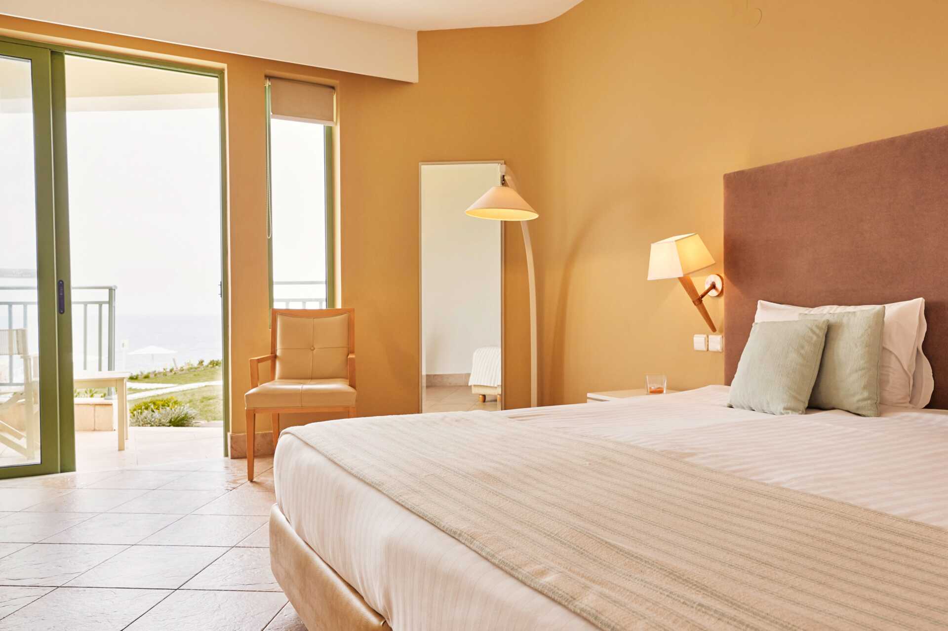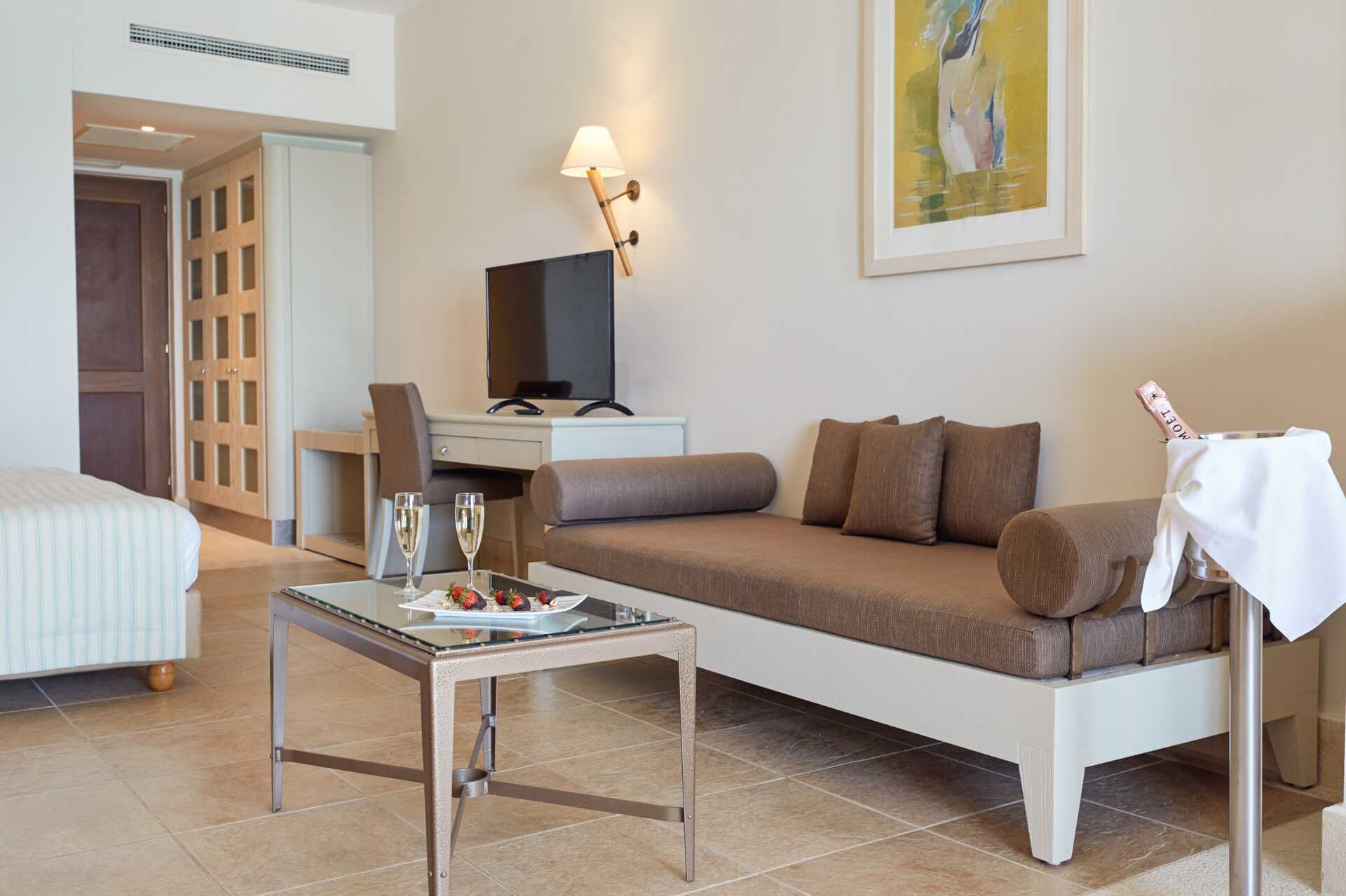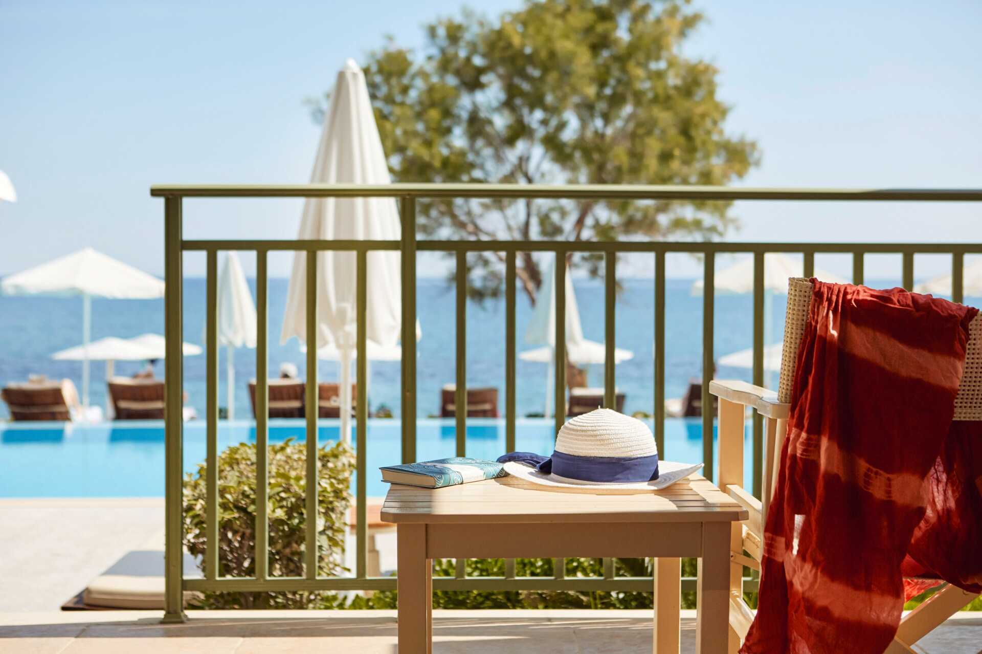Junior suites met terras op de grond met directe toegang tot het zwembad en uitzicht op zee. Er zijn een paar treden naar het terras. Ligbedden en parasols op de patio. Een tweepersoonsbed of twee eenpersoonsbedden. Mogelijkheid voor een extra bed in de slaapbank. Er is ook een salontafel en een kleine keukentafel met een paar stoelen in de kamer. Wifi, centrale airconditioning en een kluis inbegrepen. Minibar tegen betaling. Espressomachine - capsules inbegrepen en dagelijks aangevuld. Tv met internationale zenders. Badjassen en hotelslippers. Föhn. Badkamer met bad of douche en toilet. Schoonmaak 7 keer/week.