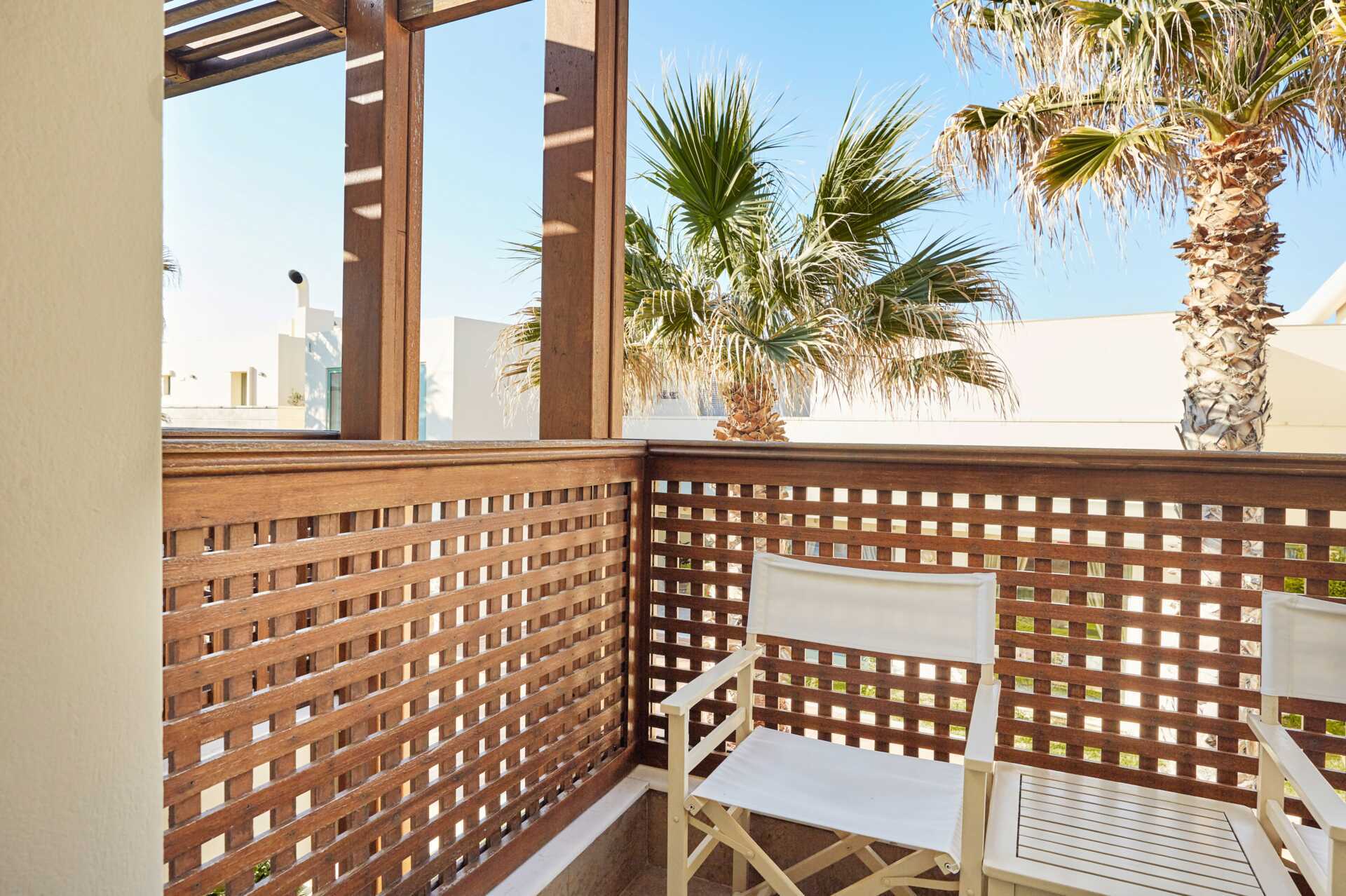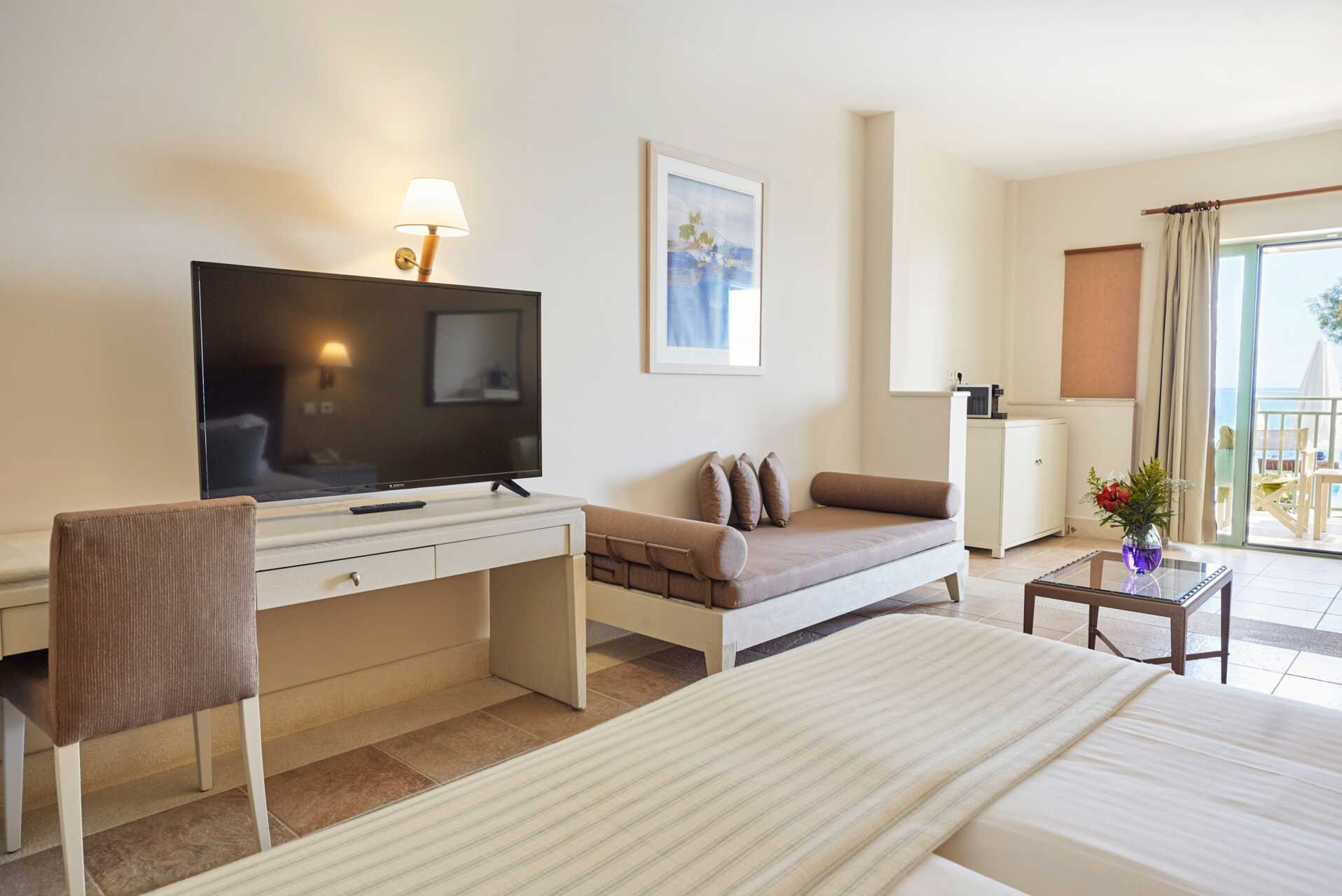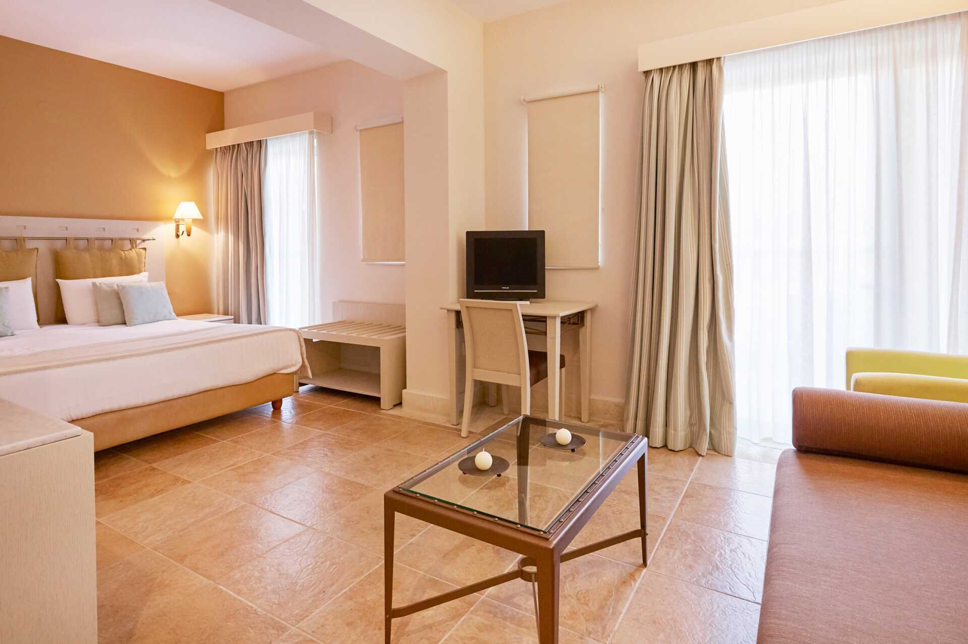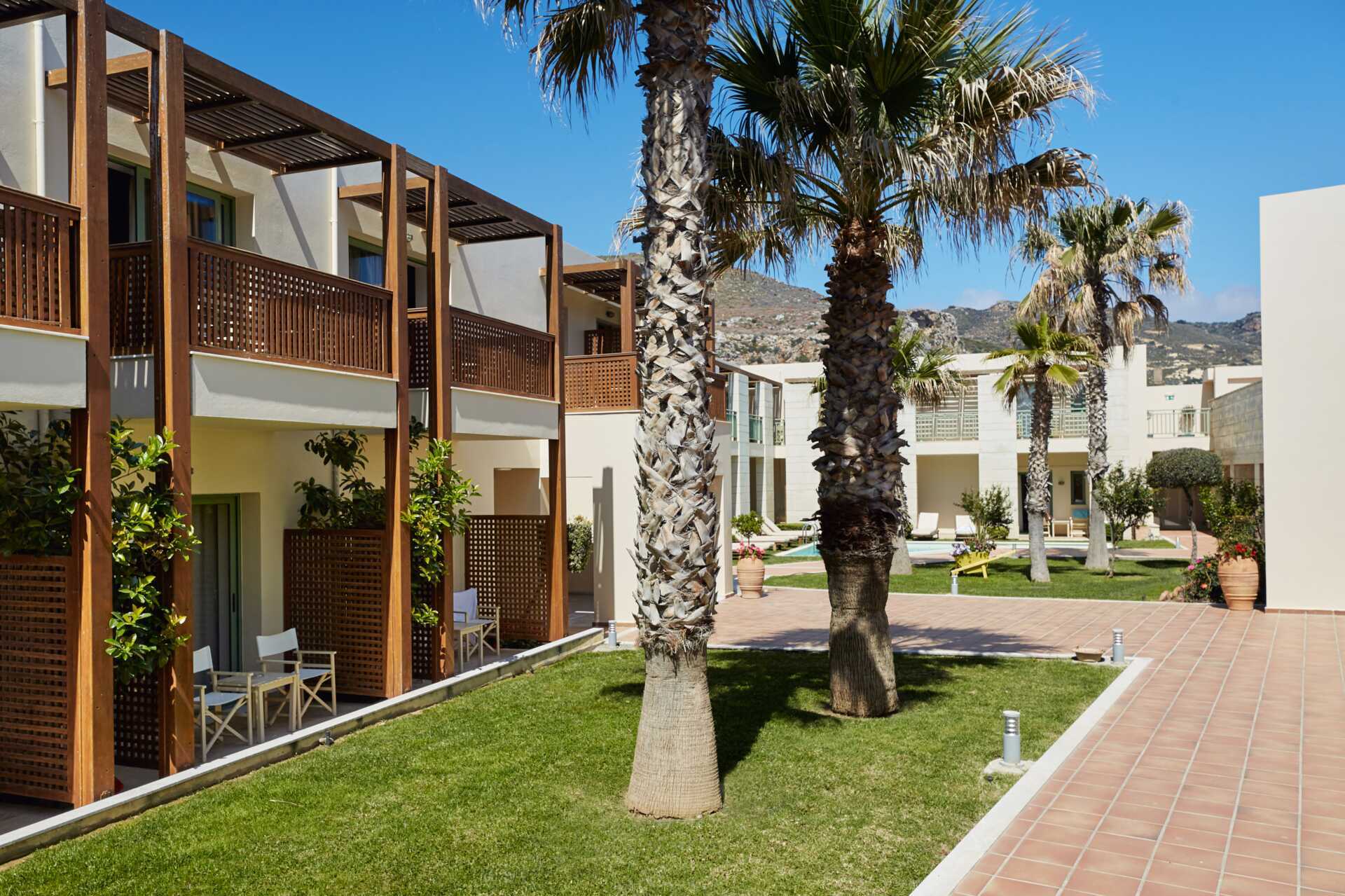 Junior suites met terras op de grond met directe toegang tot het zwembad en uitzicht op zee. Er zijn een paar treden naar het terras. Ligbedden en parasols op de patio. Een tweepersoonsbed of twee eenpersoonsbedden. Mogelijkheid voor een extra bed in de slaapbank. Er is ook een salontafel en een kleine keukentafel met een paar stoelen in de kamer. Wifi, centrale airconditioning en een kluis inbegrepen. Minibar tegen betaling. Espressomachine - capsules inbegrepen en dagelijks aangevuld. Tv met internationale zenders. Badjassen en hotelslippers. Föhn. Badkamer met bad of douche en toilet. Schoonmaak 7 keer/week.