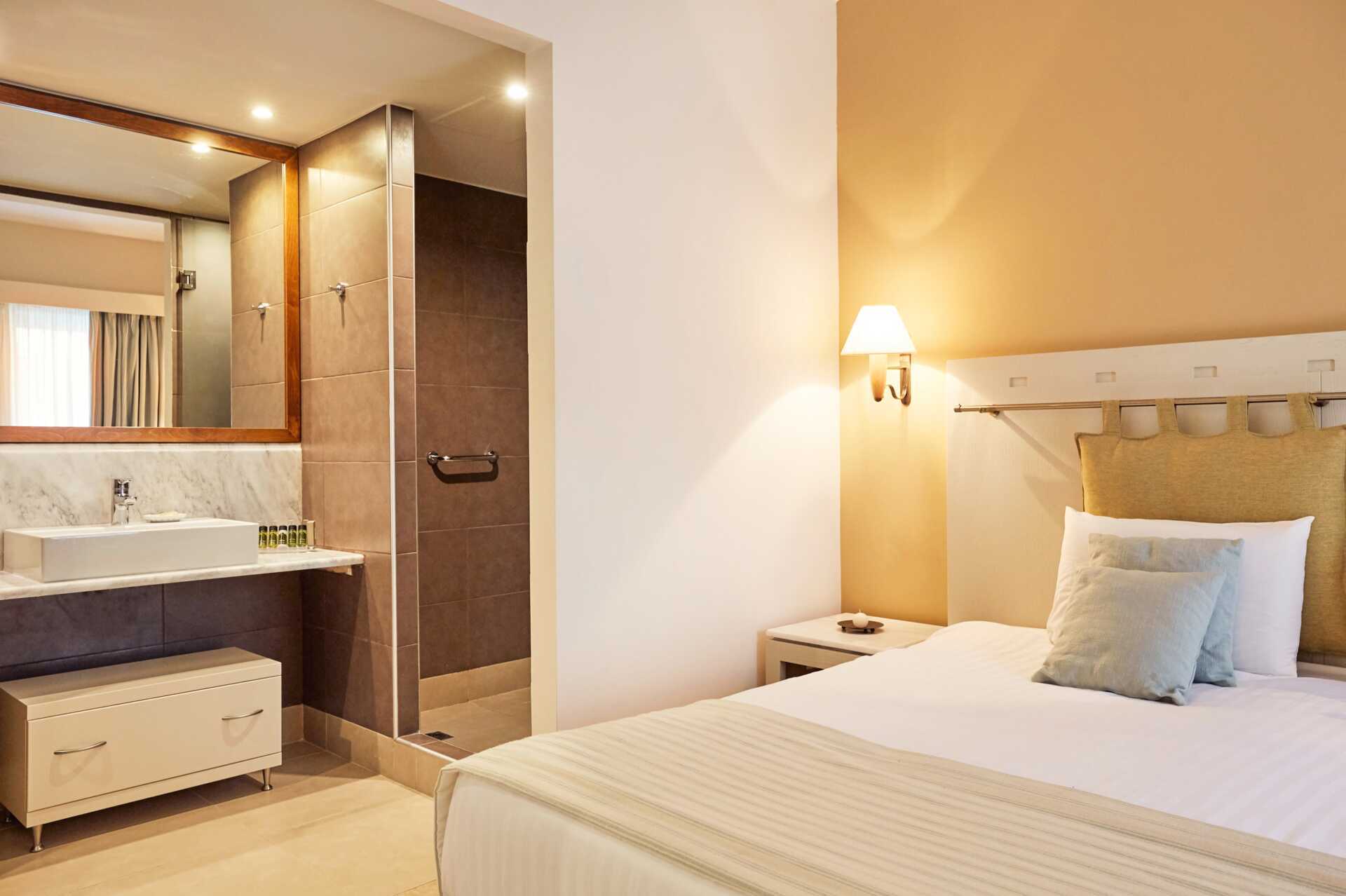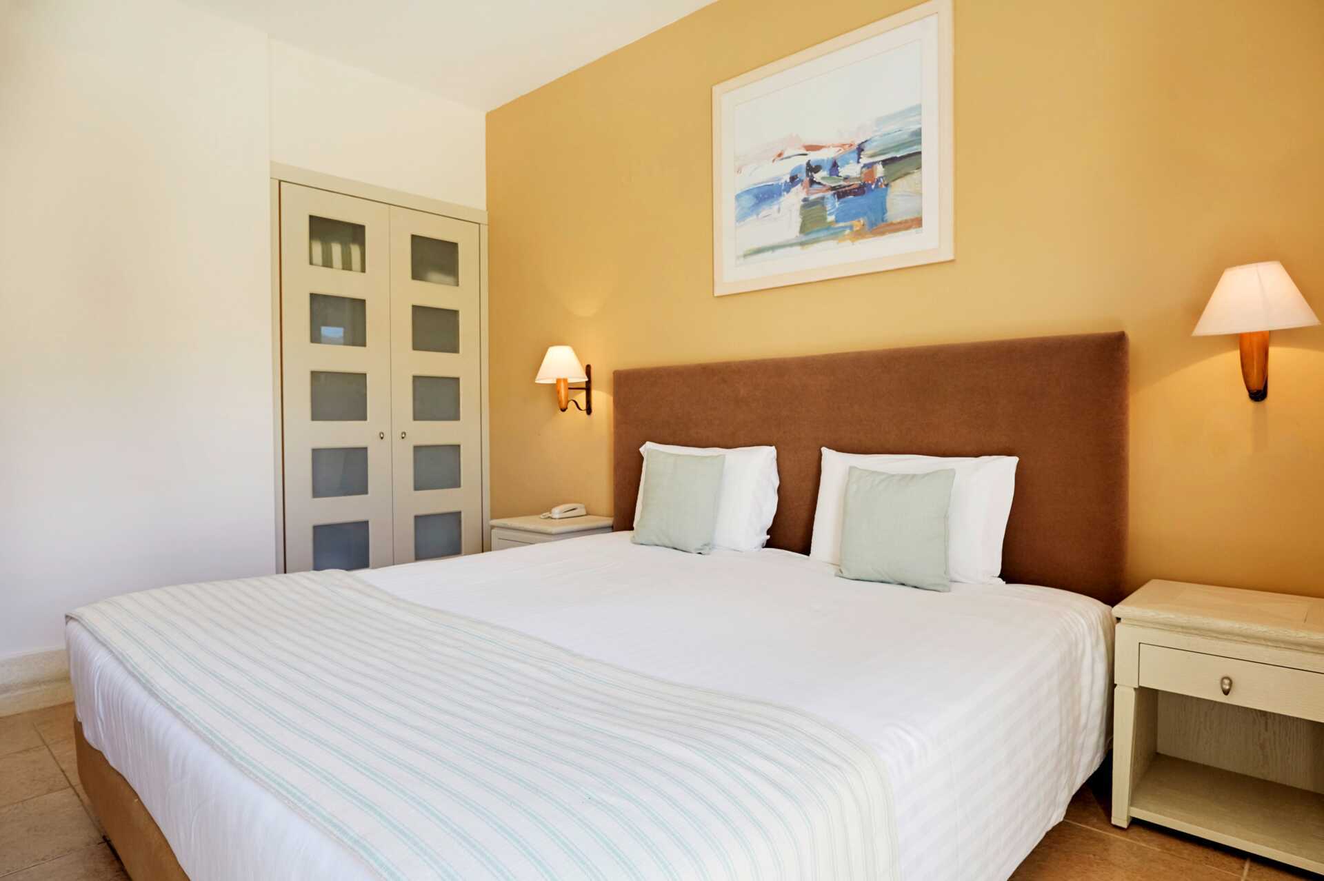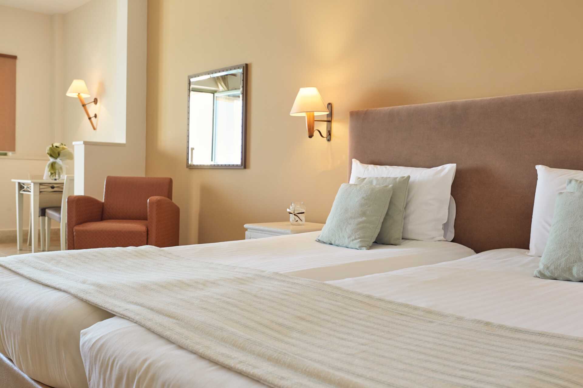 Tweepersoonskamer met grondterras met uitzicht op gedeeld zwembad, sommige met uitzicht op zee. Ligstoelen en parasols op de patio. Enkele treden omhoog naar het grondterras. Een tweepersoonsbed of twee eenpersoonsbedden. Wifi, centrale airconditioning en kluisje inbegrepen. Minibar tegen betaling. Espressomachine - capsules inbegrepen en dagelijks bijgevuld. Tv met internationale zenders. Badjassen en hotelslippers. Föhn. Badkamer met bad of douche en toilet. Schoonmaak 7 keer / week.