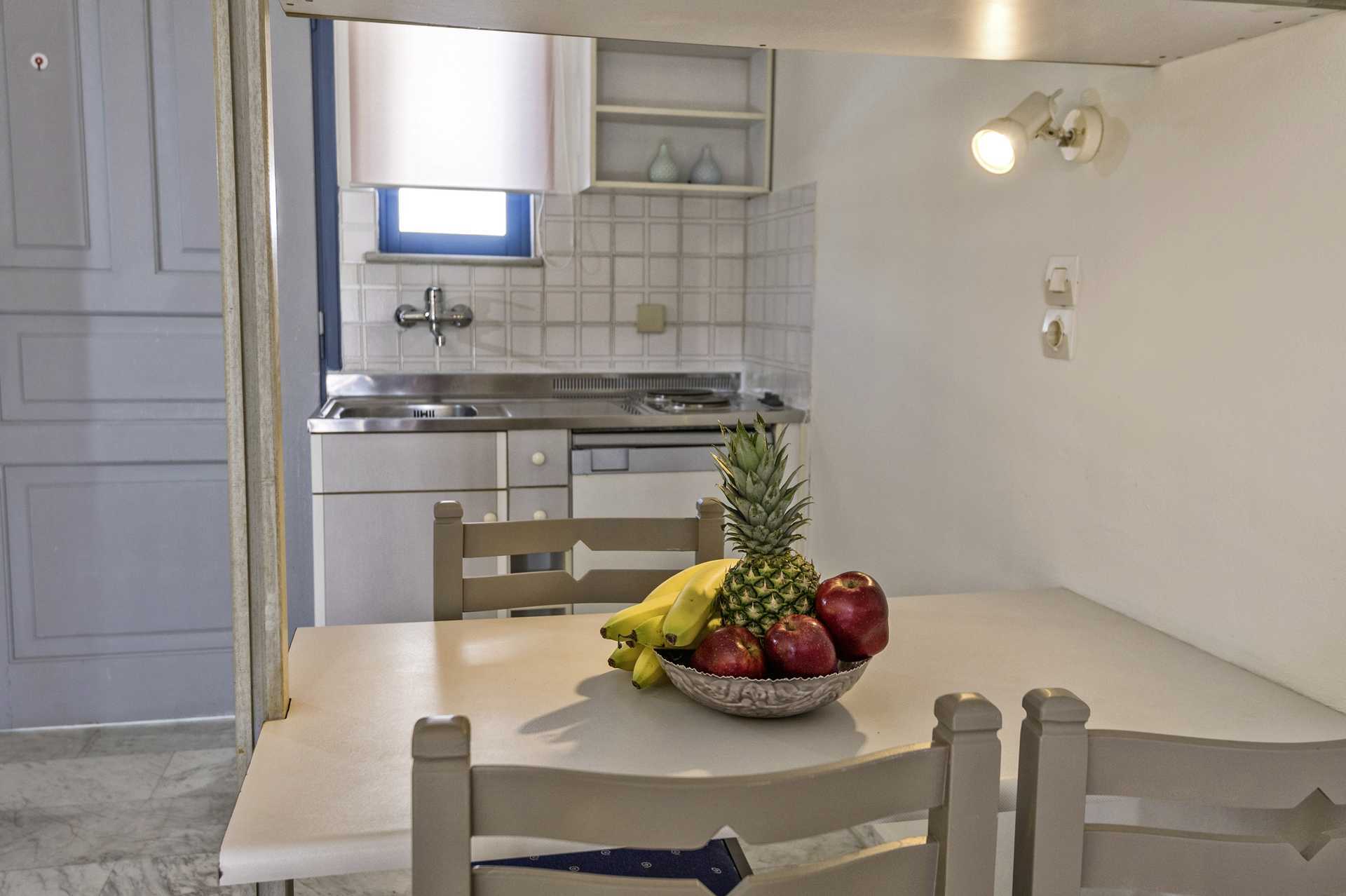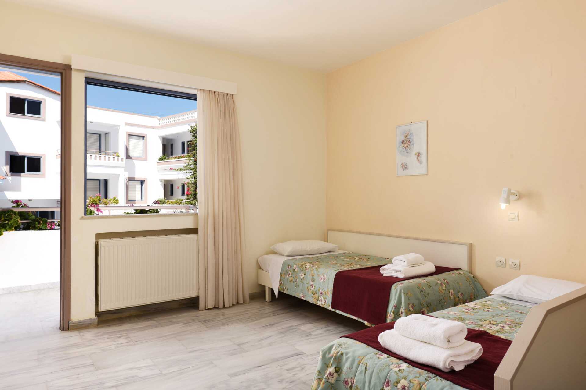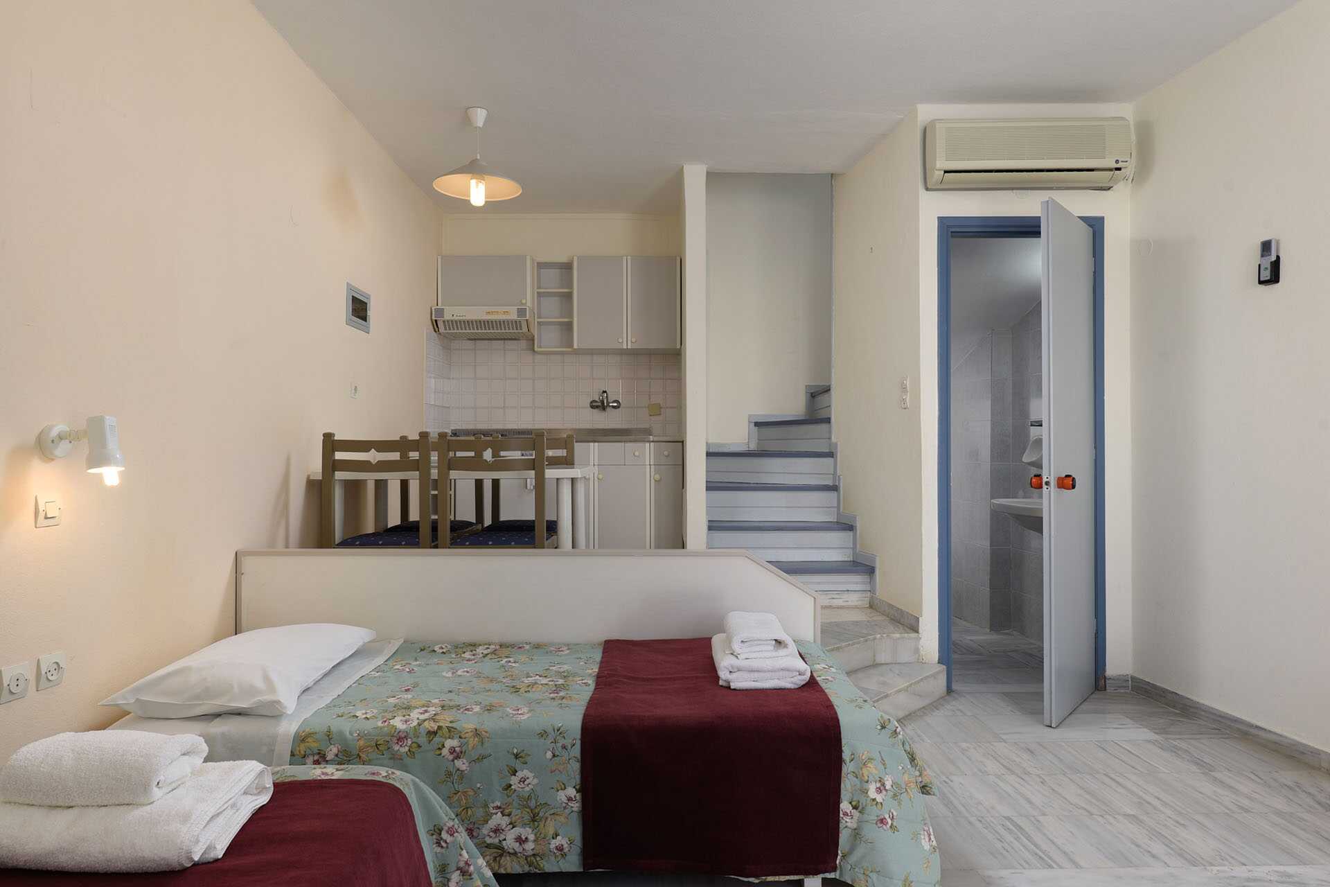 Tweekamerappartement met balkon of terras. Slaapkamer en gecombineerde woonkamer met kitchenette. Twee eenpersoonsbedden. Mogelijkheid voor extra bedden in slaapbank. Minikeuken met kookplaten, koelkast, waterkoker en eenvoudige keukenapparatuur. Wifi en airconditioning inbegrepen. Kluis tegen betaling. TV met internationale zenders. Föhn. Badkamer met douche en wc. Schoonmaak 6 keer/week.
