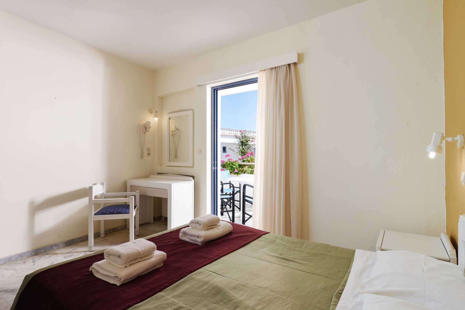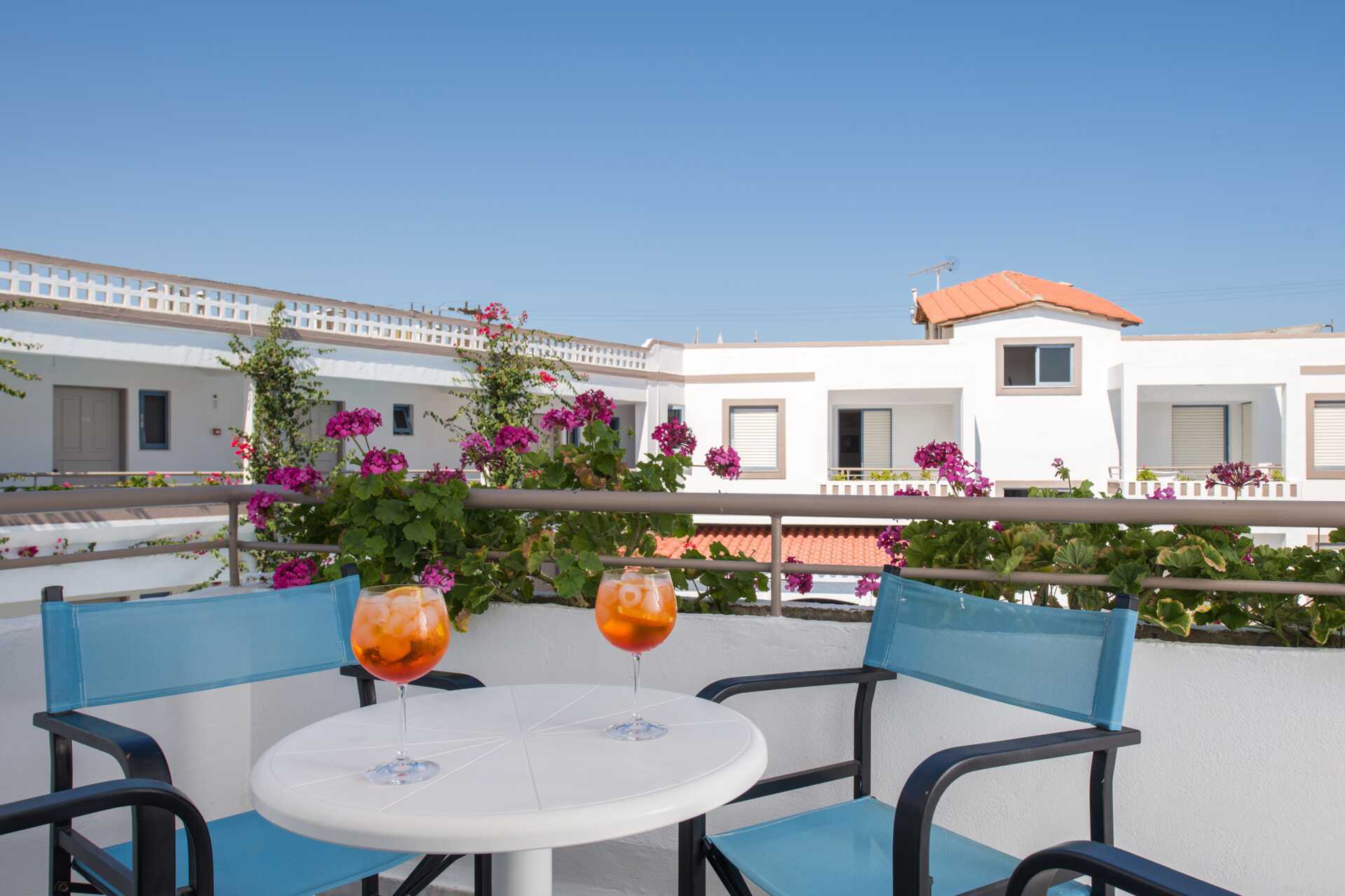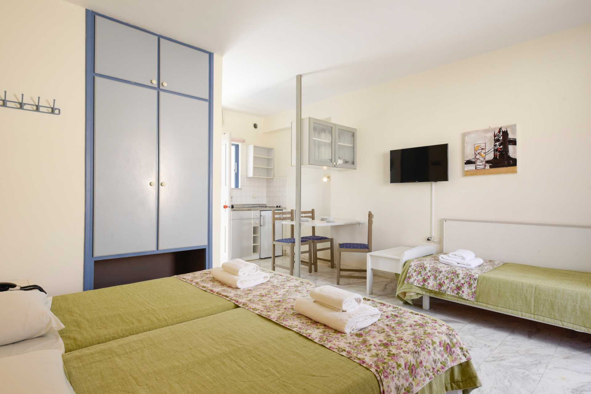 Studio met balkon of terras. Gecombineerde slaapkamer met kitchenette. Twee eenpersoonsbedden. Mogelijkheid voor een extra bed op de slaapbank. Minikeuken met kookplaten, koelkast, waterkoker en eenvoudige keukenapparatuur. Wifi en airconditioning inbegrepen. Kluis tegen betaling. TV met internationale zenders. Föhn. Badkamer met douche en wc. Schoonmaak 6 keer/week.