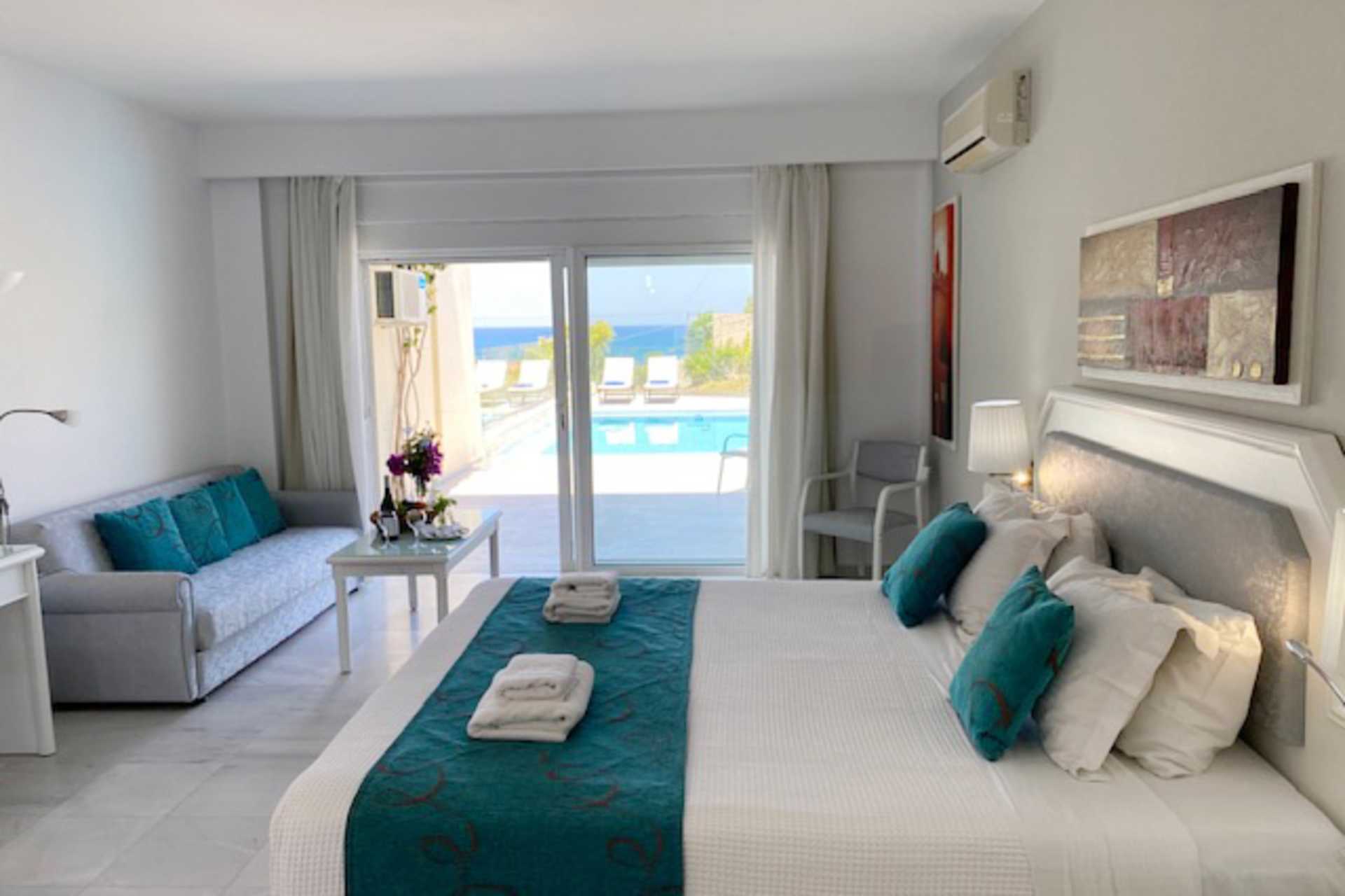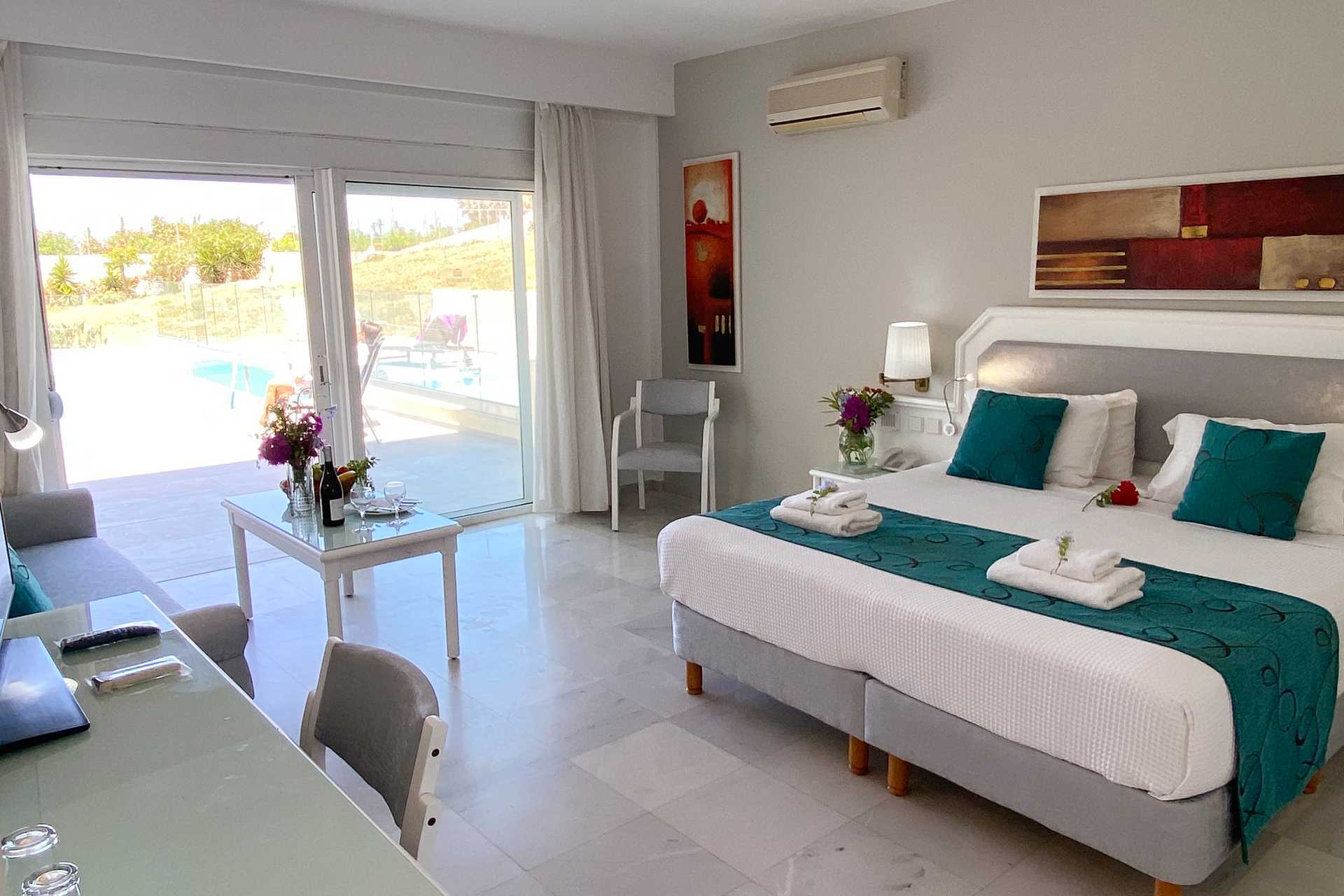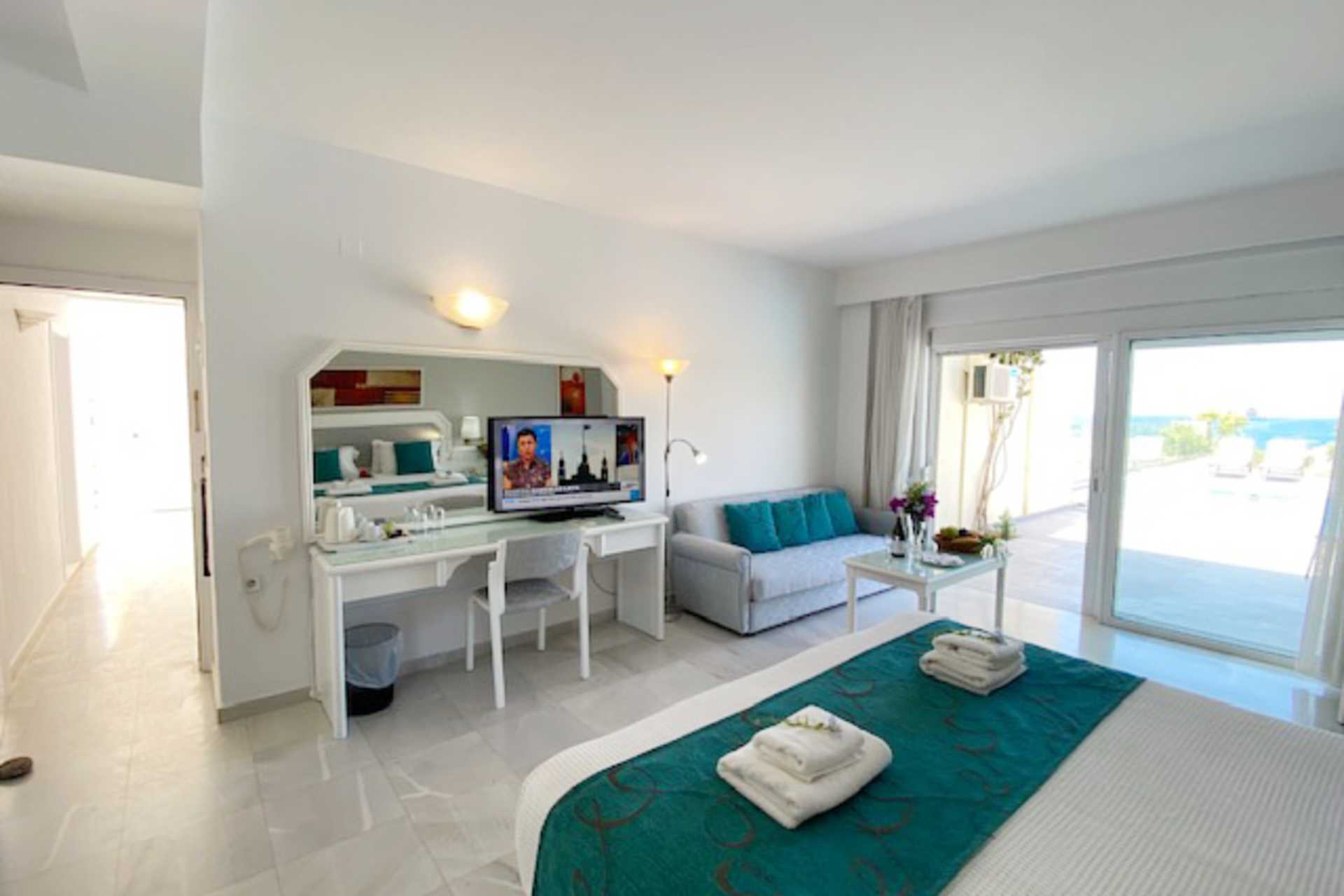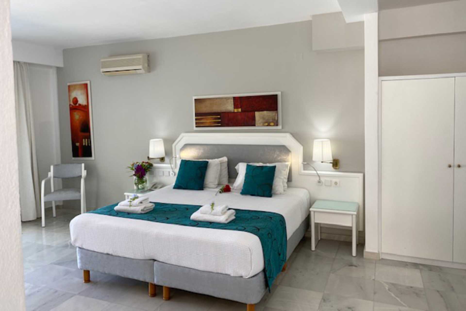 Tweepersoonskamer met balkon of terras, sommige met uitzicht op zee. De kamers bevinden zich in het hoofdgebouw of in de bungalows. Een tweepersoonsbed of twee eenpersoonsbedden. Mogelijkheid voor extra bedden in een slaapbank. Wifi en airconditioning inbegrepen. Kluisje tegen betaling. Koelkast. Waterkoker en koffie en thee. TV met internationale zenders. Badjassen en hotelslippers. Föhn. Badkamer met bad of douche en toilet. Schoonmaak 7 keer/week.