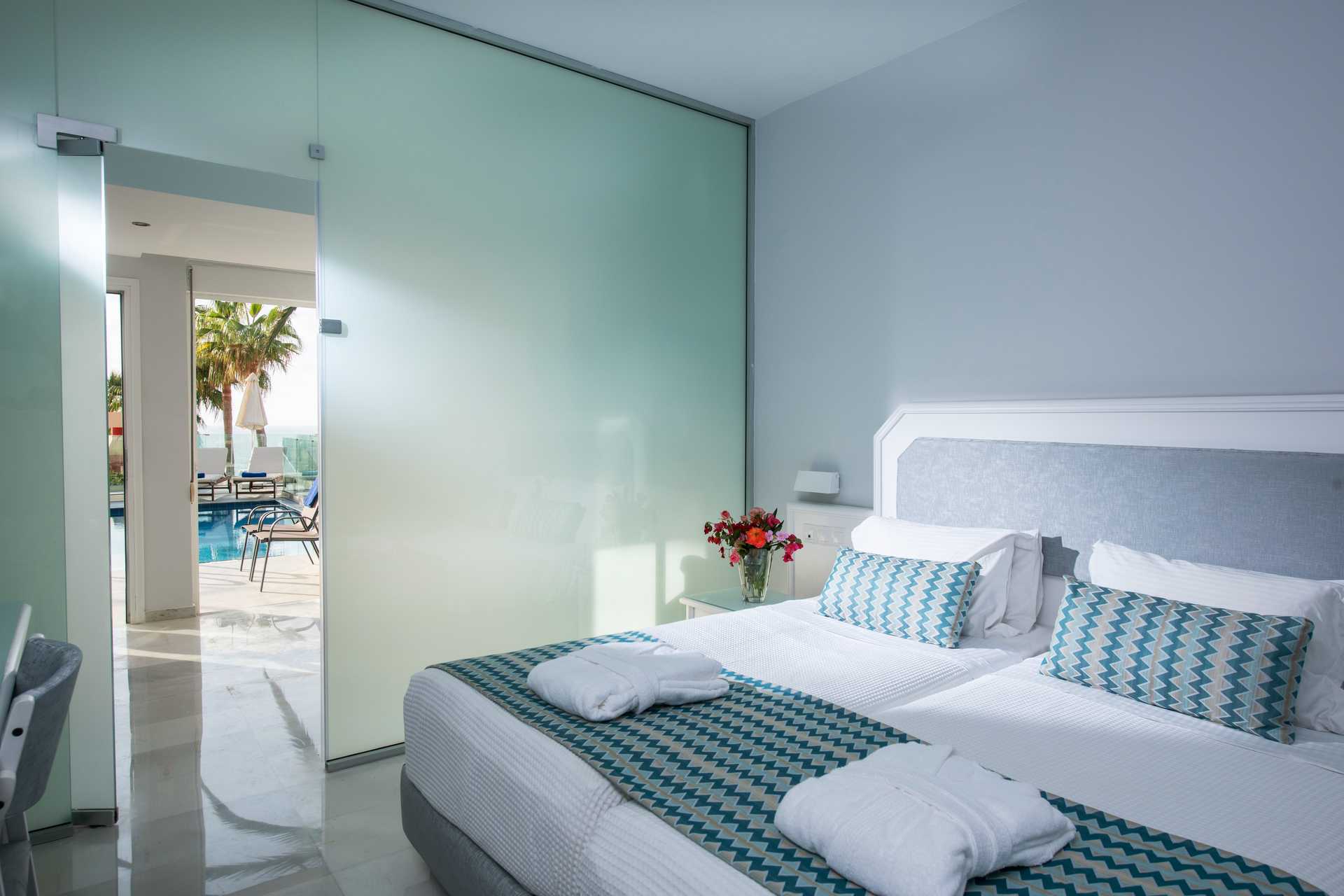 Familiekamer met een privézwembad op de begane grond. De kamers bestaan uit een slaapkamer met een tweepersoonsbed en een kamer met twee eenpersoonsbedden of een stapelbed. Wifi en airconditioning zijn inbegrepen. Kluisje tegen betaling. Koelkast. Waterkoker en koffie en thee. TV met internationale zenders. Föhn. Badkamer met bad of douche en toilet. Schoonmaak 7 keer/week.