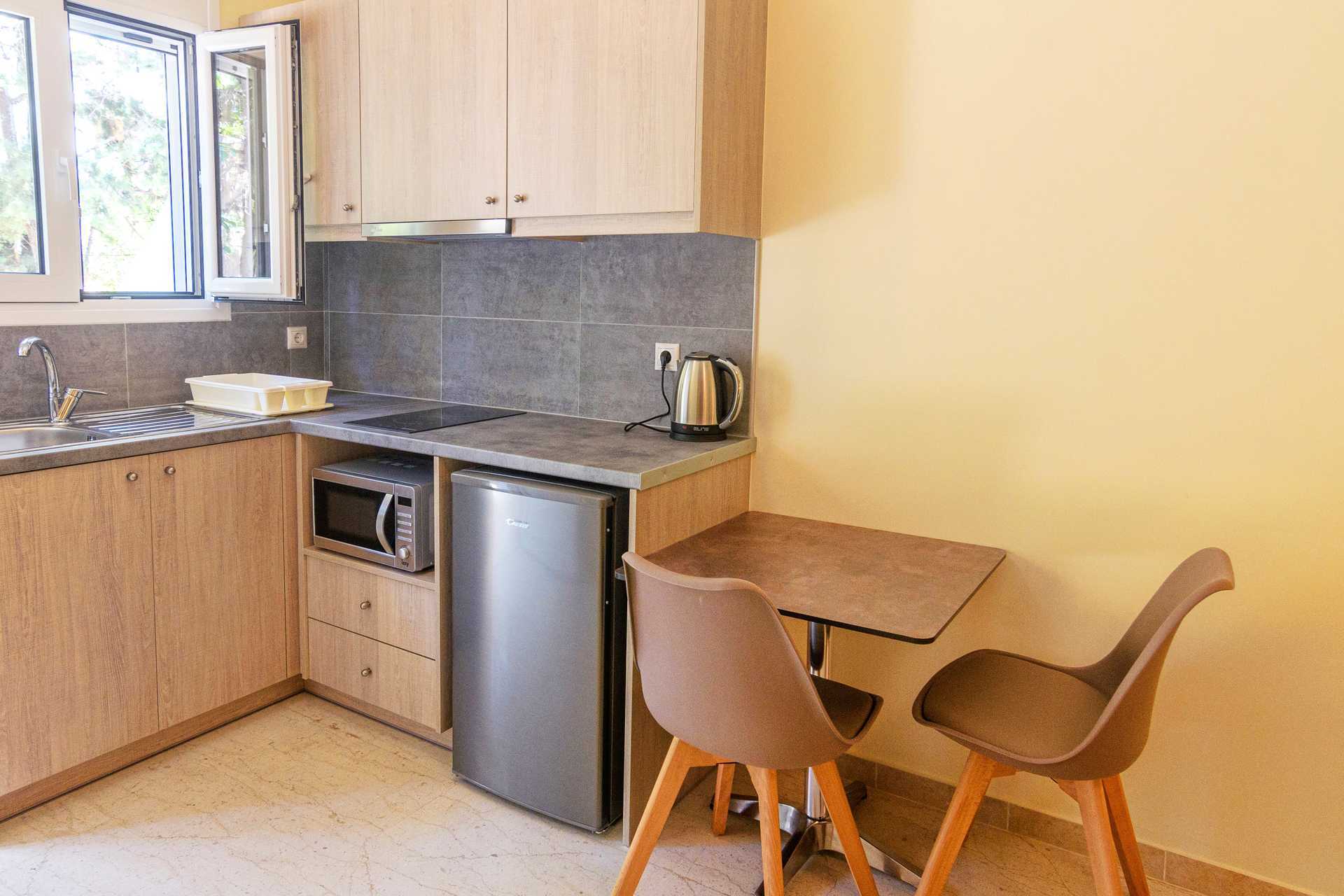 Superior studio's met balkon op de begane grond. De appartementen, geschikt voor volwassenen ouder dan 16 jaar, bevinden zich in een apart gebouw op ongeveer 50 meter van het hoofdgebouw. Gecombineerde slaapkamer met kitchenette. Een tweepersoonsbed of twee eenpersoonsbedden. Minikeuken met kookplaten, koelkast, waterkoker, koffiezetapparaat en eenvoudige keukenapparatuur. Airconditioning, kluisje en wifi inbegrepen. Tv met internationale zenders. Badkamer met bad of douche en toilet. Schoonmaak 7 keer/week.