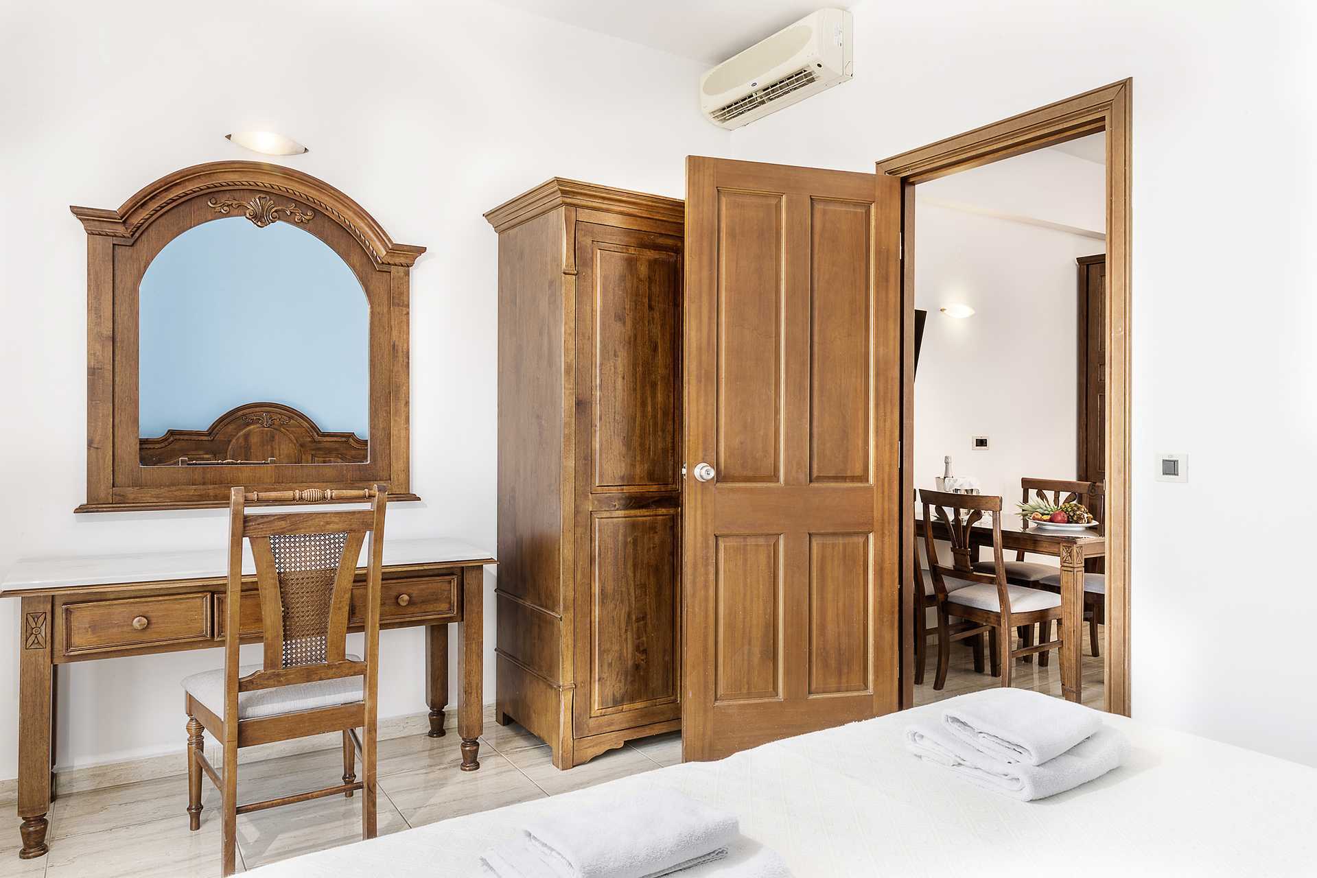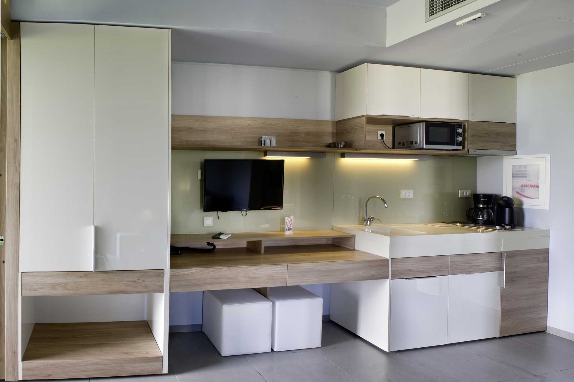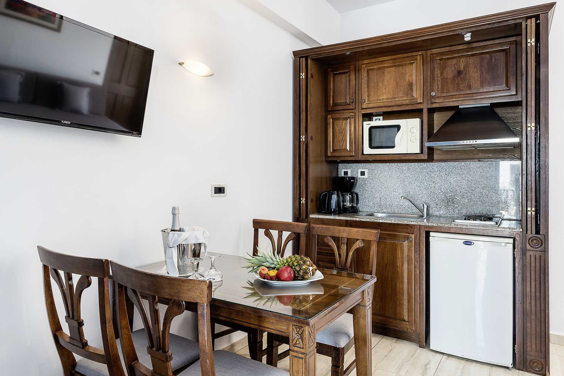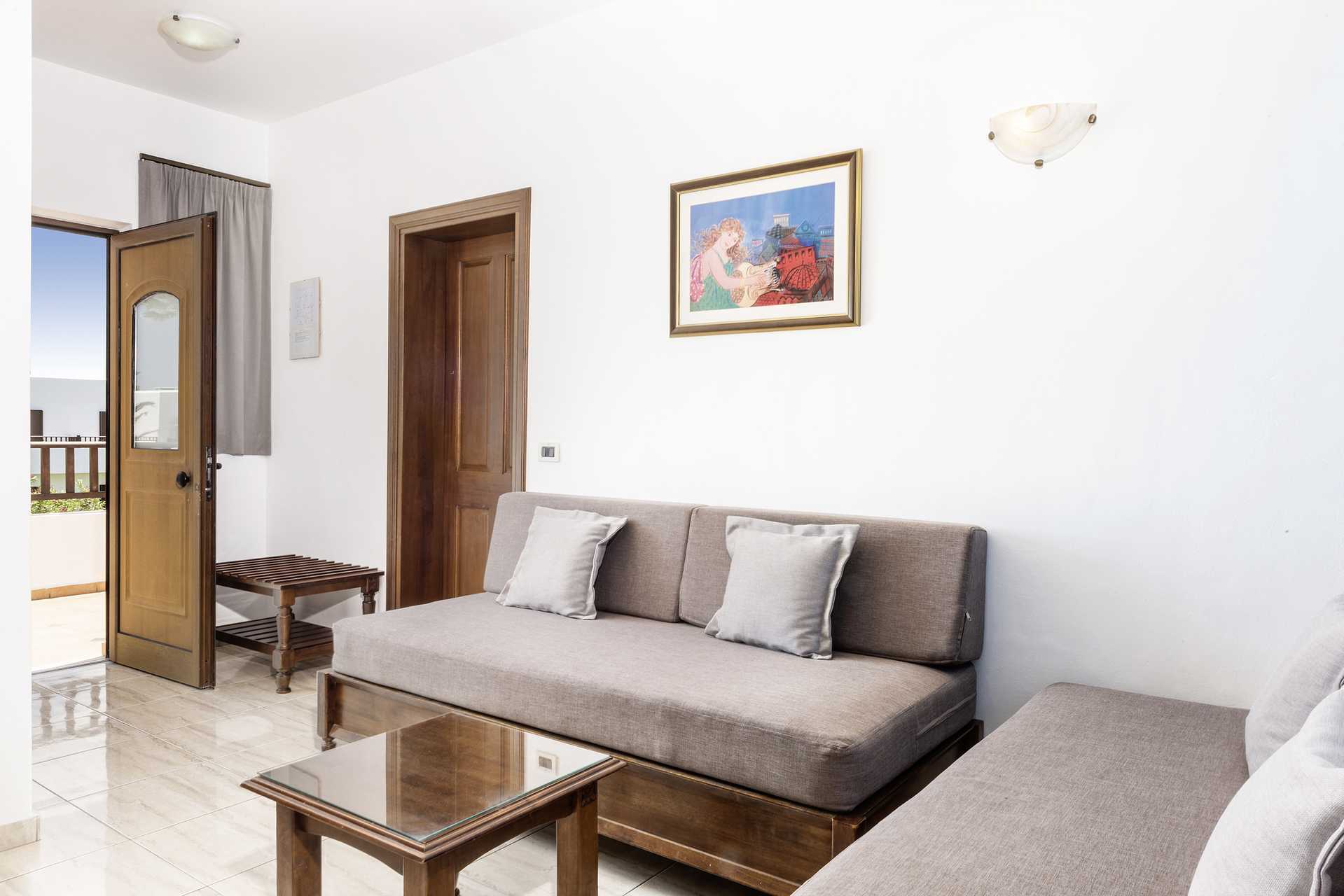 Luxe tweekamerappartement met balkon of terras, sommige met zeezicht. De appartementen bevinden zich in een apart gebouw uit 2015/2017. Slaapkamer en gecombineerde woonkamer met kitchenette. Een tweepersoonsbed of twee eenpersoonsbedden. Mogelijkheid voor extra bedden in slaapbank. Minikeuken met koelkast, magnetron, kookplaten, tosti-ijzer, koffiezetapparaat, Espresso Dolce Gusto koffiezetapparaat en goede keukenuitrusting. Wijn, fruit en water bij aankomst. Capsules voor het espressoapparaat zijn te koop in de minimarkt van het hotel. Wifi, airconditioning en kluisje inbegrepen. Een televisie met internationale zenders in beide kamers. Föhn. Badkamer met bad of douche en toilet. Schoonmaak 6 keer/week.
