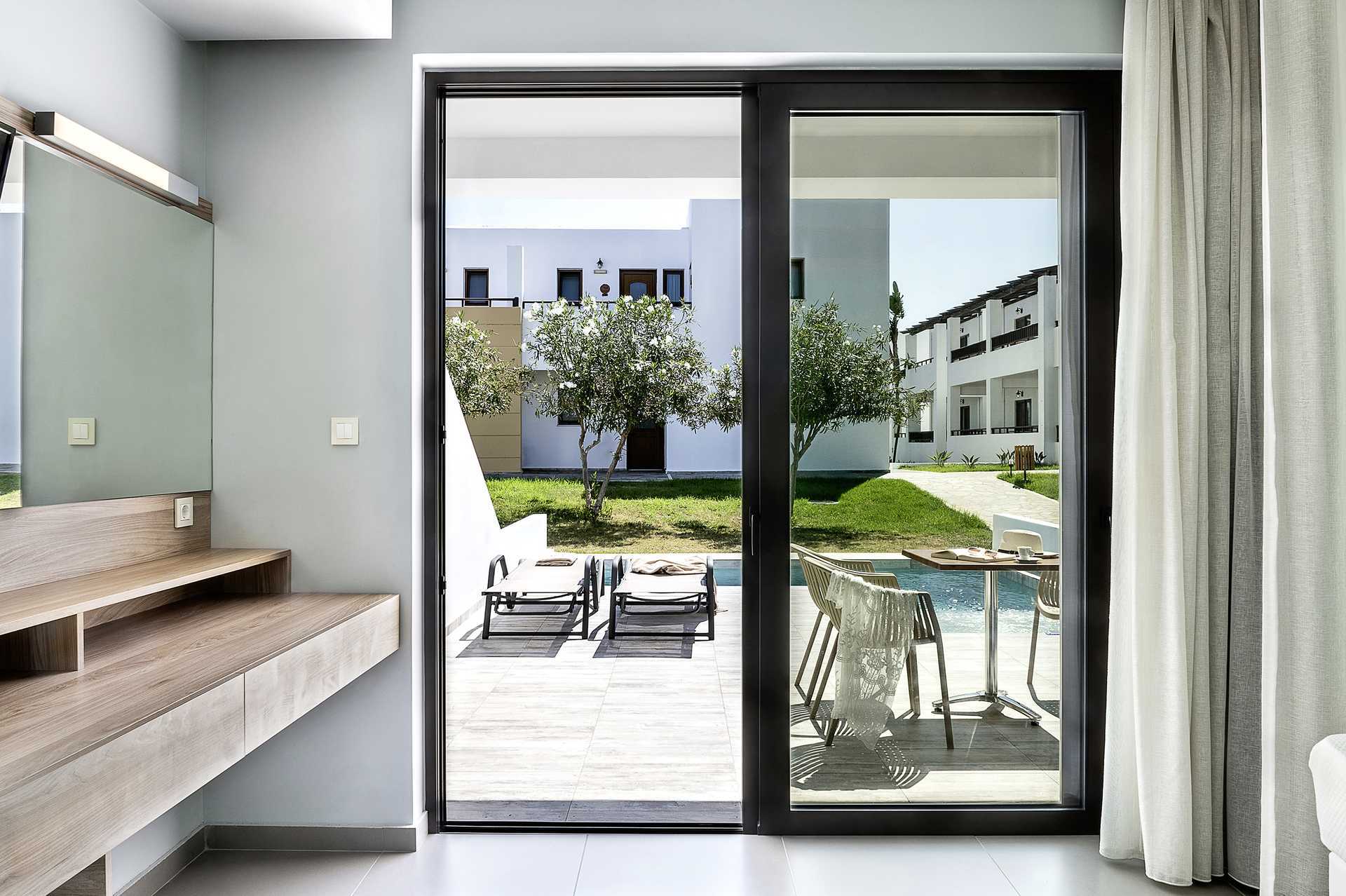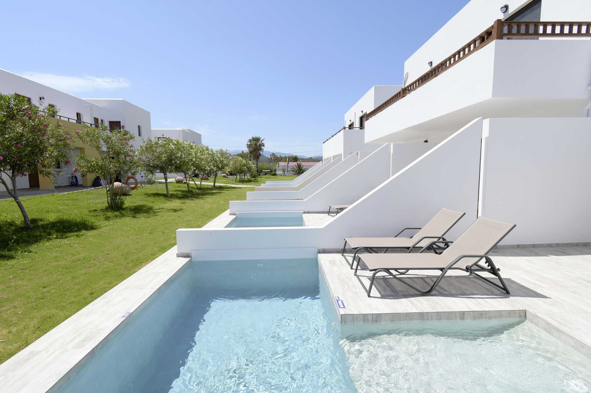 Tweekamerappartement met verhoogd terras en privé zwembad. Twee ligstoelen en een tafel met stoelen op het terras. De appartementen bevinden zich in een apart gebouw uit 2017. Slaapkamer en gecombineerde woonkamer met kitchenette. Een tweepersoonsbed. Mogelijkheid tot extra bedden in de vorm van een slaapbank. Kitchenette met koelkast, magnetron, kookplaten, tosti-ijzer, koffiezetapparaat, espresso-apparaat en goede keukenuitrusting. Capsules voor het espressoapparaat zijn te koop in de minimarkt van het hotel. Een televisie met internationale zenders in elke kamer. Wifi, airconditioning en kluisje inbegrepen. Föhn. Hotelslippers. Badkamer met bad of douche en toilet. Hor in de terrasdeur. Schoonmaak 6 keer/week.