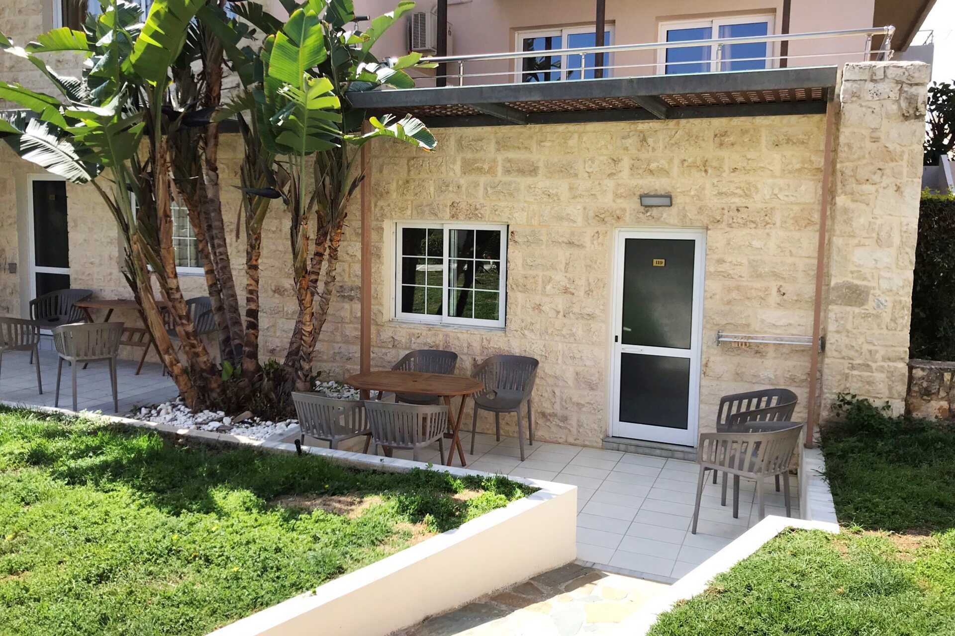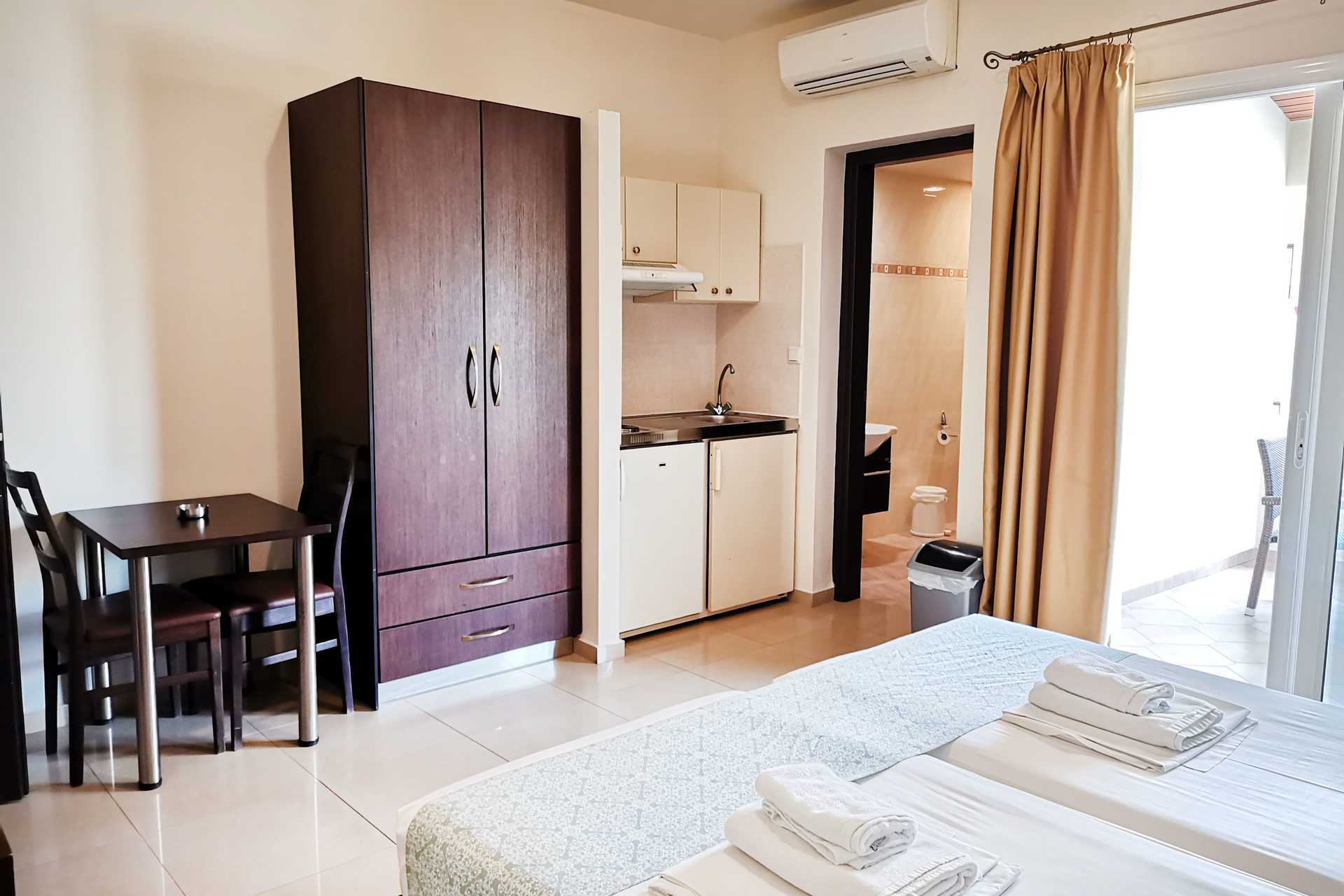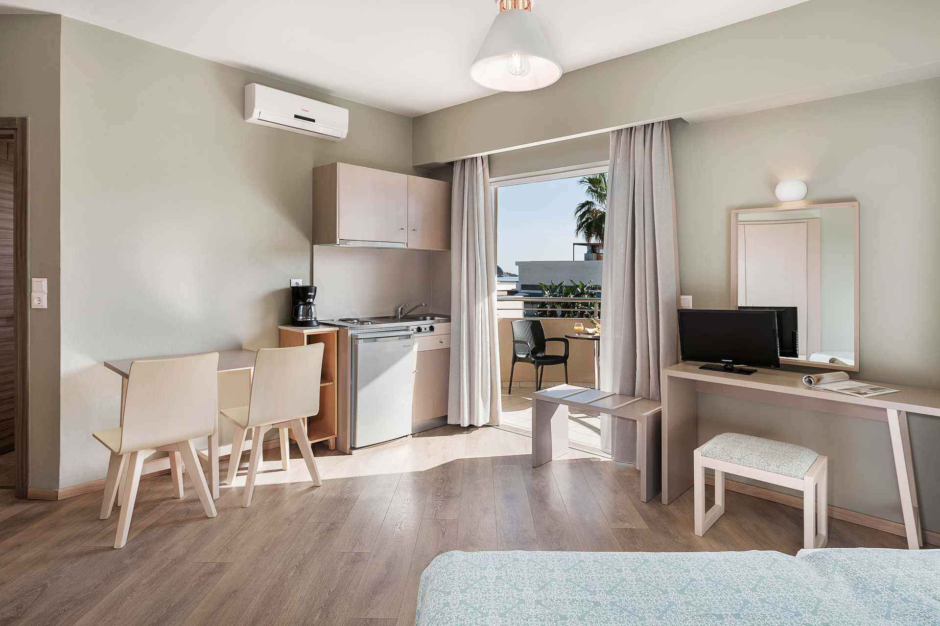 Eenkamerappartement met balkon, grondbalkon of grondterras. Eén van de appartementen heeft een niveauverschil/traptreden in het appartement. Sommige appartementen bevinden zich in het hoofdgebouw en zijn bereikbaar via een trap vanaf de receptie. Er is geen lift. Dit geldt ook voor de appartementen die een balkon hebben. Gecombineerde slaapkamer met kitchenette. Een tweepersoonsbed of twee eenpersoonsbedden. Mogelijkheid voor extra bedden in slaapbank. Minikeuken met kookplaten, koelkast met vriesvak, magnetron, koffiezetapparaat, waterkoker, broodrooster en eenvoudige keukenapparatuur. Wifi, airconditioning en kluis inbegrepen. TV met lokale zenders. Badkamer met bad of douche en toilet. Schoonmaak 6 keer/week.