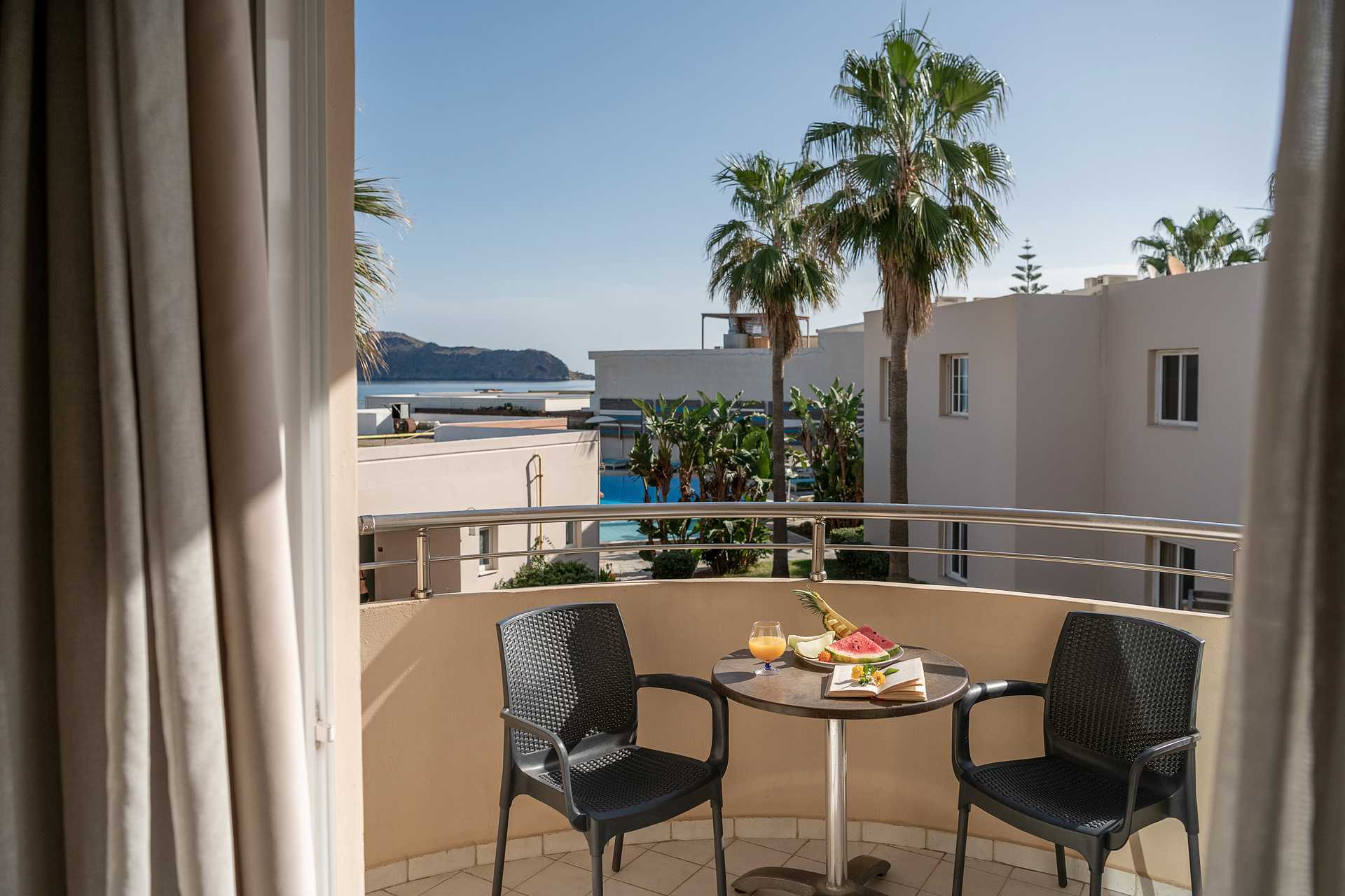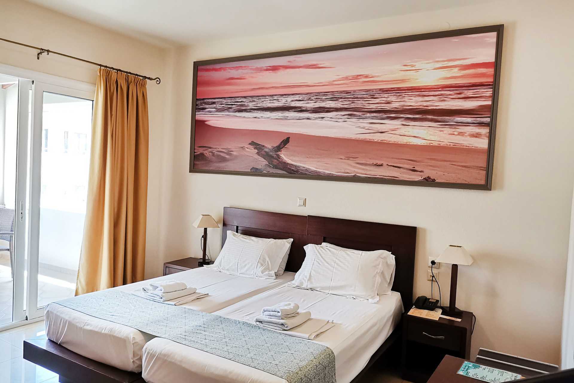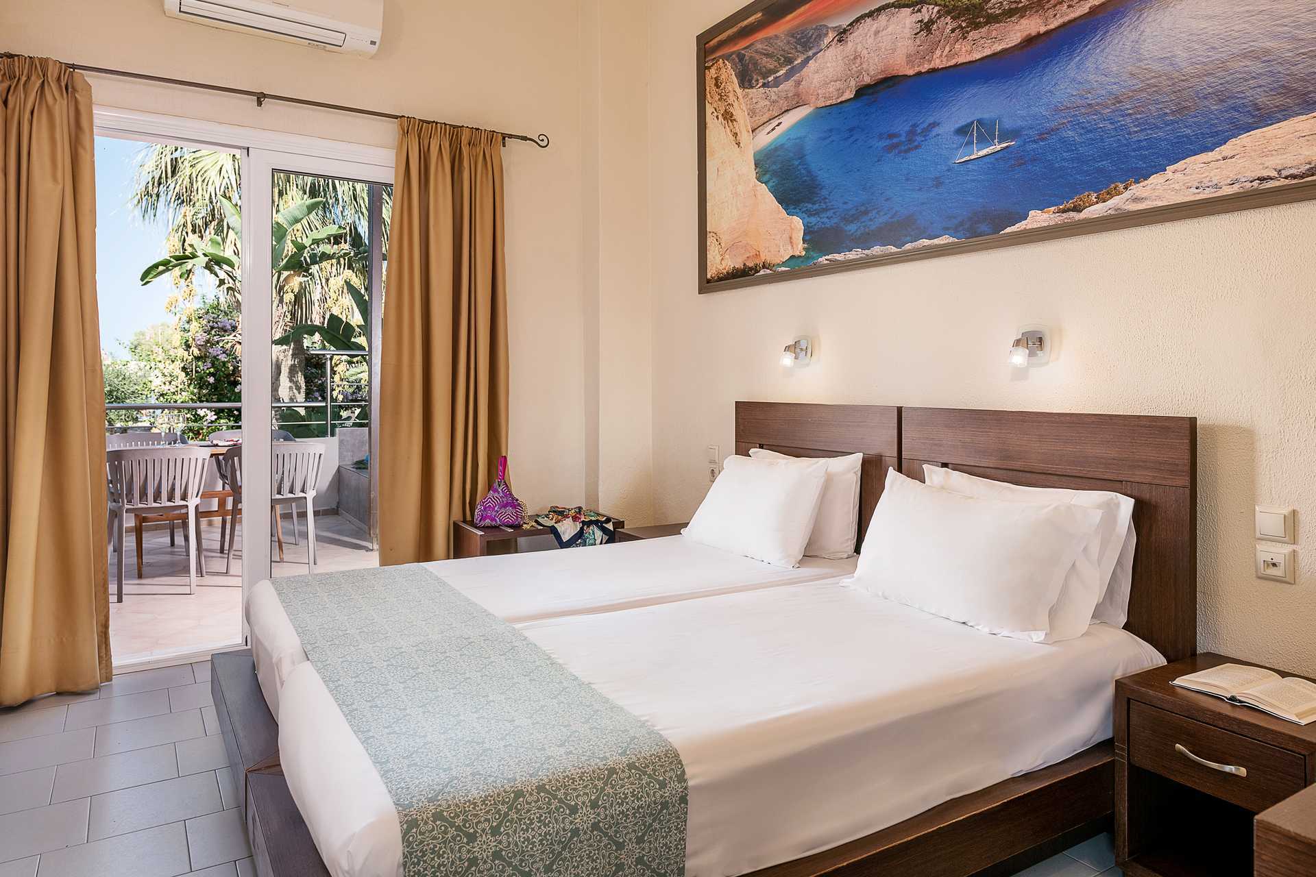 Eenkamerappartement met balkon, grondbalkon of grondterras. Eén van de appartementen heeft een niveauverschil/traptreden in het appartement. Sommige appartementen bevinden zich in het hoofdgebouw en zijn bereikbaar via een trap vanaf de receptie. Er is geen lift. Dit geldt ook voor de appartementen die een balkon hebben. Gecombineerde slaapkamer met kitchenette. Een tweepersoonsbed of twee eenpersoonsbedden. Mogelijkheid voor extra bedden in slaapbank. Minikeuken met kookplaten, koelkast met vriesvak, magnetron, koffiezetapparaat, waterkoker, broodrooster en eenvoudige keukenapparatuur. Wifi, airconditioning en kluis inbegrepen. TV met lokale zenders. Badkamer met bad of douche en toilet. Schoonmaak 6 keer/week.