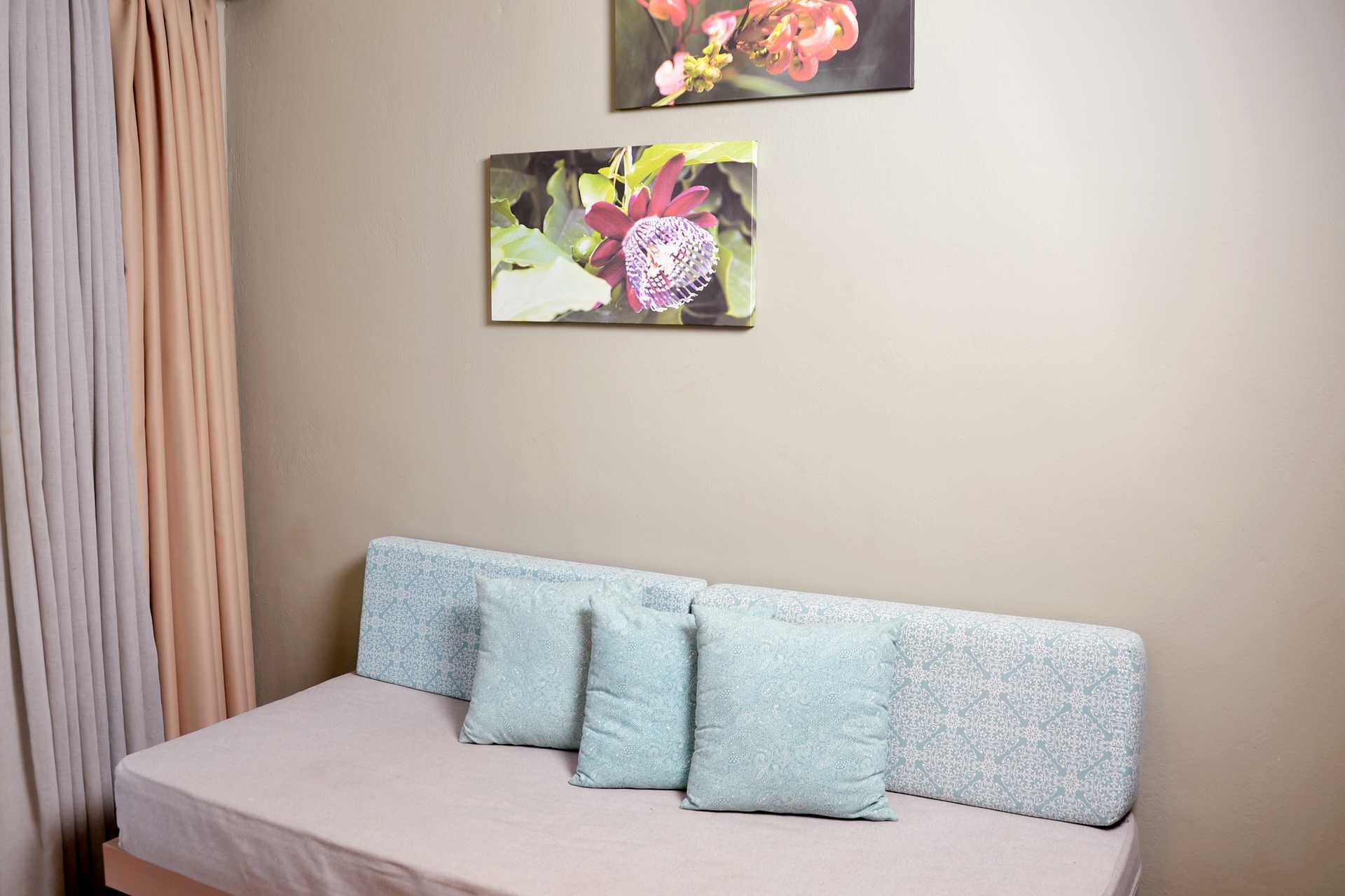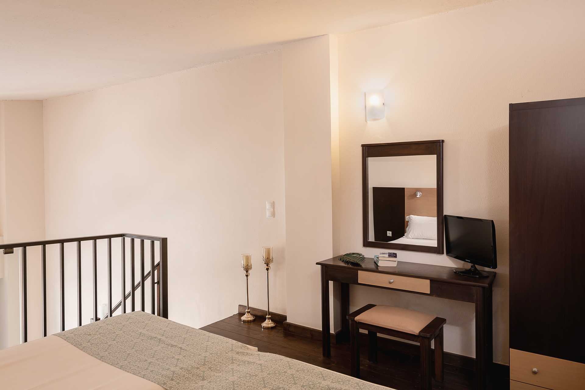 Eenkamerappartement op de eerste verdieping en balkon. Op de entreeverdieping bevindt zich een gecombineerde woonkamer met kitchenette en een badkamer. Een steile trap naar de bovenverdieping waar twee eenpersoonsbedden staan. Open plattegrond tussen verdiepingen. Mogelijkheid voor extra bedden in slaapbank. Minikeuken met kookplaten, koelkast met vriesvak, magnetron, koffiezetapparaat, waterkoker, broodrooster en eenvoudige keukenapparatuur. Wifi, airconditioning en kluis inbegrepen. TV met lokale zenders. Badkamer met bad of douche en toilet. Schoonmaak 6 keer/week.