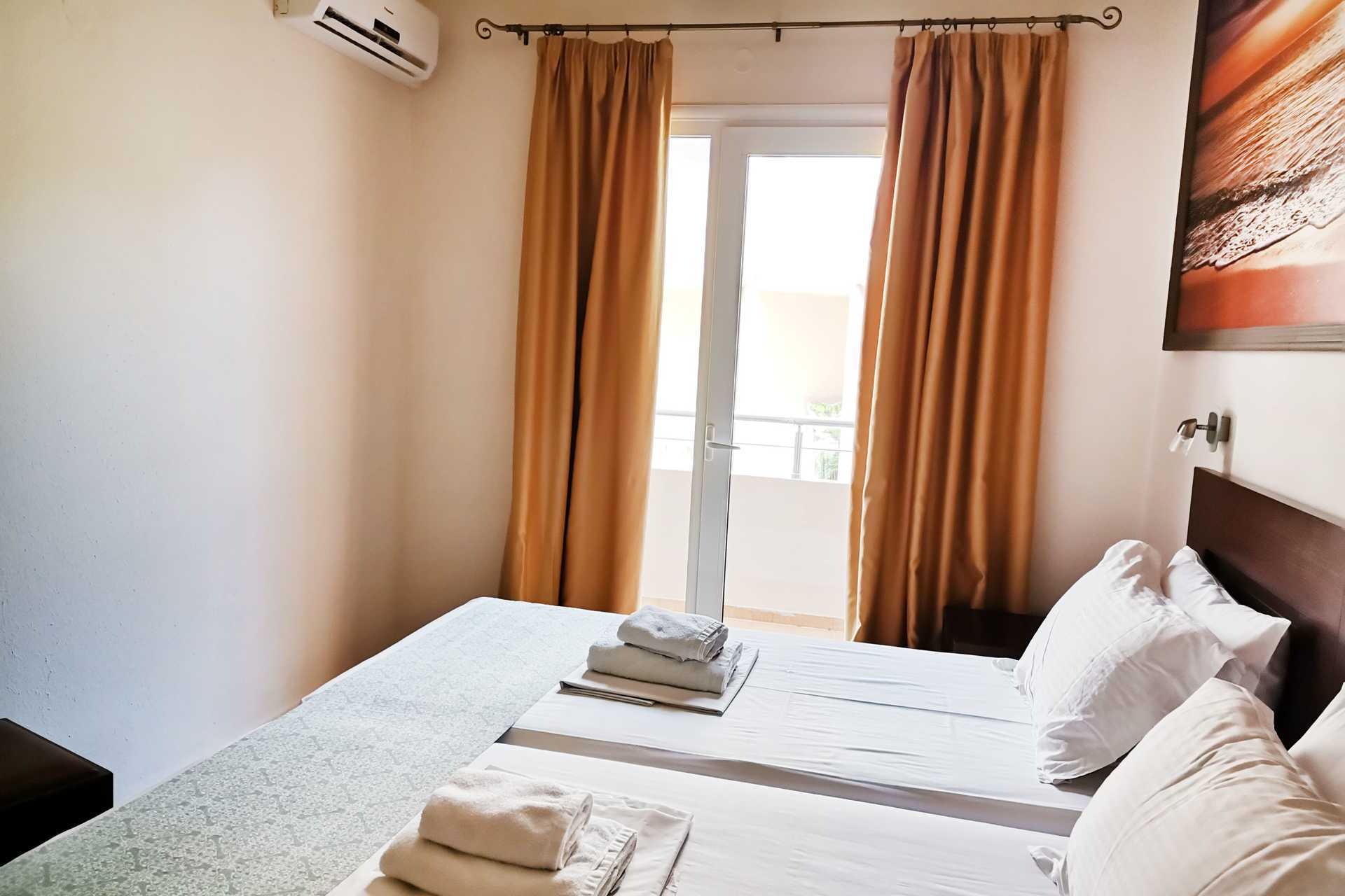 Tweekamerappartement met balkon, grondterras of grondbalkon. De appartementen bevinden zich één verdieping hoger dan de receptie, zonder lift. Slaapkamer en een gecombineerde woonkamer met kitchenette. Twee eenpersoonsbedden. Mogelijkheid voor extra bedden in slaapbank. Minikeuken met kookplaten, koelkast met vriesvak, magnetron, koffiezetapparaat, waterkoker, broodrooster en eenvoudige keukenapparatuur. Wifi, airconditioning en kluisje inbegrepen. Tv met lokale zenders. Badkamer met bad of douche en toilet. Schoonmaak 6 keer/week.