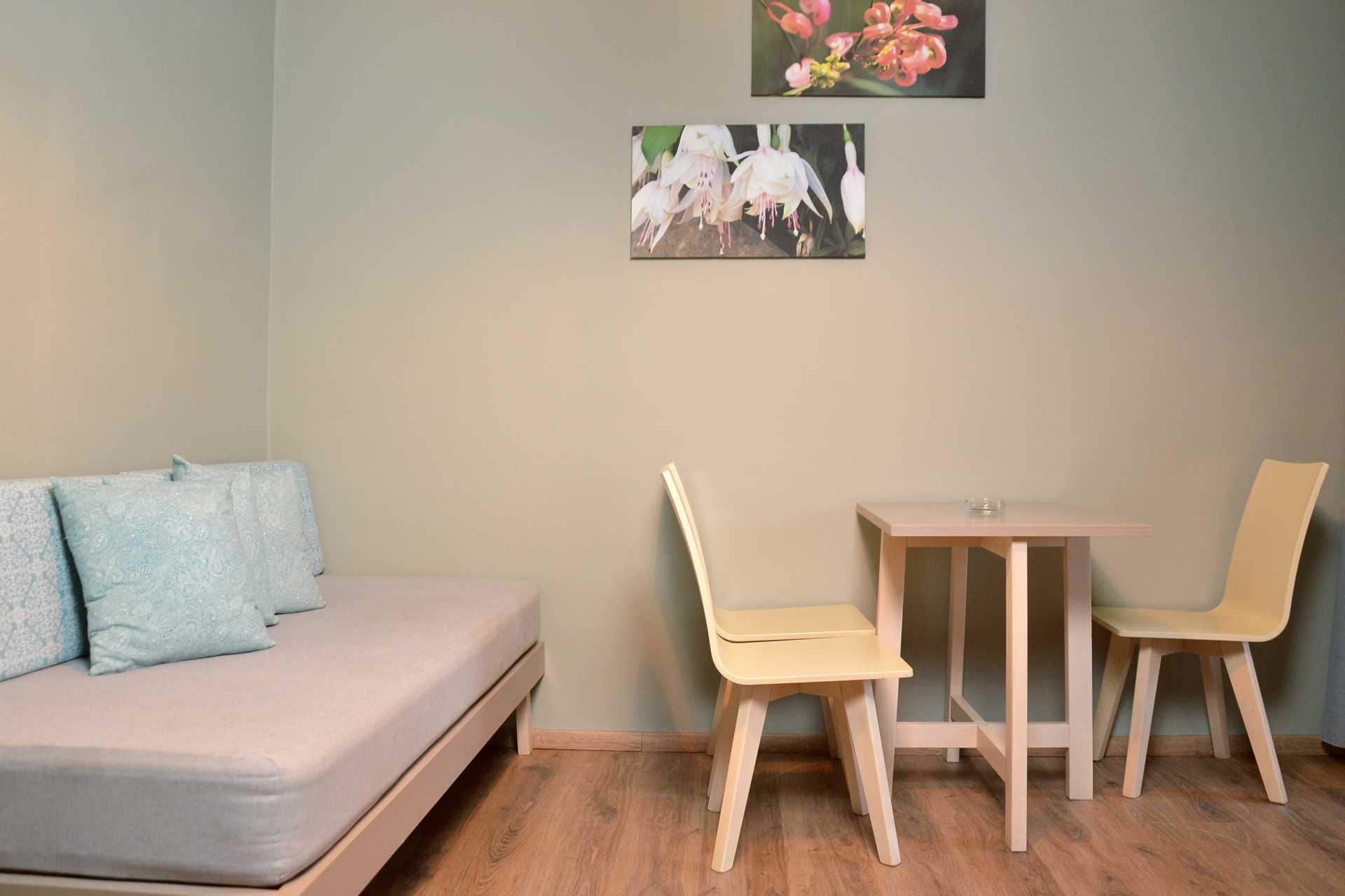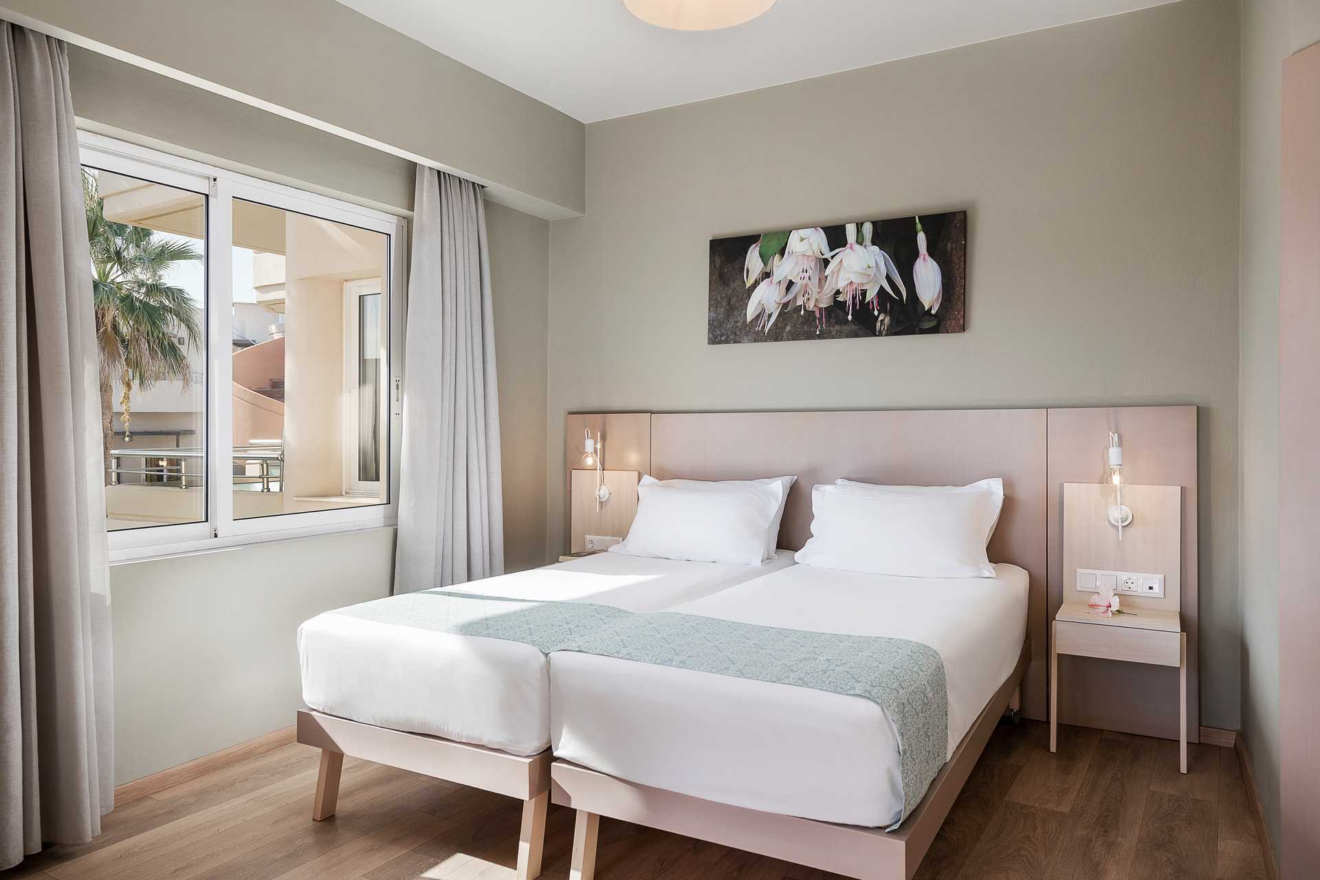 Tweekamerappartement met balkon, grondterras of grondbalkon. De appartementen bevinden zich in het hoofdgebouw. Slaapkamer en gecombineerde woonkamer met kitchenette. Twee eenpersoonsbedden. Mogelijkheid voor extra bedden op een slaapbank of twee slaapbanken. Minikeuken met kookplaten, koelkast met vriesvak, magnetron, koffiezetapparaat, waterkoker, broodrooster en eenvoudige keukenapparatuur. Tv met lokale zenders. Wifi, airconditioning en kluisje inbegrepen. Badkamer met bad of douche en toilet. Schoonmaak 6 keer/week.