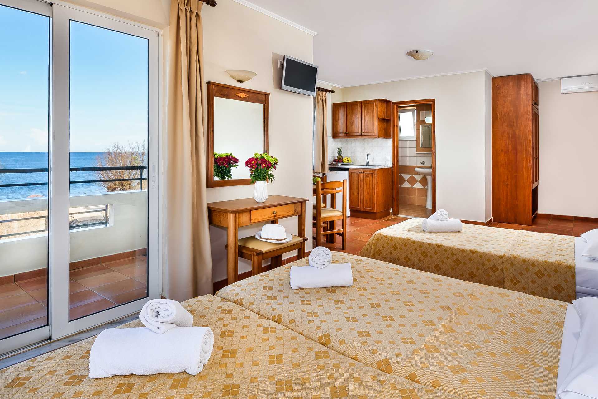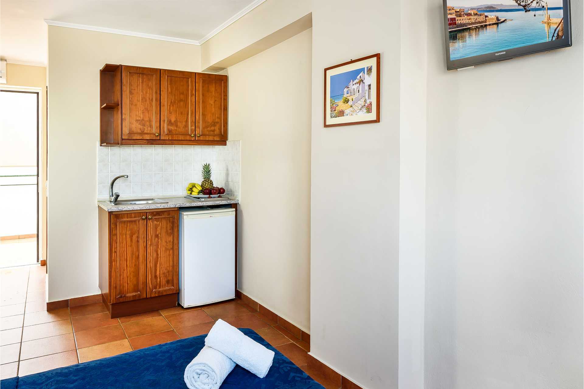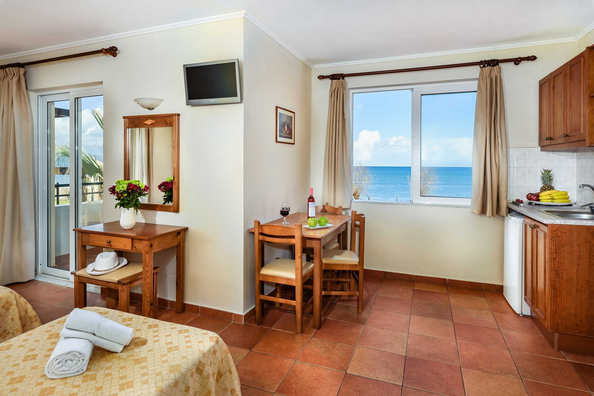 Eenkamerappartement met balkon of verhoogd terras op de begane grond, sommige balkons hebben beperkt zeezicht. Gecombineerde slaapkamer met woonkamer en kitchenette. Twee eenpersoonsbedden. Mogelijkheid tot een extra bed in een eenpersoonsbed. Kitchenette met koelkast, kookplaat, waterkoker en basiskeukengerei. Wifi en airconditioning inbegrepen. Kluisje tegen betaling. Badkamer met douche en toilet. Schoonmaak 6 keer/week.