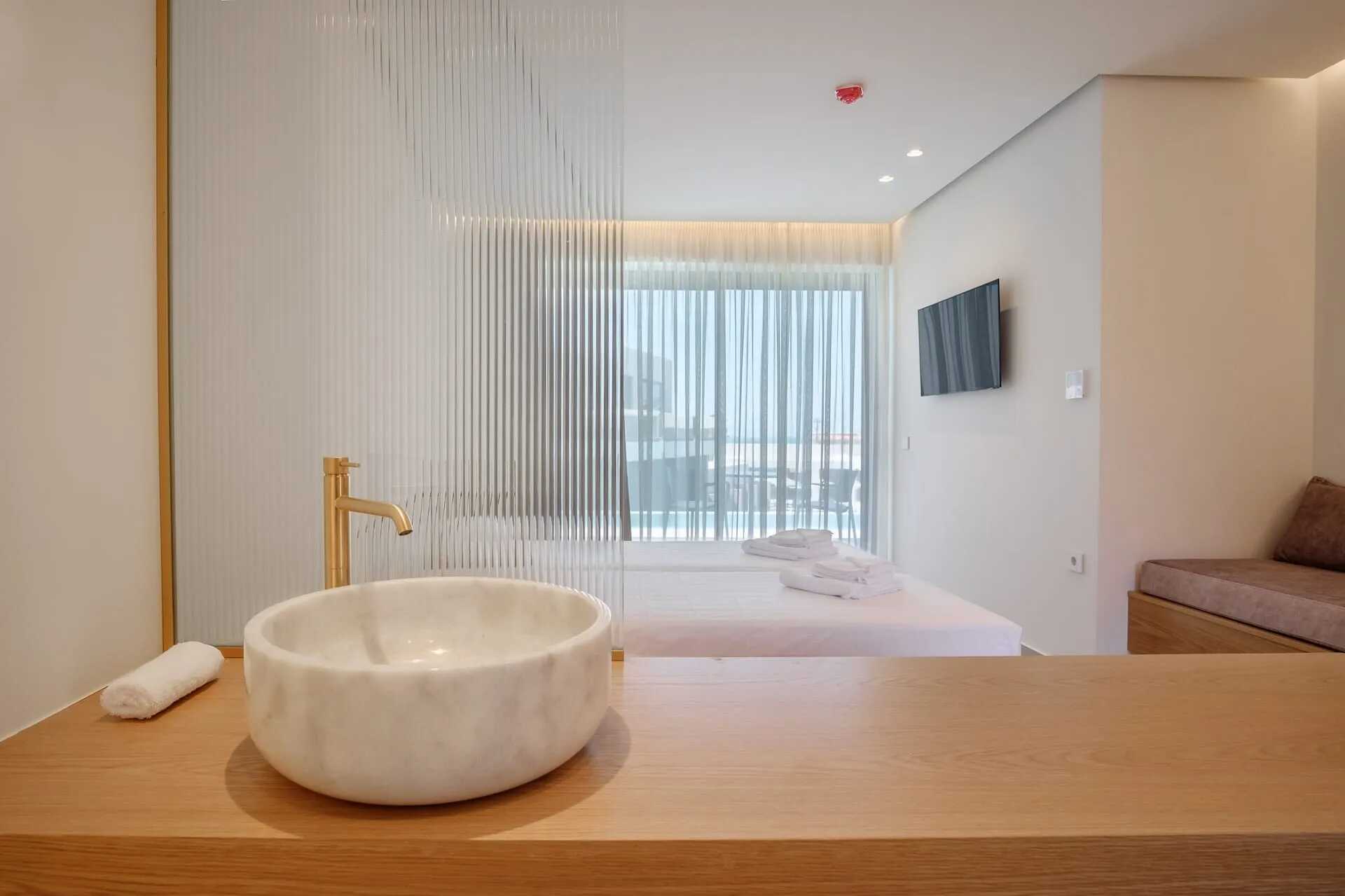 Deluxe junior suite met terras en toegang tot een gedeeld zwembad. Een tweepersoonsbed of twee eenpersoonsbedden. Mogelijkheid voor een extra bed op de slaapbank. Wifi, airconditioning en kluisje inbegrepen. Minibar. Waterkoker en koffie en thee. Nespresso-apparaat - twee capsules inbegrepen bij aankomst, bijgevuld tegen betaling. Badjassen en hotelslippers. Föhn. Wastafel in de kamer. Matglazen deur naar douche en toilet. Schoonmaak 7 keer/week.