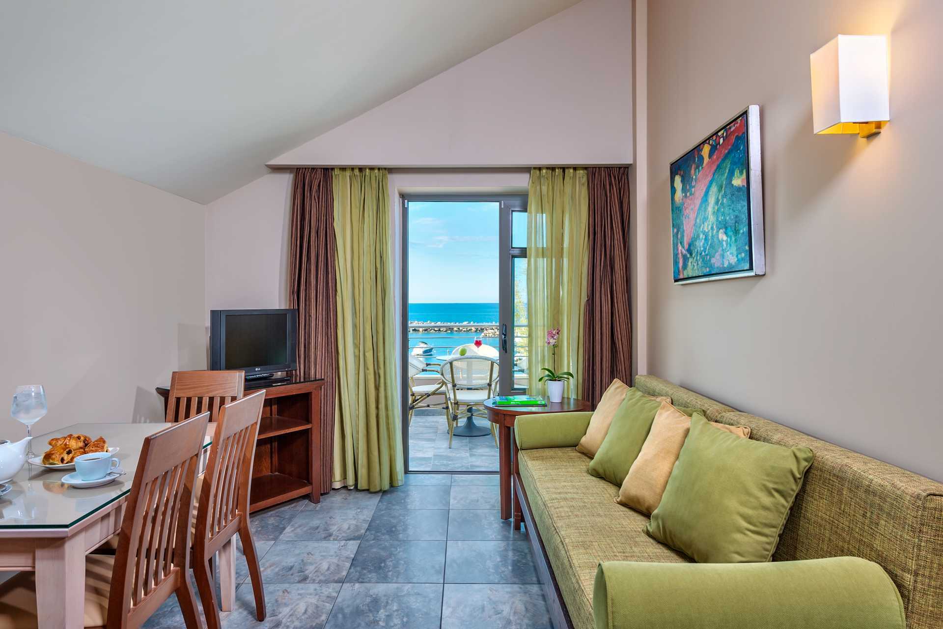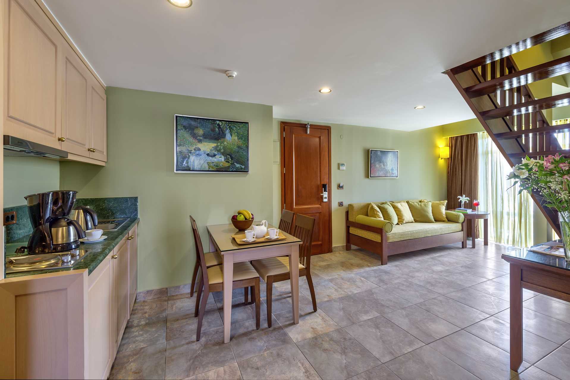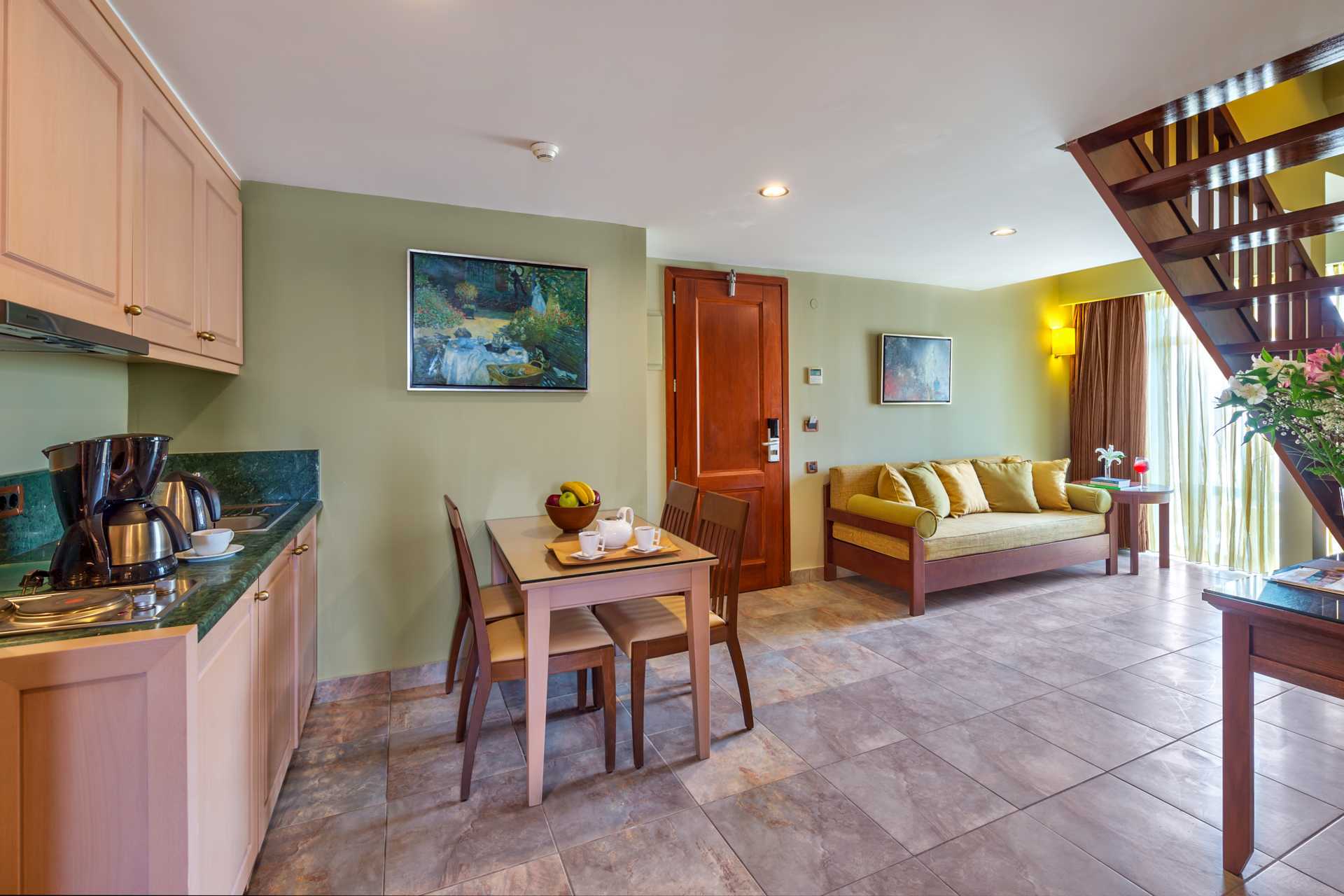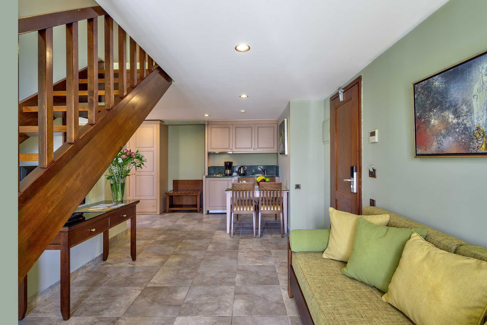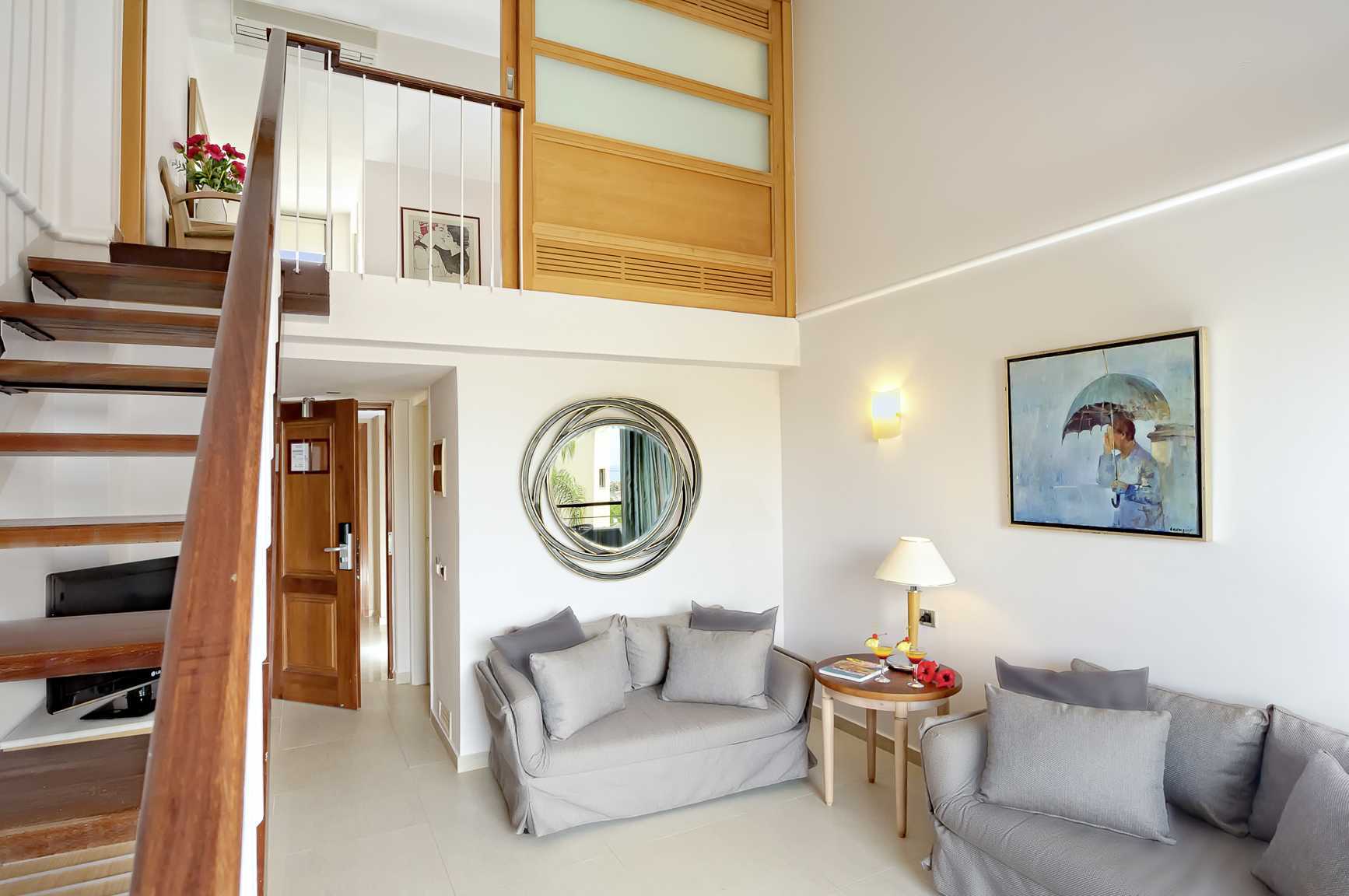 Tweepersoonskamer in maisonette met balkon of terras en uitzicht op het zwembad. Op de begane grond is er de mogelijkheid tot extra bedden in de vorm van twee slaapbanken en een badkamer. Boven is er een slaapvide met een tweepersoonsbed of twee eenpersoonsbedden. De slaapvide is via een schuifdeur gescheiden van de kamer. Wifi en airconditioning inbegrepen. Kluisje tegen betaling. Koelkast. Tv met internationale zenders. Badkamer met douche en toilet. Schoonmaak 7 keer/week. Kinderen jonger dan twee jaar zijn inbegrepen in het maximale aantal personen in de kamer.