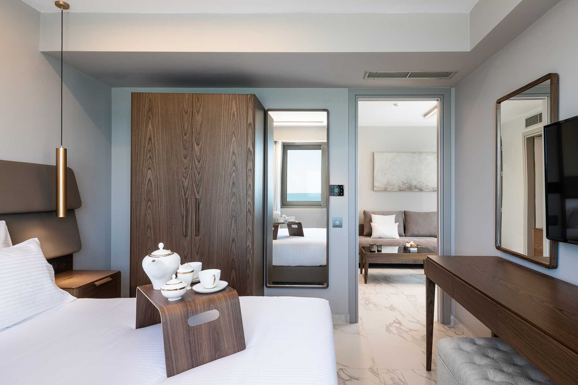 Tweepersoonskamers met balkon of terras, sommige met beperkt uitzicht op zee. De suite bestaat uit een slaapkamer en een woonkamer. Een tweepersoonsbed. Wifi, airconditioning en kluis inbegrepen. Plafondventilator. Minibar. Koffiezetapparaat, capsules inbegrepen. Waterkoker en koffie en thee. TV met internationale zenders. Bluetooth-luidspreker. Haardroger. Badjassen en hotelslippers. Badkamer met douche en toilet. Schoonmaak 7 keer/week. Porto Platanias Luxury Selection