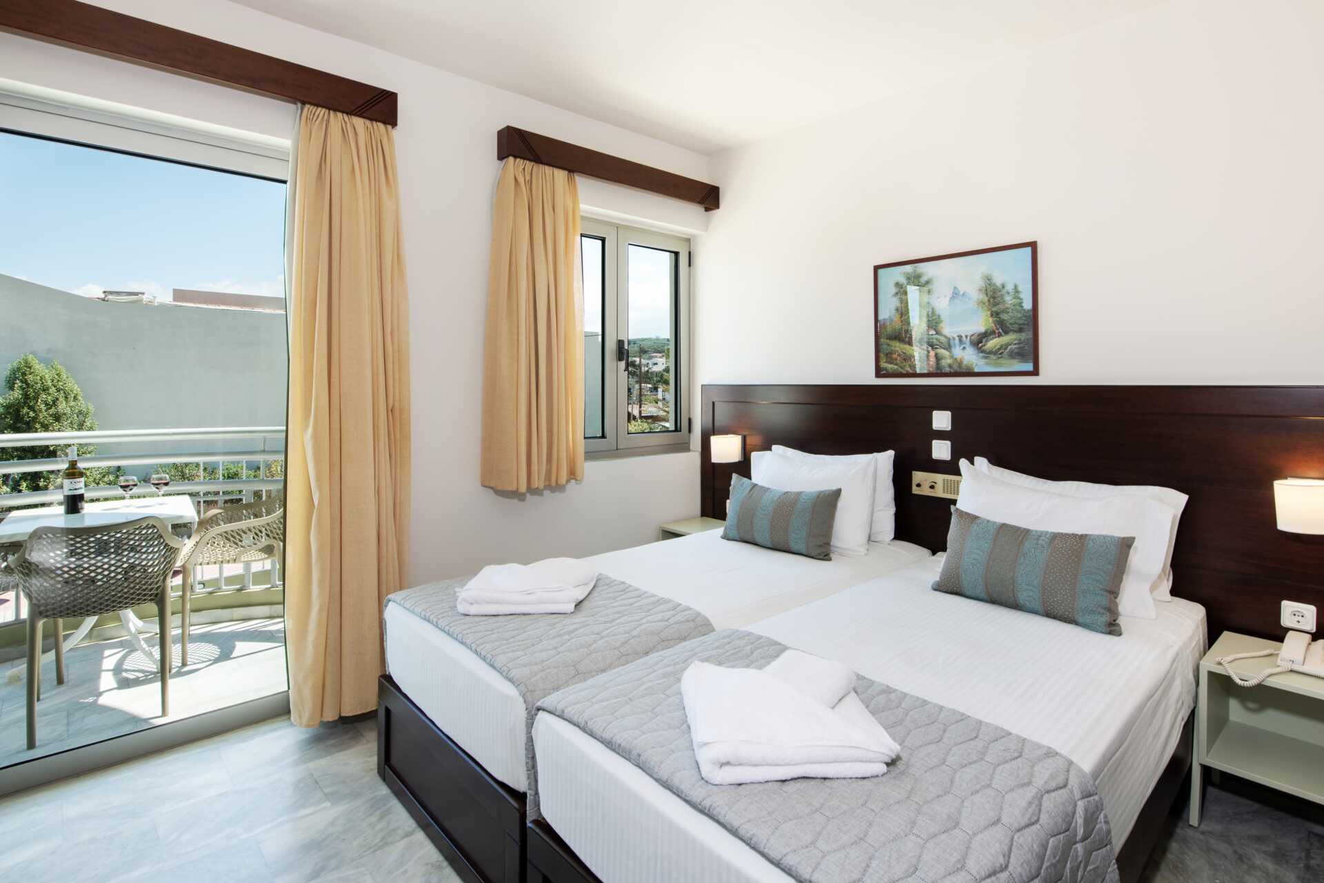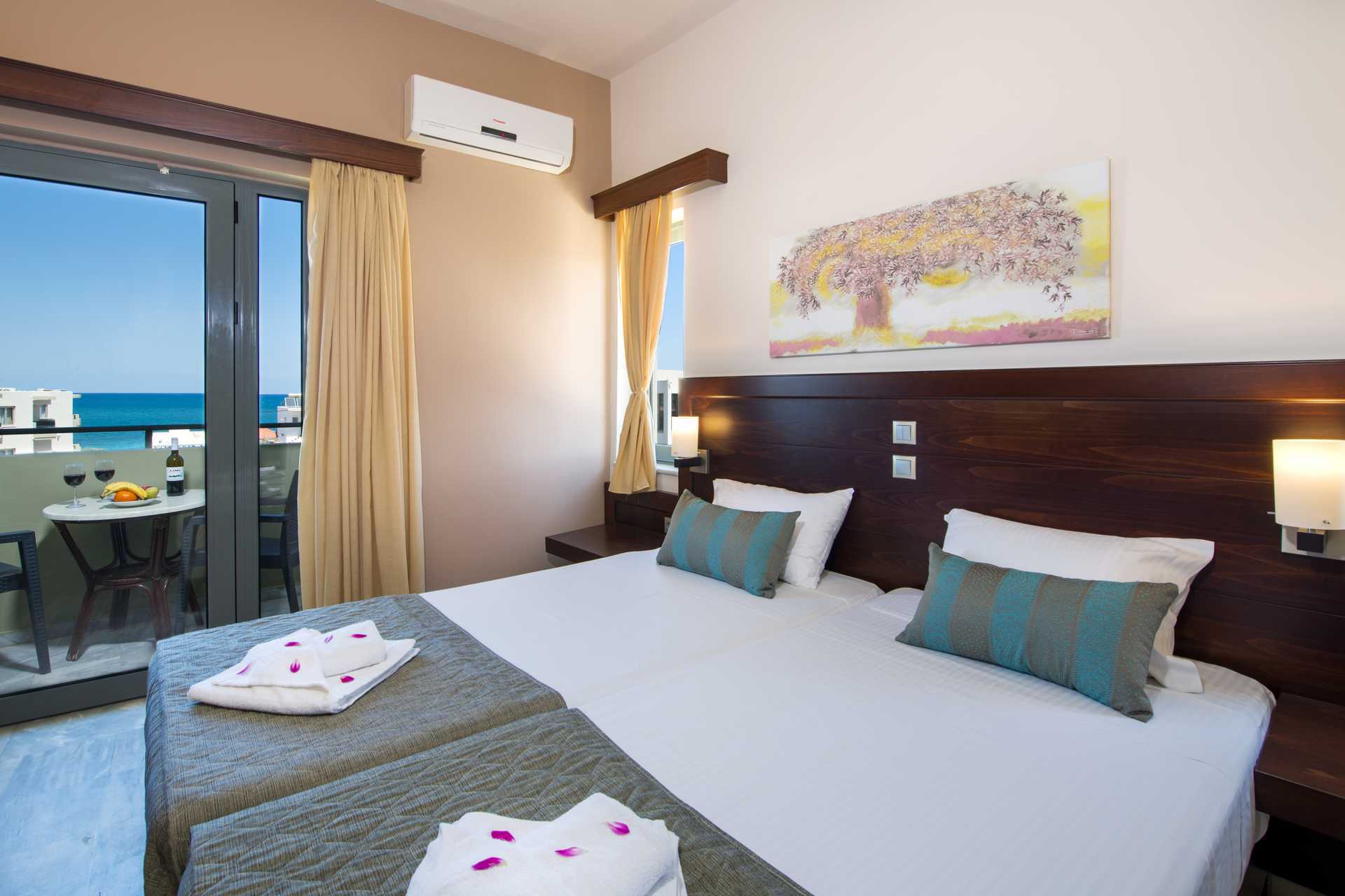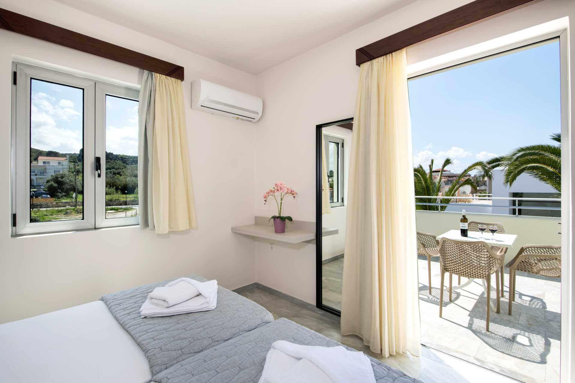 Appartementen met twee slaapkamers gelegen in het strand-/zwembadgebouw. Balkon, sommige met zeezicht of beperkt zeezicht. Een slaapkamer en een gecombineerde woonkamer met kitchenette. Twee eenpersoonsbedden. Mogelijkheid voor extra bedden in slaapbank. In de appartementen staat bij aankomst een fles wijn en een fles water. Minikeuken met kookplaten, koelkast met vriesvak, magnetron, koffiezetapparaat, waterkoker, broodrooster en eenvoudige keukenapparatuur. Wifi, airconditioning en kluisje inbegrepen. Tv met satellietzenders. Strijkijzer en strijkplank. Badjassen en hotelslippers. Föhn. Badkamer met douche en toilet. Schoonmaak 7 keer/week.