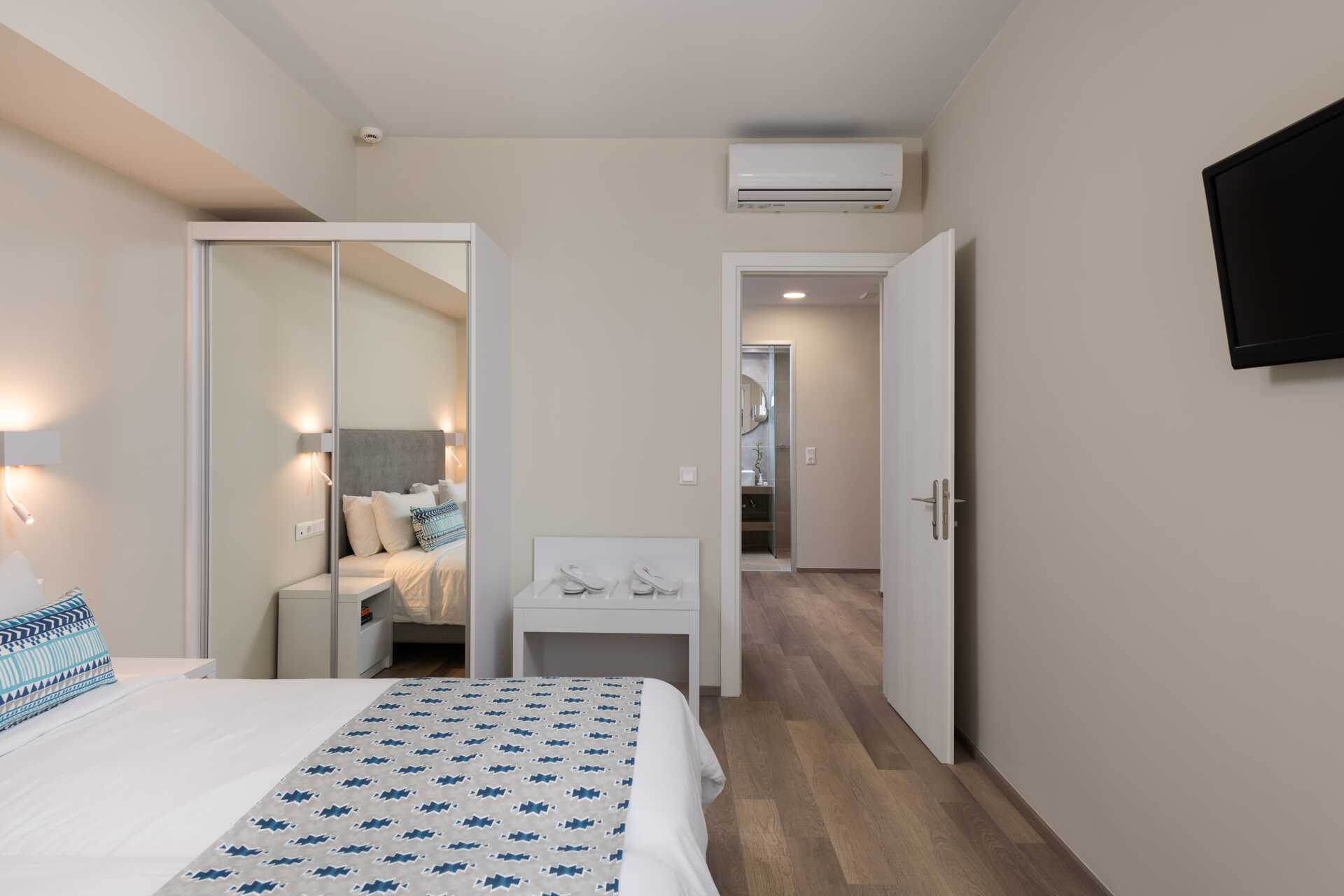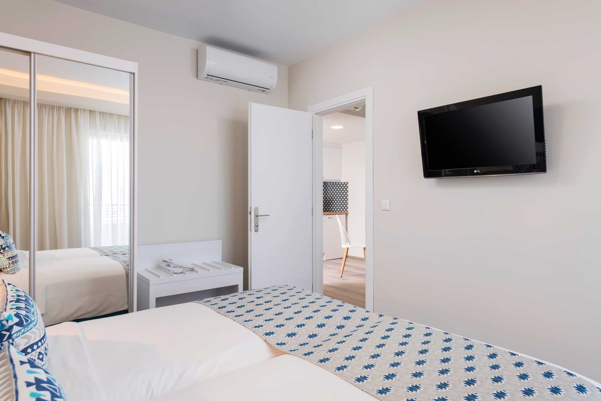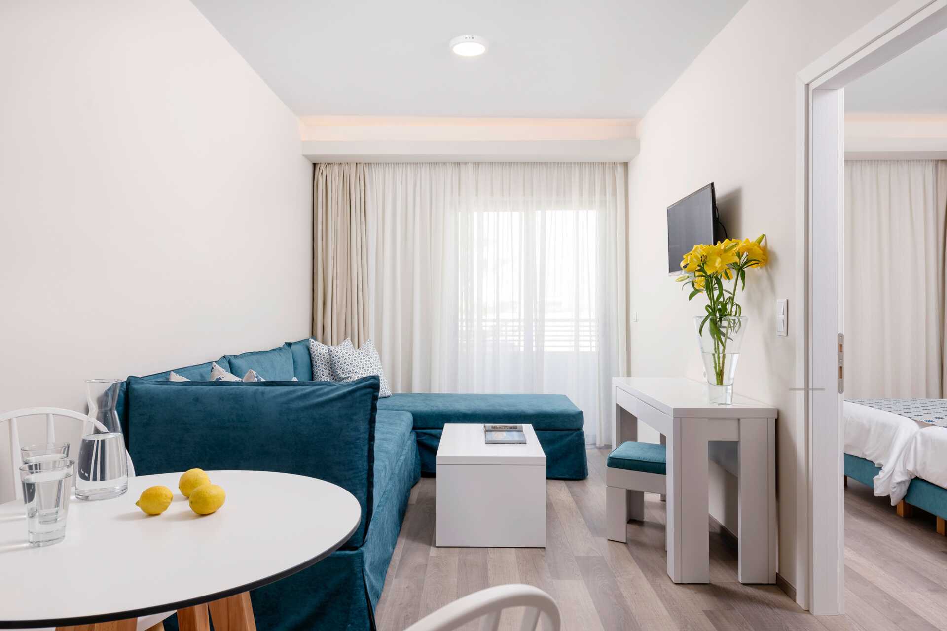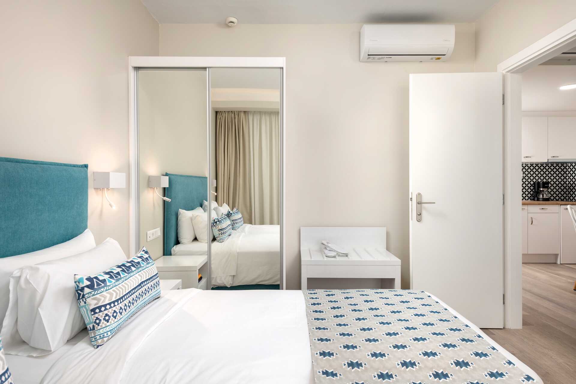 Superior tweekamerappartement met balkon of met balkon of terras met uitzicht op het zwembad. Een slaapkamer en een gecombineerde woonkamer met kitchenette. Twee eenpersoonsbedden. Mogelijke extra bedden in slaapbank. Minikeuken met kookplaten, koelkast, waterkoker, koffiezetapparaat en basiskeukengerei.. Dagelijkse bijvulling van koffie en thee. Bij aankomst staat er een fles wijn, een fles water en fruit in het appartement. Airconditioning en wifi inbegrepen. Kluis tegen betaling. TV met internationale zenders. Badjassen en slippers Föhn. Badkamer met douche en wc. Schoonmaak 7 keer/week.