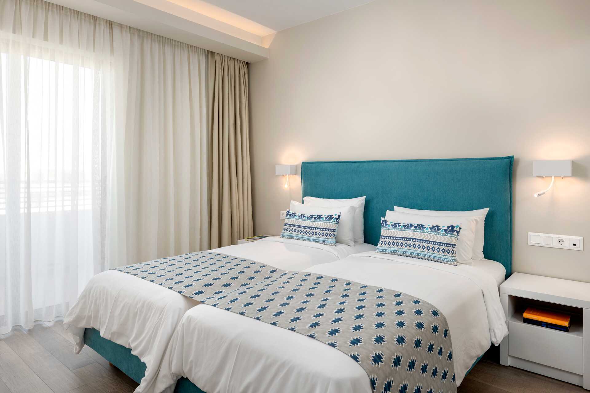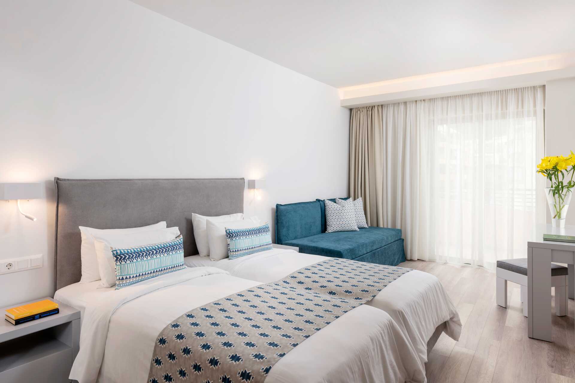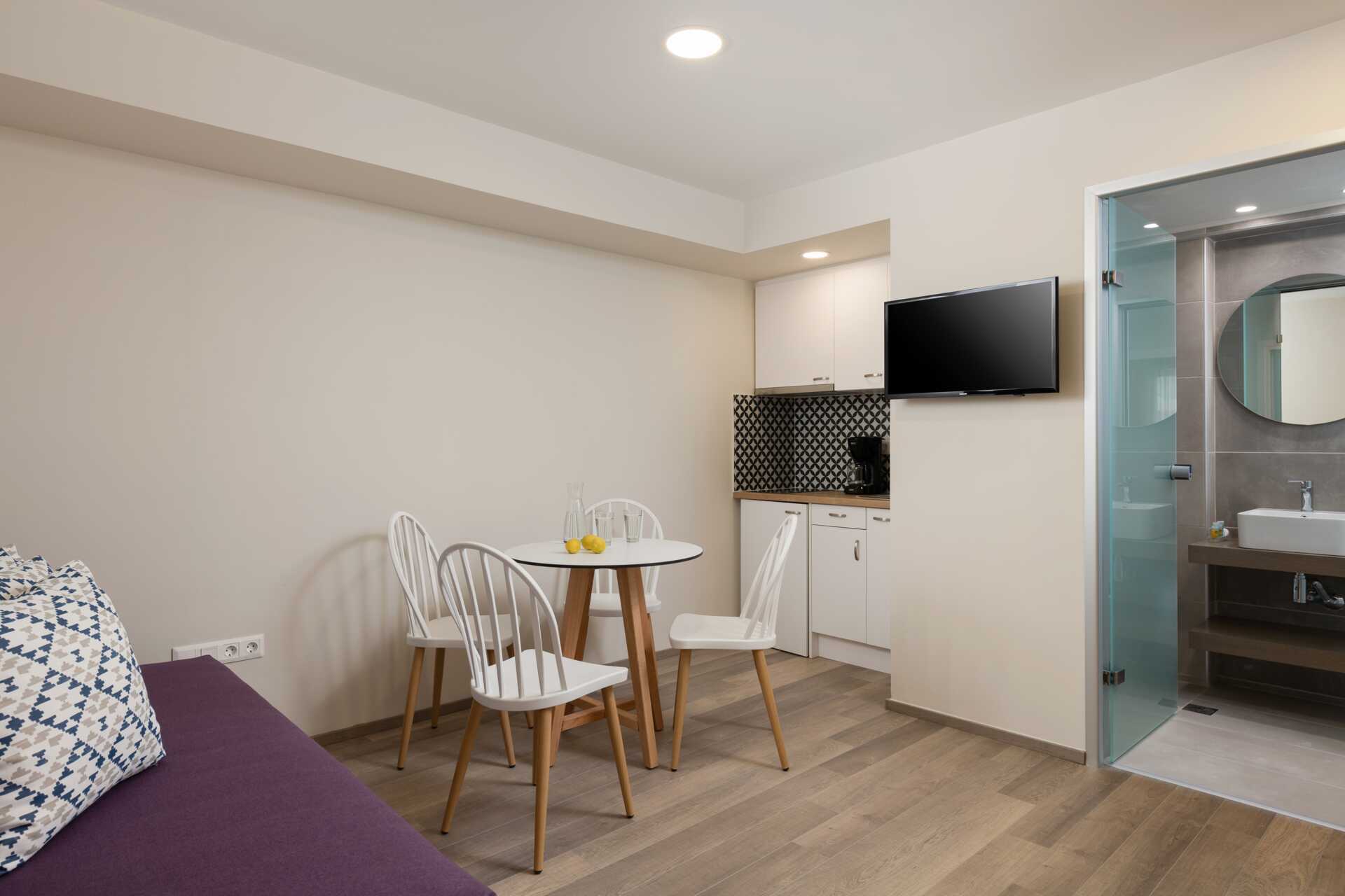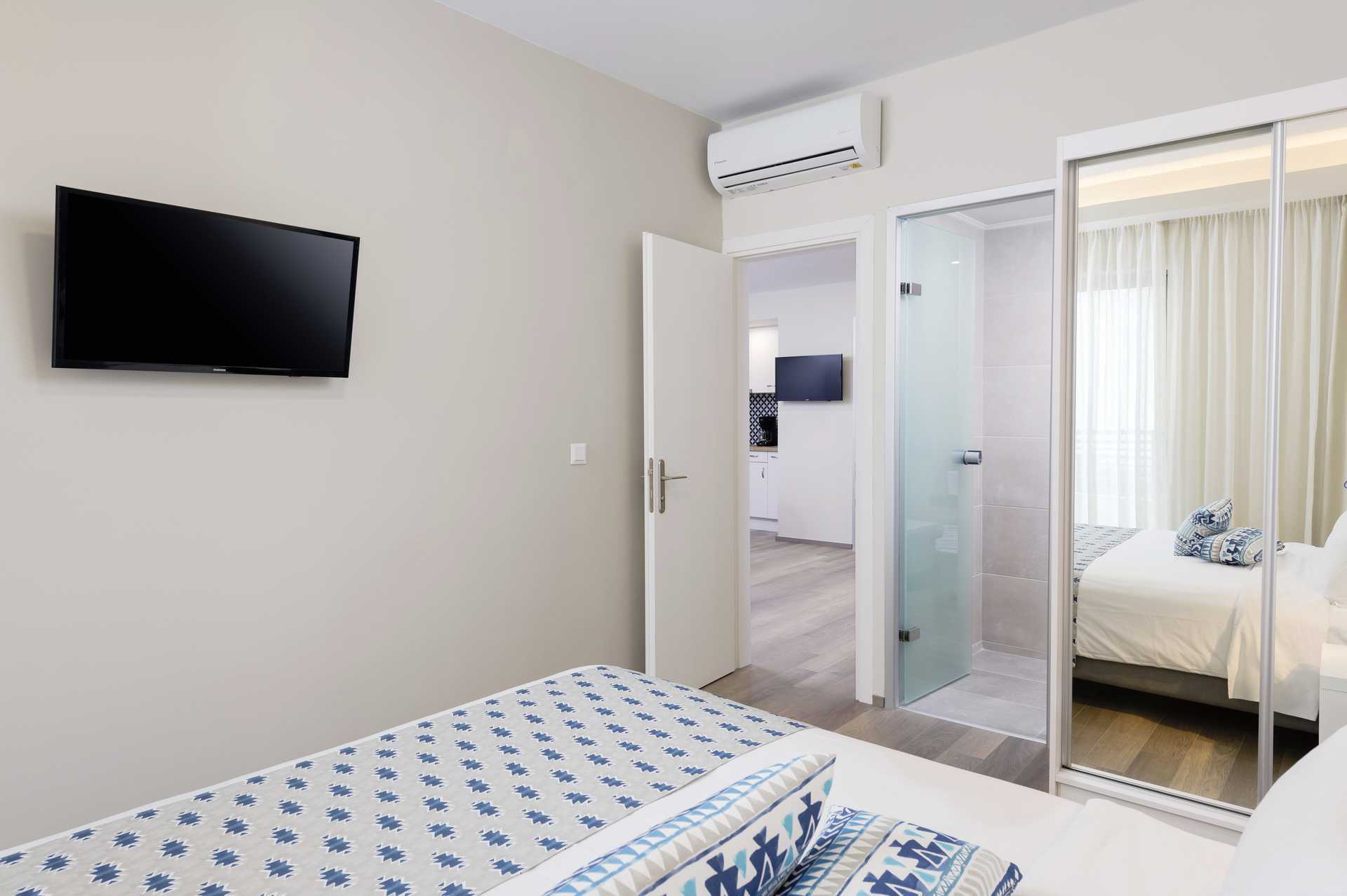 Superior tweekamerappartement met balkon of met balkon of terras met uitzicht op het zwembad. Een slaapkamer en een gecombineerde woonkamer met kitchenette. Twee eenpersoonsbedden. Mogelijke extra bedden in slaapbank. Minikeuken met kookplaten, koelkast, waterkoker, koffiezetapparaat en basiskeukengerei.. Dagelijkse bijvulling van koffie en thee. Bij aankomst staat er een fles wijn, een fles water en fruit in het appartement. Airconditioning en wifi inbegrepen. Kluis tegen betaling. TV met internationale zenders. Badjassen en slippers Föhn. Badkamer met douche en wc. Schoonmaak 7 keer/week.