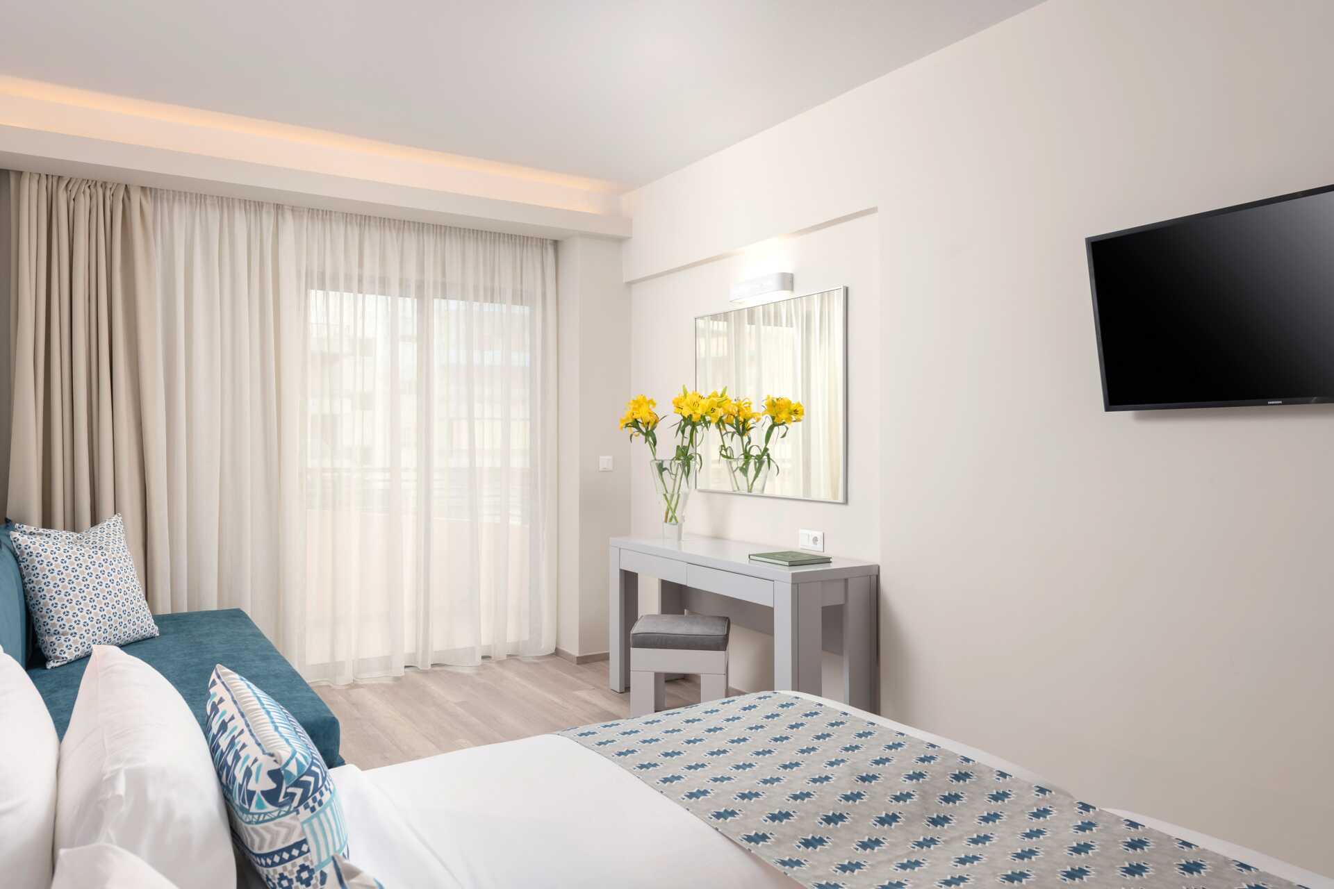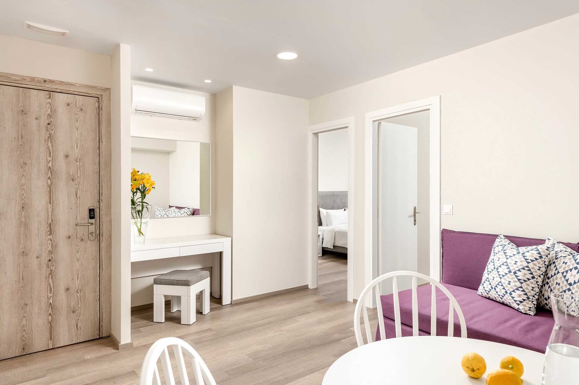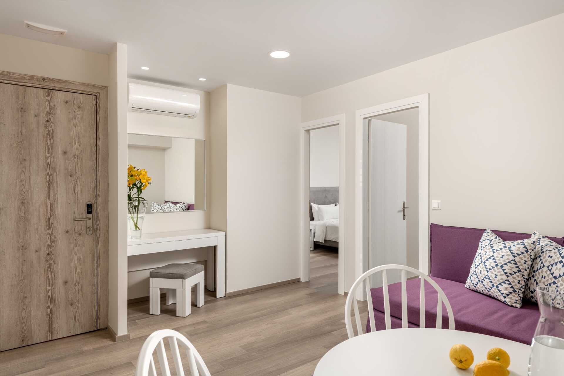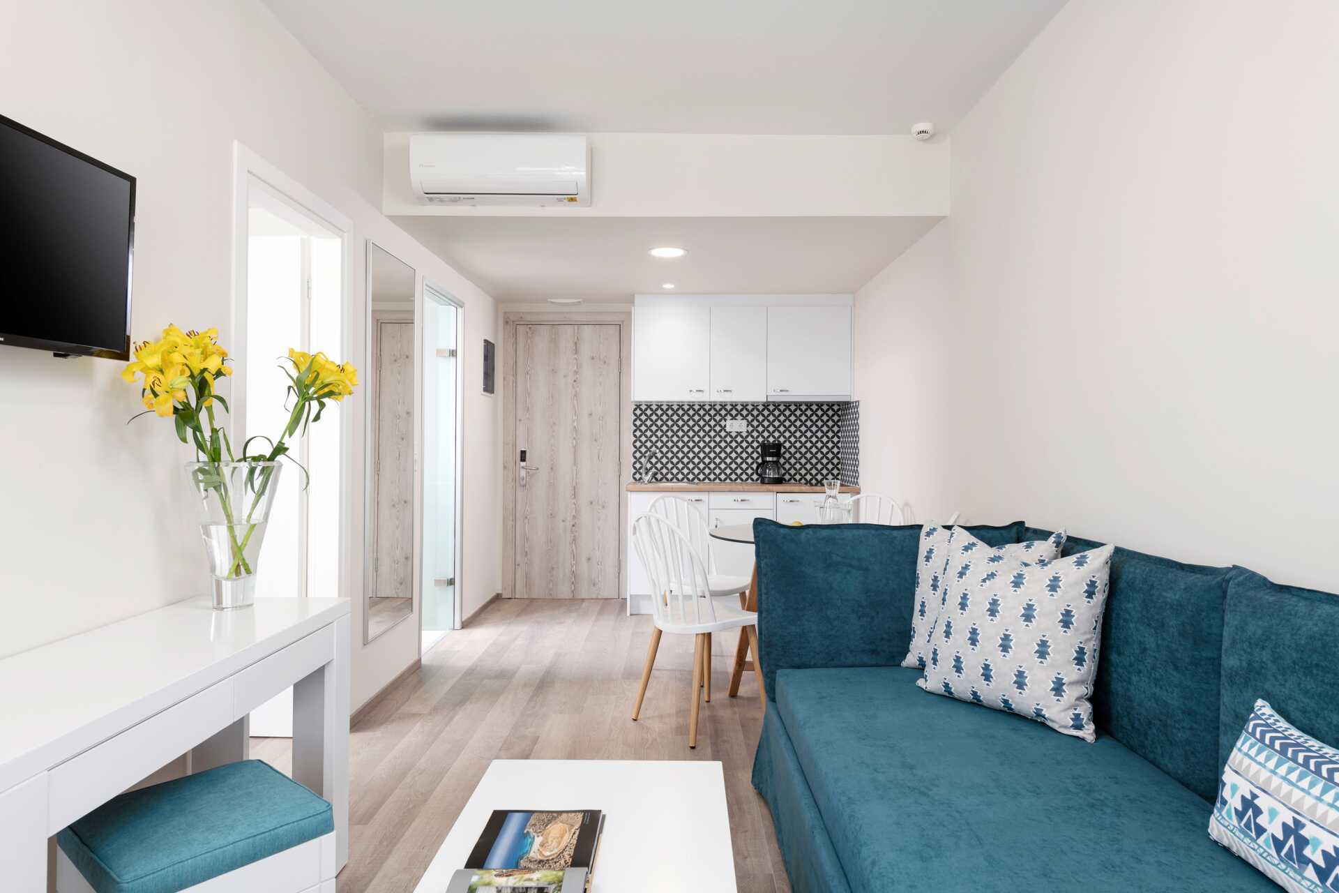 Superior tweekamerappartement met balkon of met balkon of terras met uitzicht op het zwembad. Een slaapkamer en een gecombineerde woonkamer met kitchenette. Twee eenpersoonsbedden. Mogelijke extra bedden in slaapbank. Minikeuken met kookplaten, koelkast, waterkoker, koffiezetapparaat en basiskeukengerei.. Dagelijkse bijvulling van koffie en thee. Bij aankomst staat er een fles wijn, een fles water en fruit in het appartement. Airconditioning en wifi inbegrepen. Kluis tegen betaling. TV met internationale zenders. Badjassen en slippers Föhn. Badkamer met douche en wc. Schoonmaak 7 keer/week.