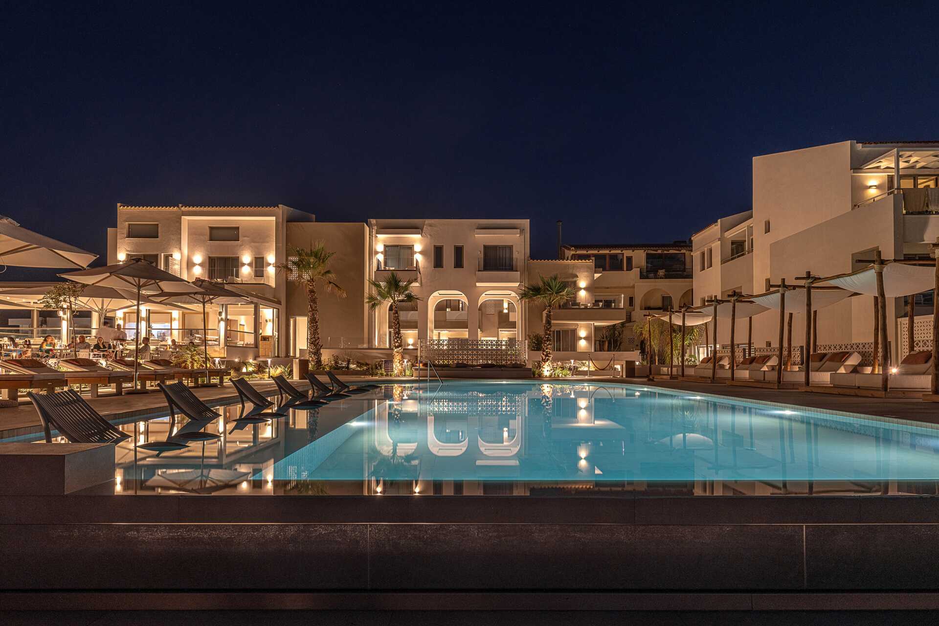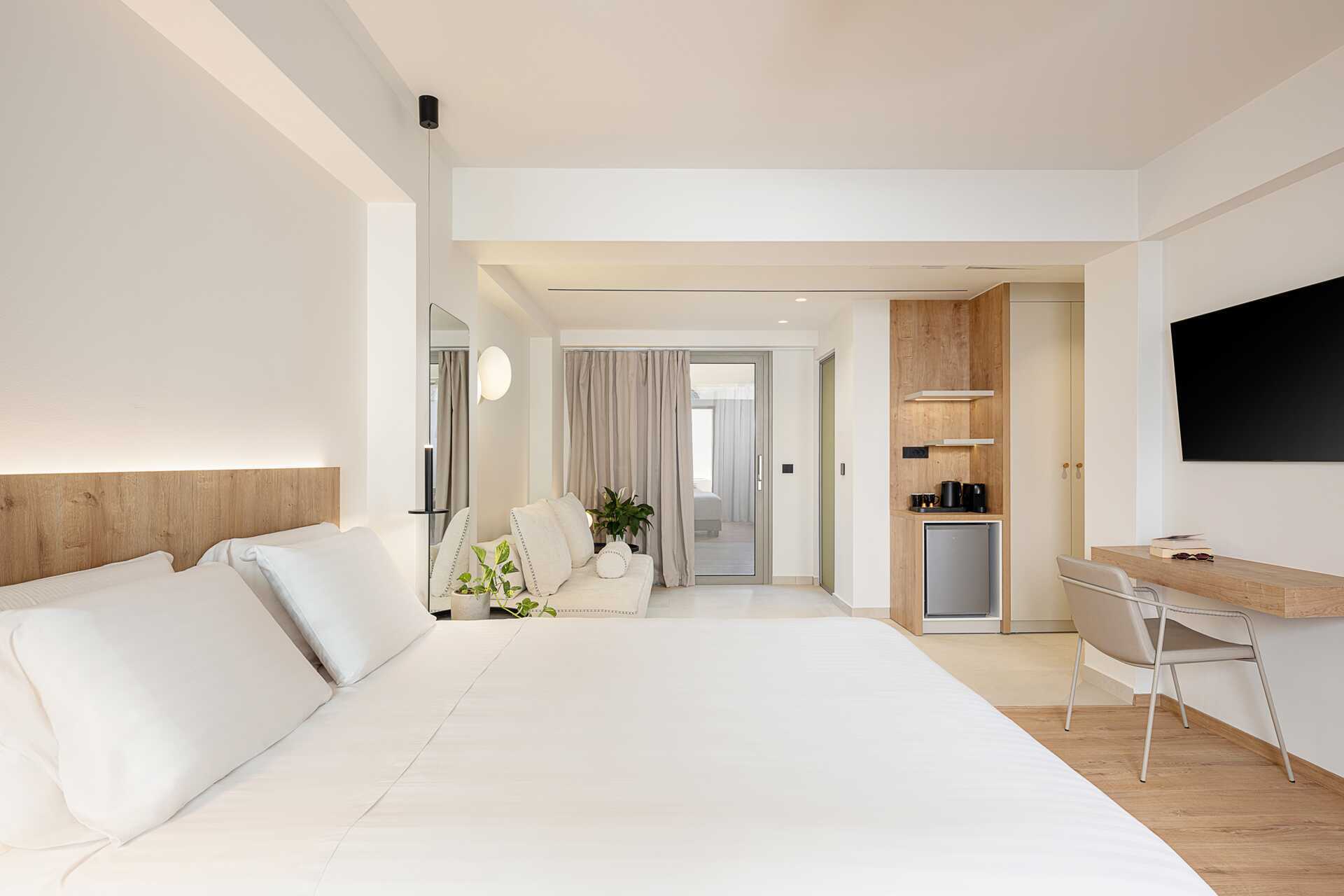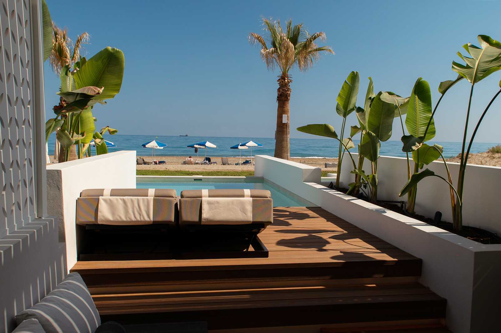 Studio met terras, privézwembad en uitzicht op zee. Op het terras staan twee ligstoelen. Slaapkamer en gecombineerde woonkamer met kitchenette. Een tweepersoonsbed. Minikeuken met kookplaten, koelkast, waterkoker en eenvoudige keukenapparatuur. Wifi, airconditioning en kluisje inbegrepen. Tv met internationale zenders. Föhn. Badkamer met douche en toilet. Schoonmaak 6 keer/week. Kinderen jonger dan twee jaar zijn inbegrepen in het maximale aantal personen in het appartement.