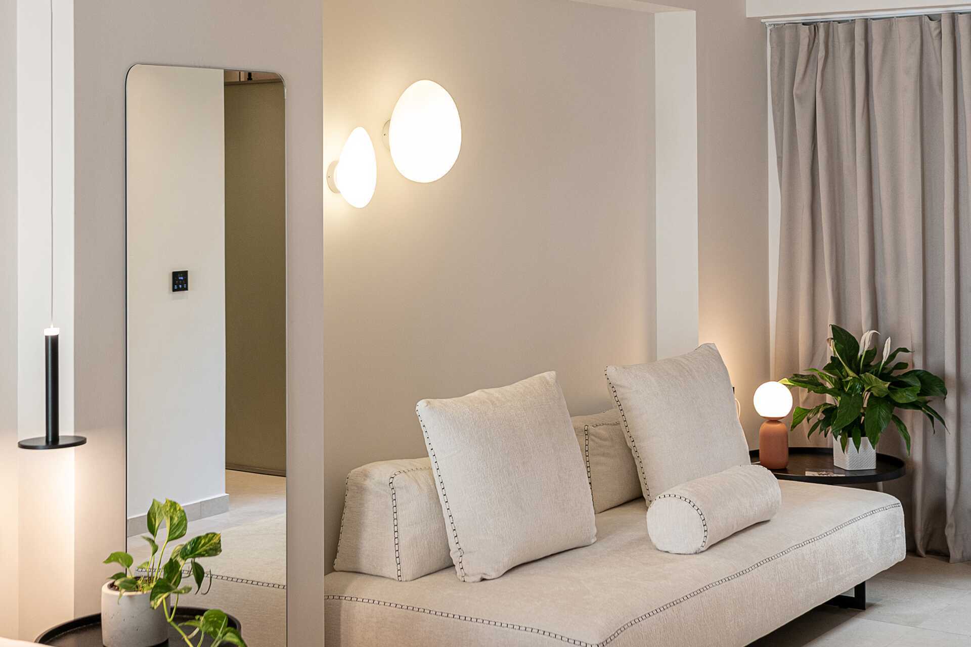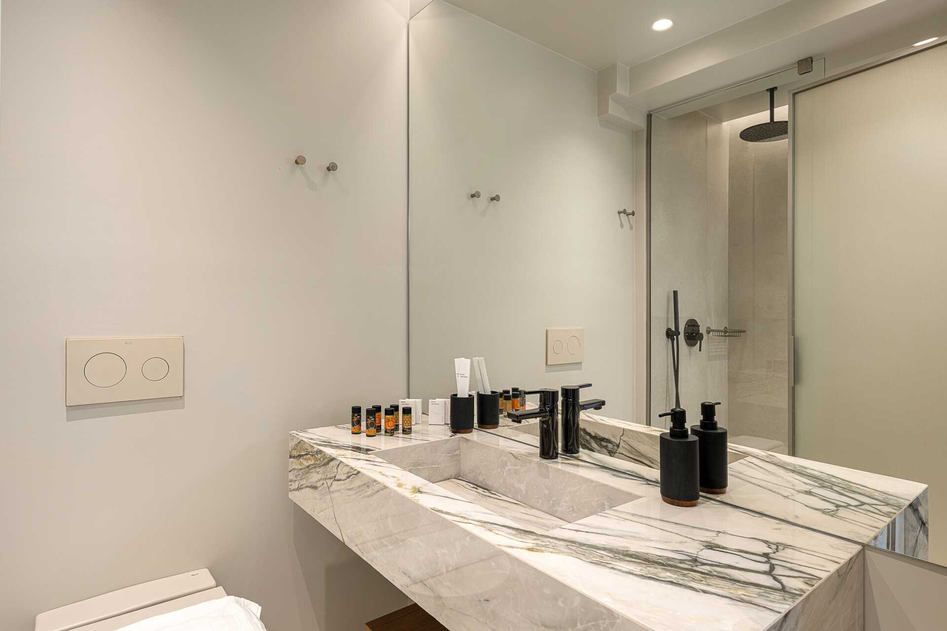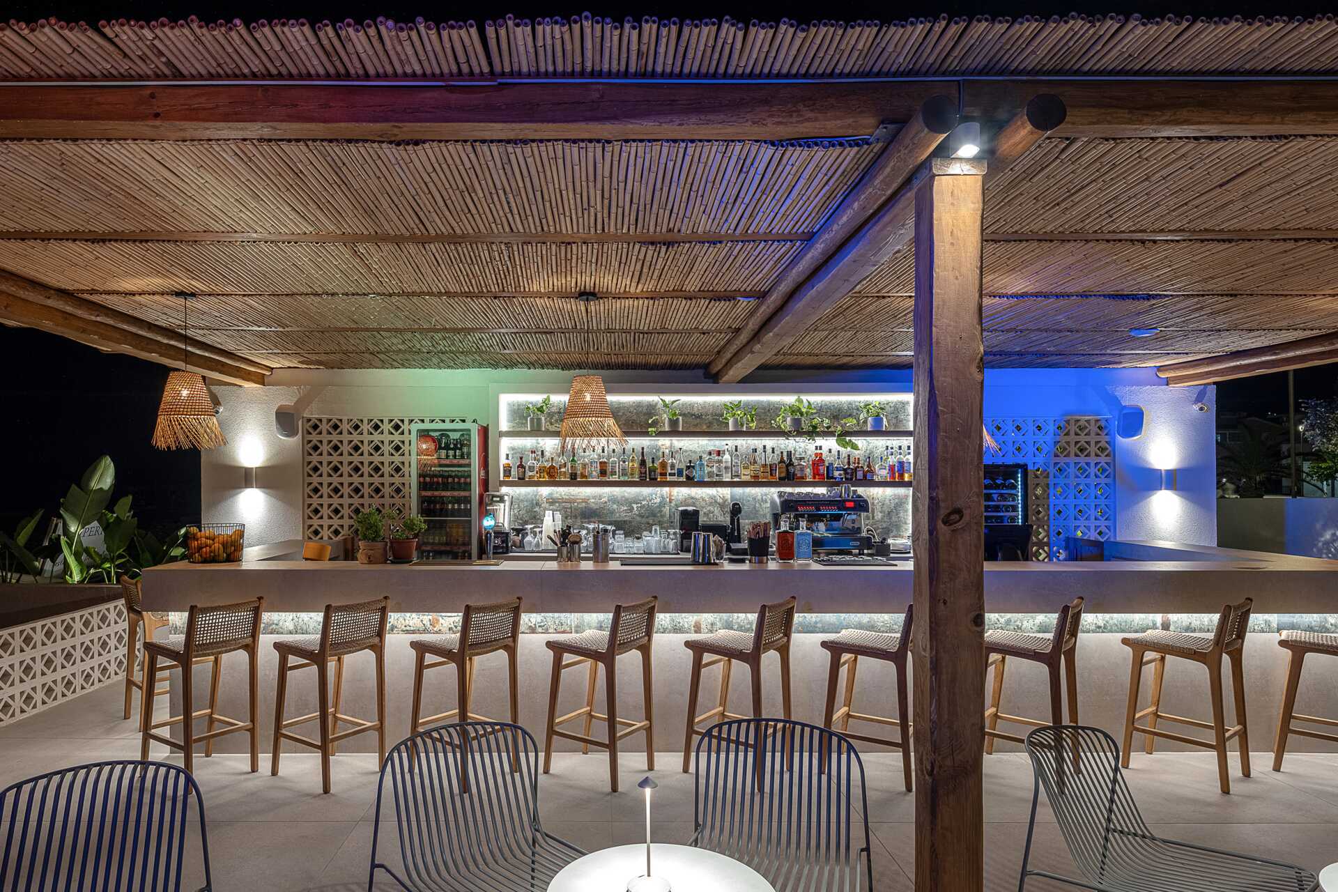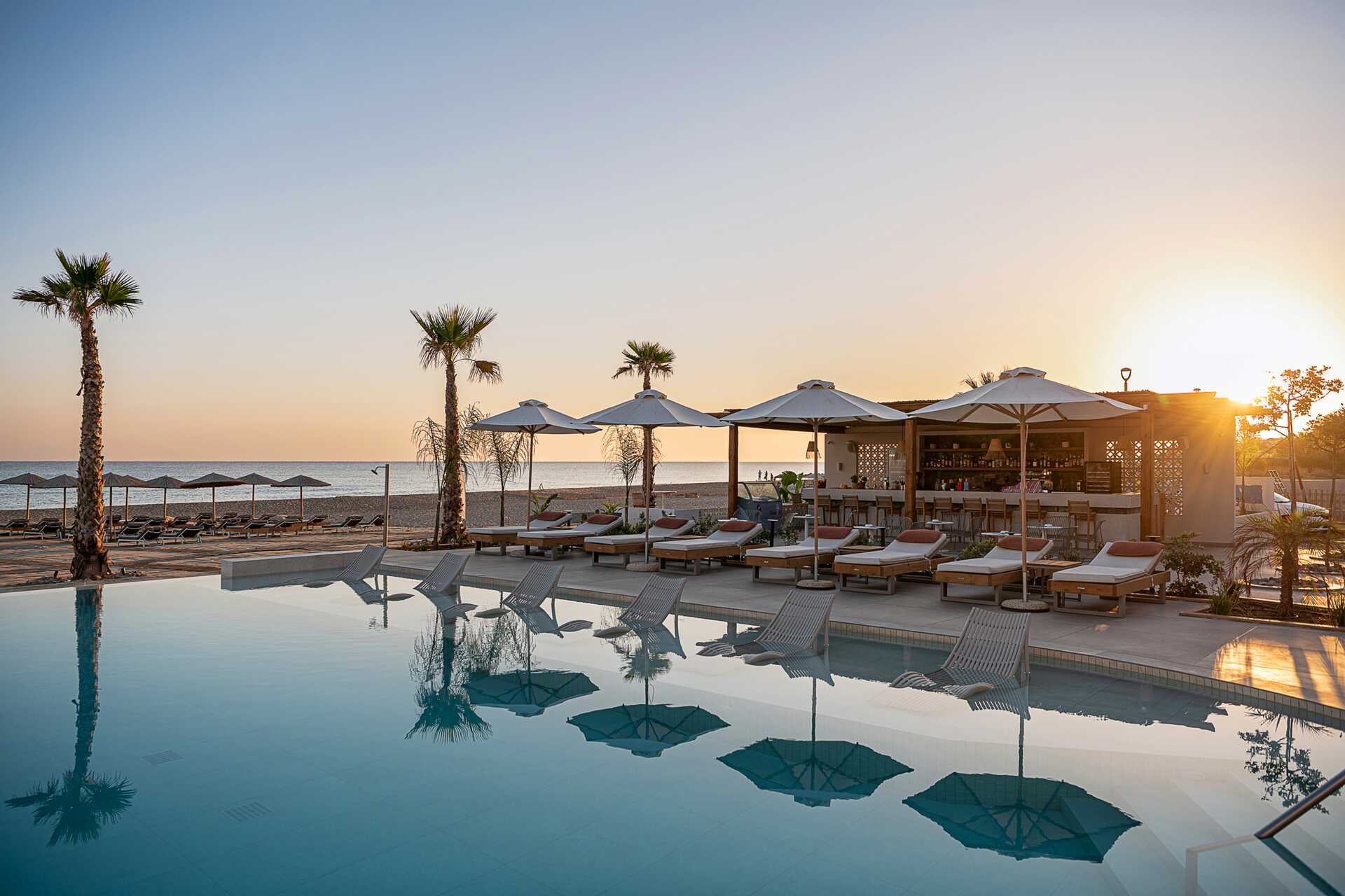 Studio met terras, privézwembad en uitzicht op zee. Op het terras staan twee ligstoelen. Slaapkamer en gecombineerde woonkamer met kitchenette. Een tweepersoonsbed. Minikeuken met kookplaten, koelkast, waterkoker en eenvoudige keukenapparatuur. Wifi, airconditioning en kluisje inbegrepen. Tv met internationale zenders. Föhn. Badkamer met douche en toilet. Schoonmaak 6 keer/week. Kinderen jonger dan twee jaar zijn inbegrepen in het maximale aantal personen in het appartement.
