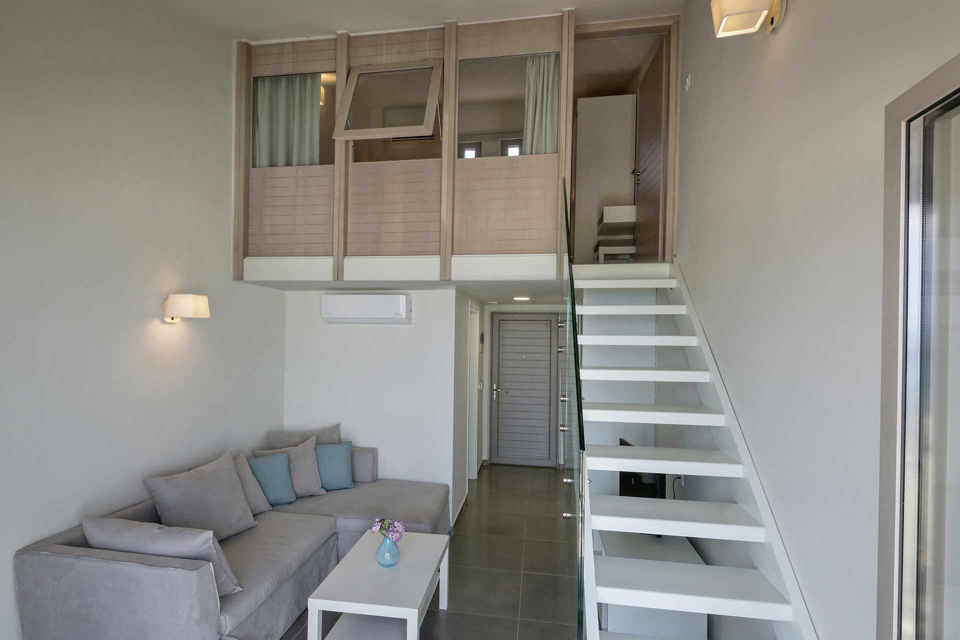 Tweekamerappartementen met balkon en uitzicht op zee. Horren in de balkondeuren. Op de entreeverdieping bevindt zich een gecombineerde woonkamer met een mini-keuken met kookplaten, koelkast, waterkoker en eenvoudige keukenapparatuur. Mogelijkheid voor extra bedden in slaapbank. Boven een slaapkamer met een tweepersoonsbed. Wifi, airconditioning en kluisje inbegrepen. Tv met internationale zenders. Föhn. Badkamer met douche en toilet. Schoonmaak 6 keer/week. Kinderen jonger dan twee jaar zijn inbegrepen in het maximale aantal personen in het appartement.