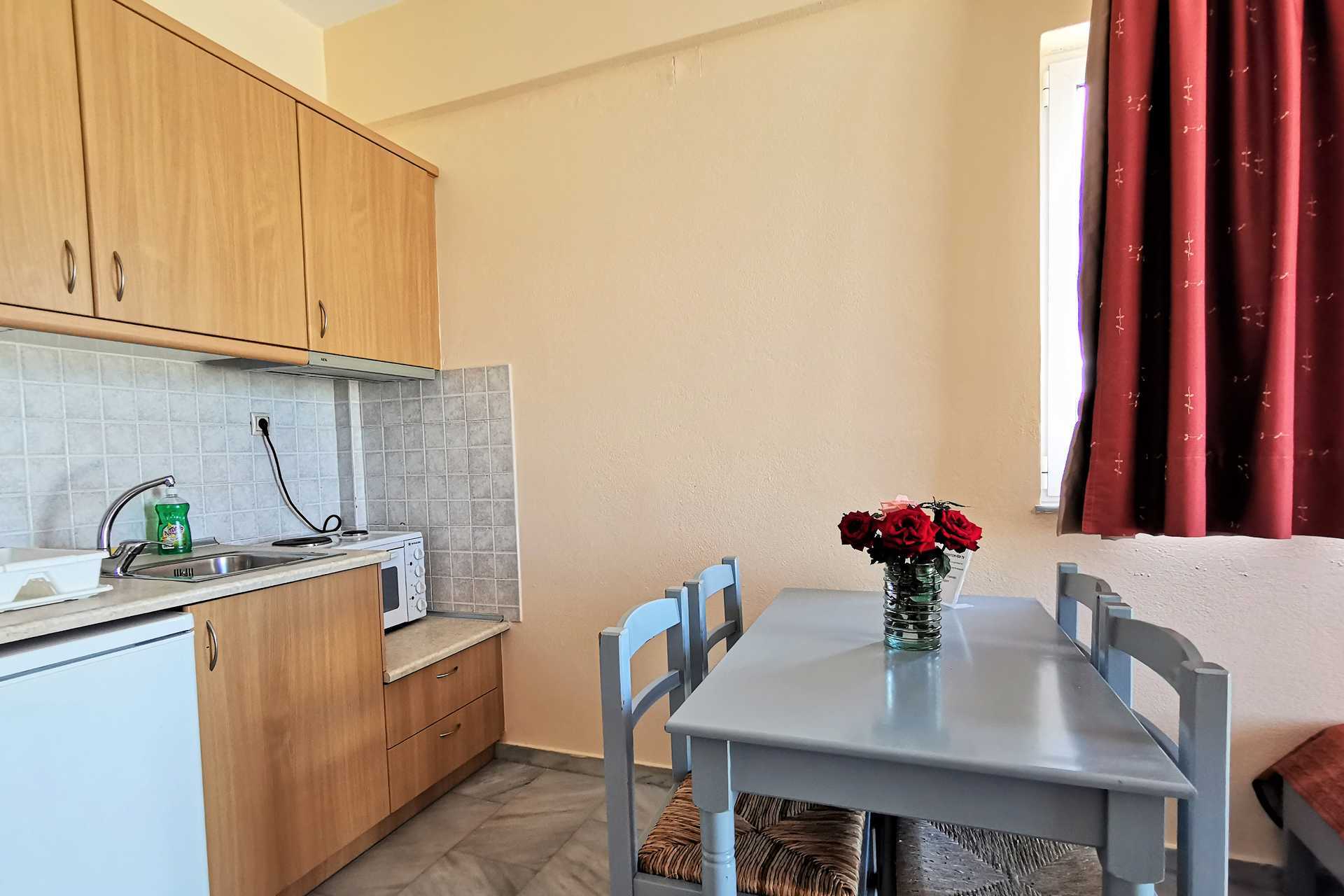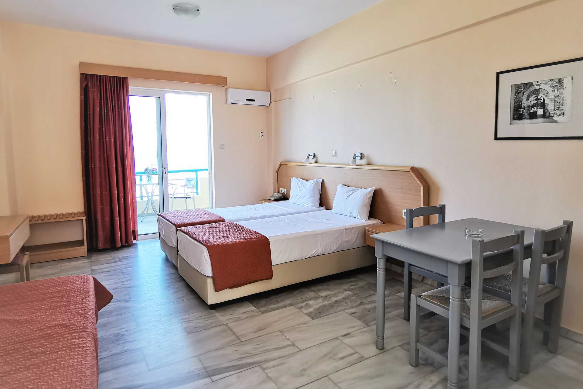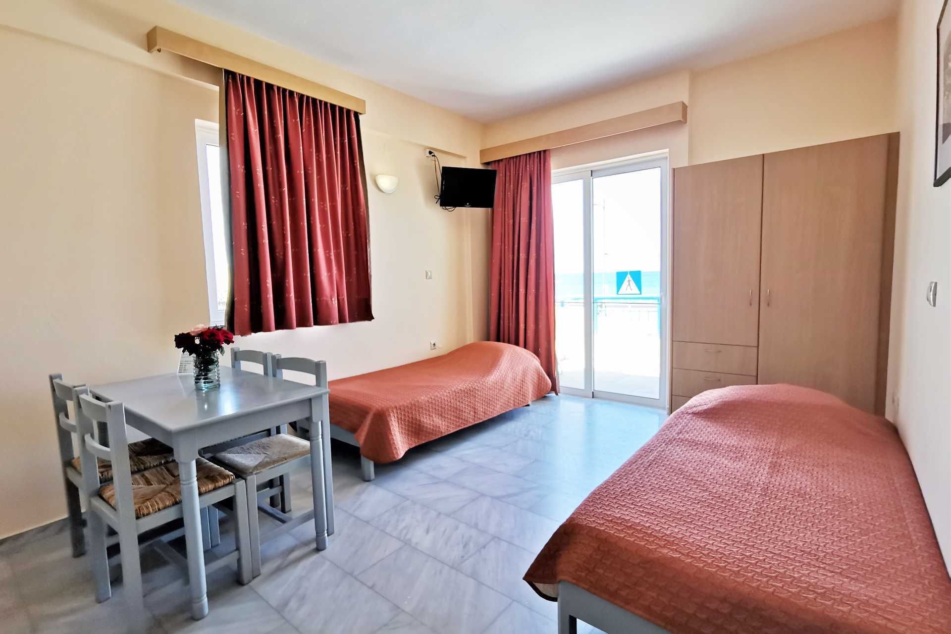 Studio's, balkon en uitzicht op zee. Slaapkamer gecombineerd met mini-keuken. Twee eenpersoonsbedden. Mogelijkheid voor extra bed in slaapbank. Minikeuken met kookplaten, koelkast, koffiezetapparaat, kleine oven en basiskeukengerei. Wifi en airconditioning inbegrepen. Kluisje tegen betaling. Tv met internationale zenders. Kleine badkamer met douche en toilet. Schoonmaak 6 keer per/week.