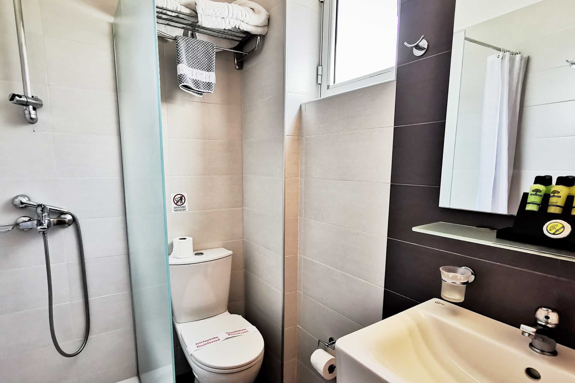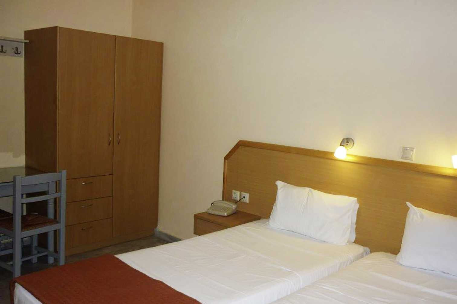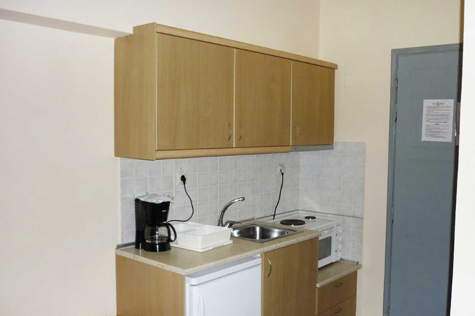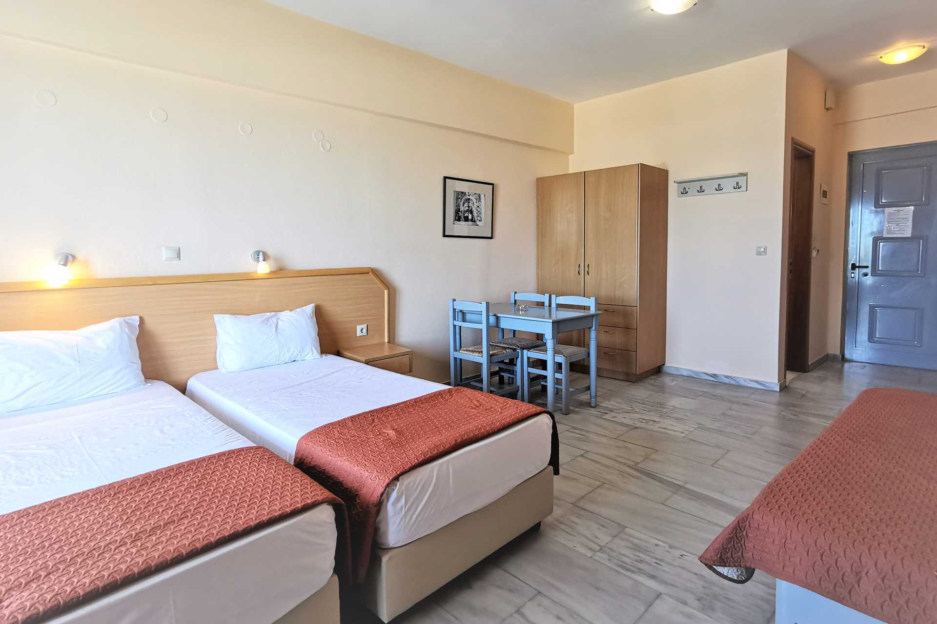 Studio's, balkon en uitzicht op zee. Slaapkamer gecombineerd met mini-keuken. Twee eenpersoonsbedden. Mogelijkheid voor extra bed in slaapbank. Minikeuken met kookplaten, koelkast, koffiezetapparaat, kleine oven en basiskeukengerei. Wifi en airconditioning inbegrepen. Kluisje tegen betaling. Tv met internationale zenders. Kleine badkamer met douche en toilet. Schoonmaak 6 keer per/week.