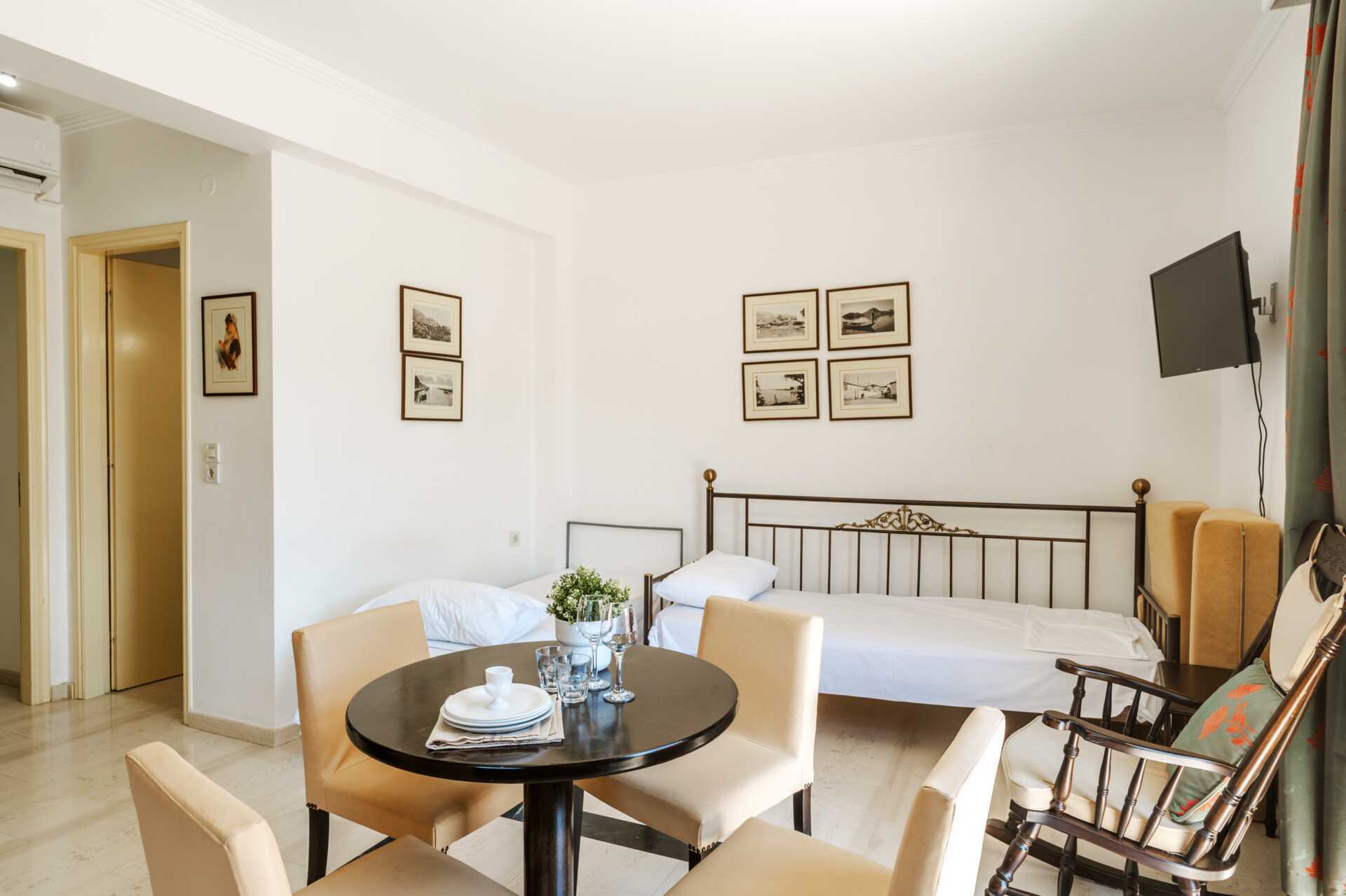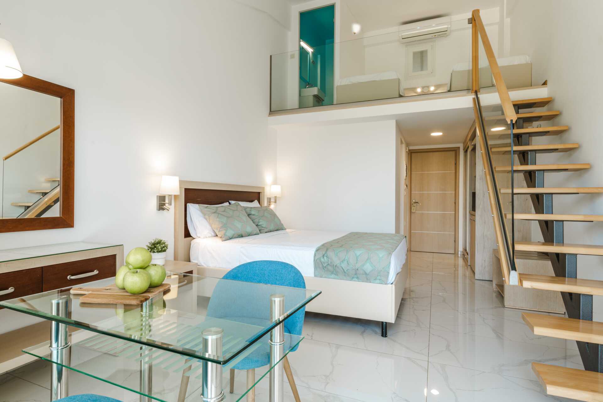 Eenkamerappartement met balkon en uitzicht op het zwembad. Het appartement bevindt zich in het nieuwe gedeelte van het hotel. Op de begane grond is er een tweepersoonsbed, een minikeuken en een apart toilet. Boven is er een slaapzolder met twee eenpersoonsbedden en een badkamer. Minikeuken met kookplaat, koelkast, waterkoker en basiskeukengerei. Wifi, airconditioning en kluisje inbegrepen. Tv met lokale zenders. Badkamer met bad of douche en toilet. Schoonmaak 6 keer / week.