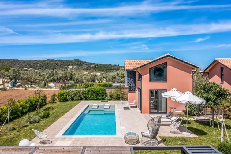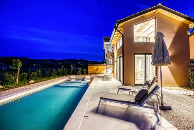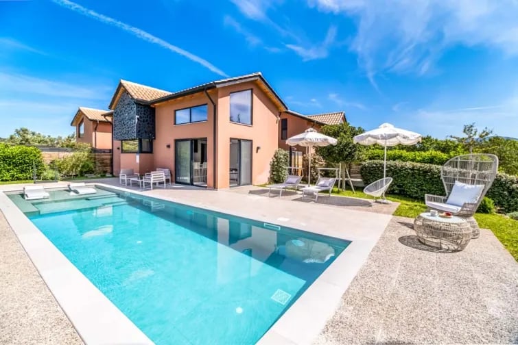 Het absolute hoogtepunt van de prachtige buitenruimte is ongetwijfeld uw privézwembad: een azuurblauwe oase, ideaal om in stijl te ontspannen en af te koelen. Of je nu met een zonnebril op en een boek in de hand op een ligstoel bij het zwembad zit of een ontspannen duik neemt in het helderblauwe water, je waant je in het paradijs terwijl je buiten bent.