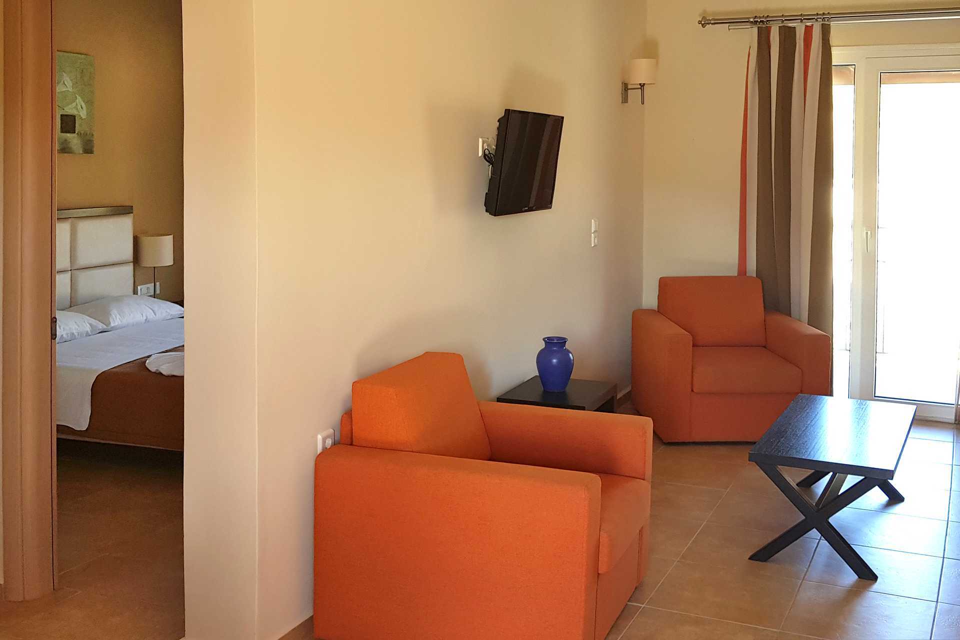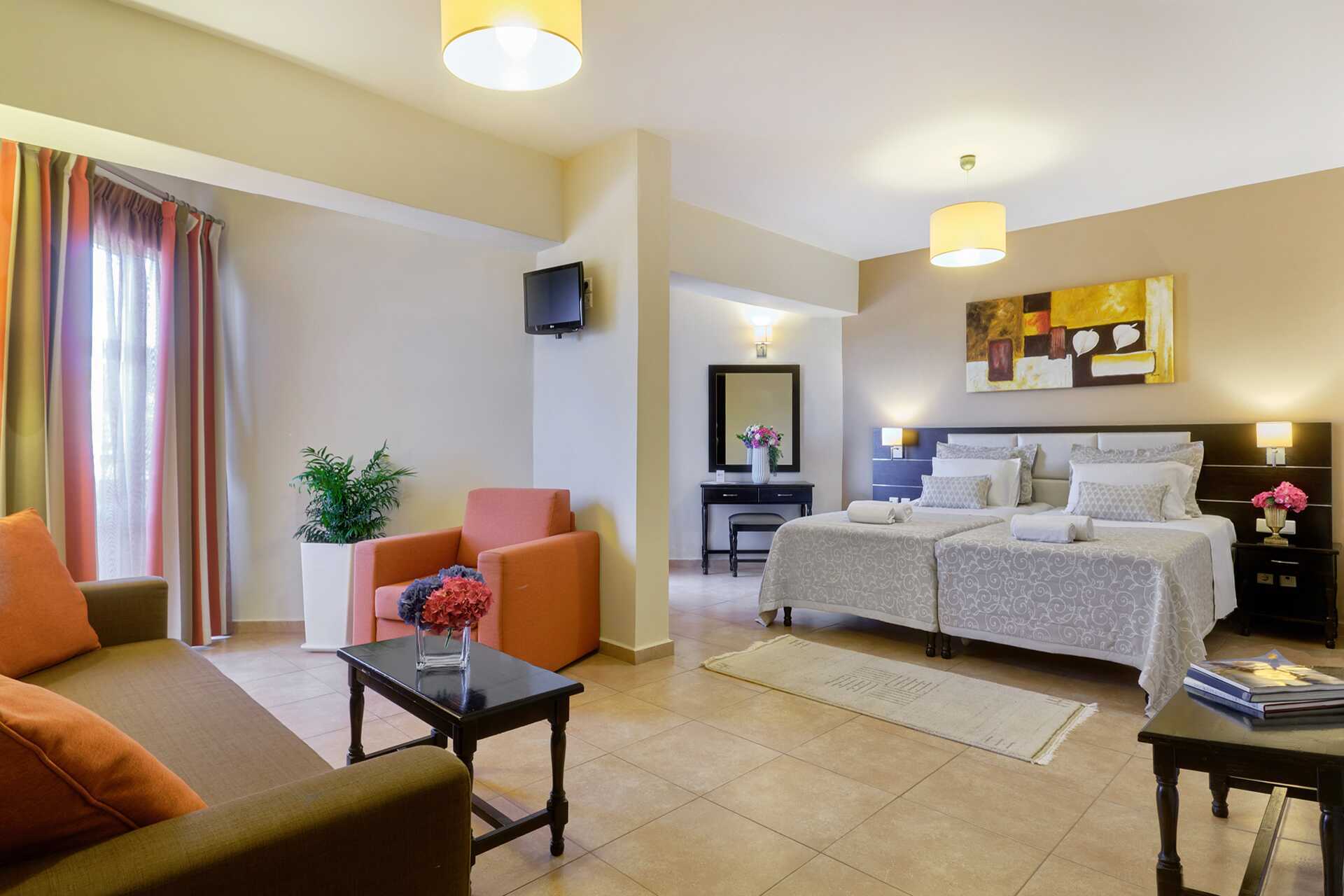 Familiekamer met balkon. De familiekamer bestaat uit een slaapkamer met twee eenpersoonsbedden en een woonkamer met de mogelijkheid tot extra bedden op een slaapbank. Wifi, airconditioning en kluisje inbegrepen. Koelkast. Waterkoker, koffie en thee. Nespresso-apparaat. Tv met satellietzenders. Hotelslippers. Föhn. Badkamer met douche en toilet. Schoonmaak 7 keer/week.