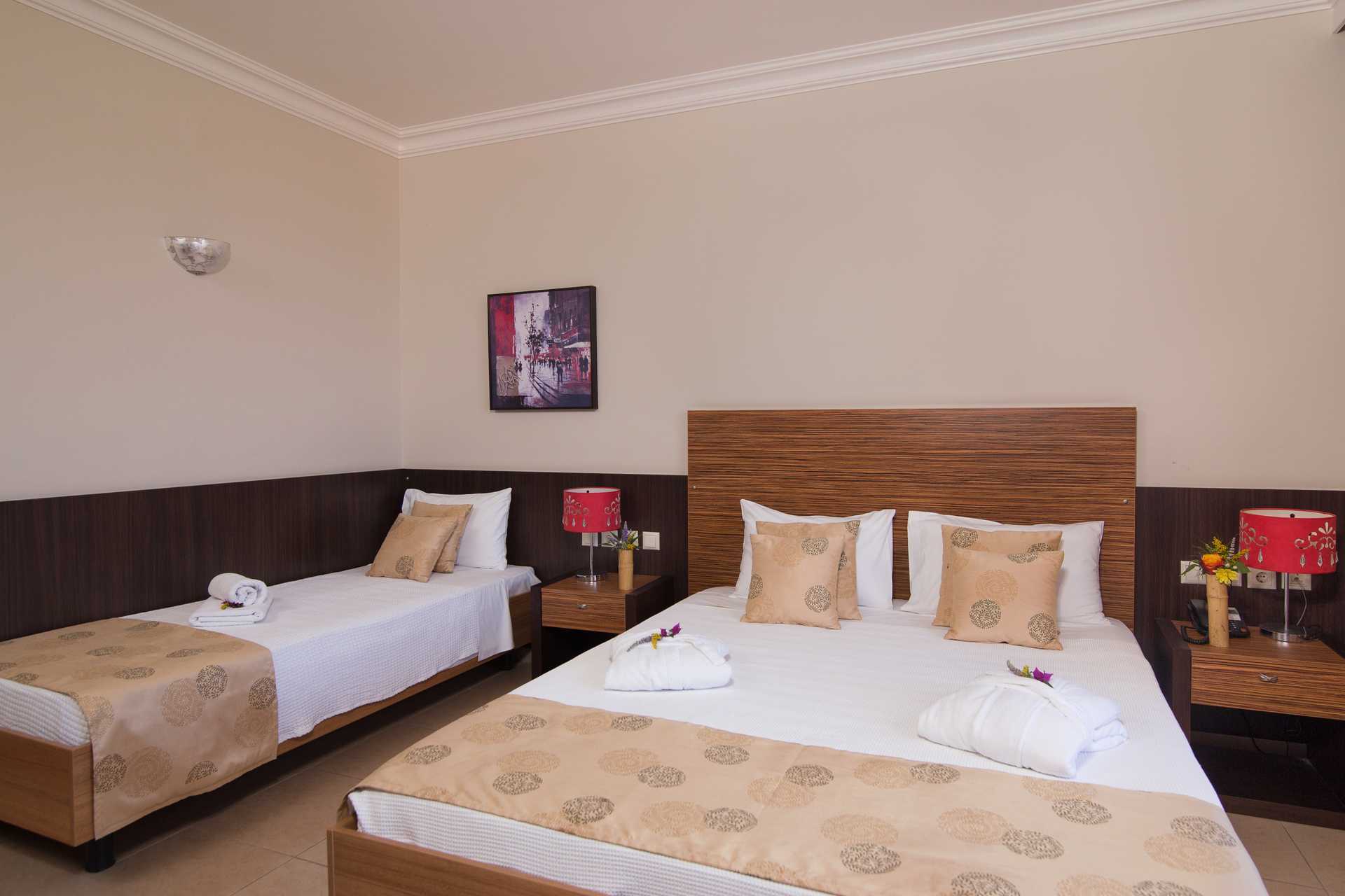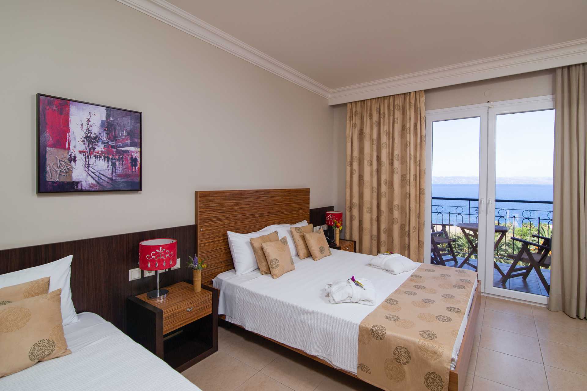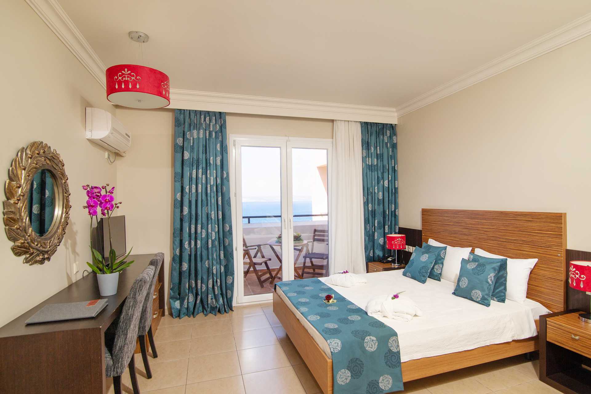 Tweepersoonskamer met balkon met uitzicht op zee. Een tweepersoonsbed of twee eenpersoonsbedden. Mogelijkheid tot een extra bed in de vorm van een eenpersoonsbed. Wifi, airconditioning en kluisje inbegrepen. Koelkast. Waterkoker, koffie en thee. Tv met internationale zenders. Badjassen en hotelslippers. Föhn. Badkamer met bad of douche en toilet. Schoonmaak 7 keer/week.