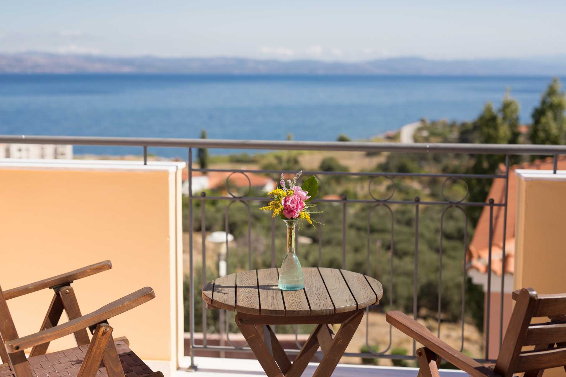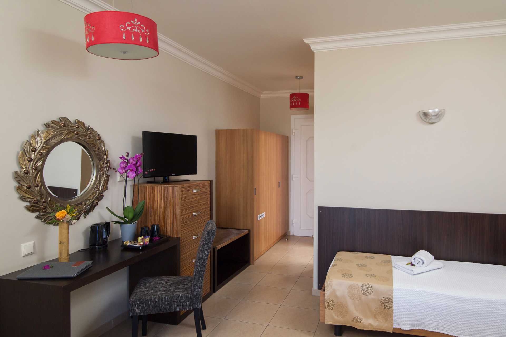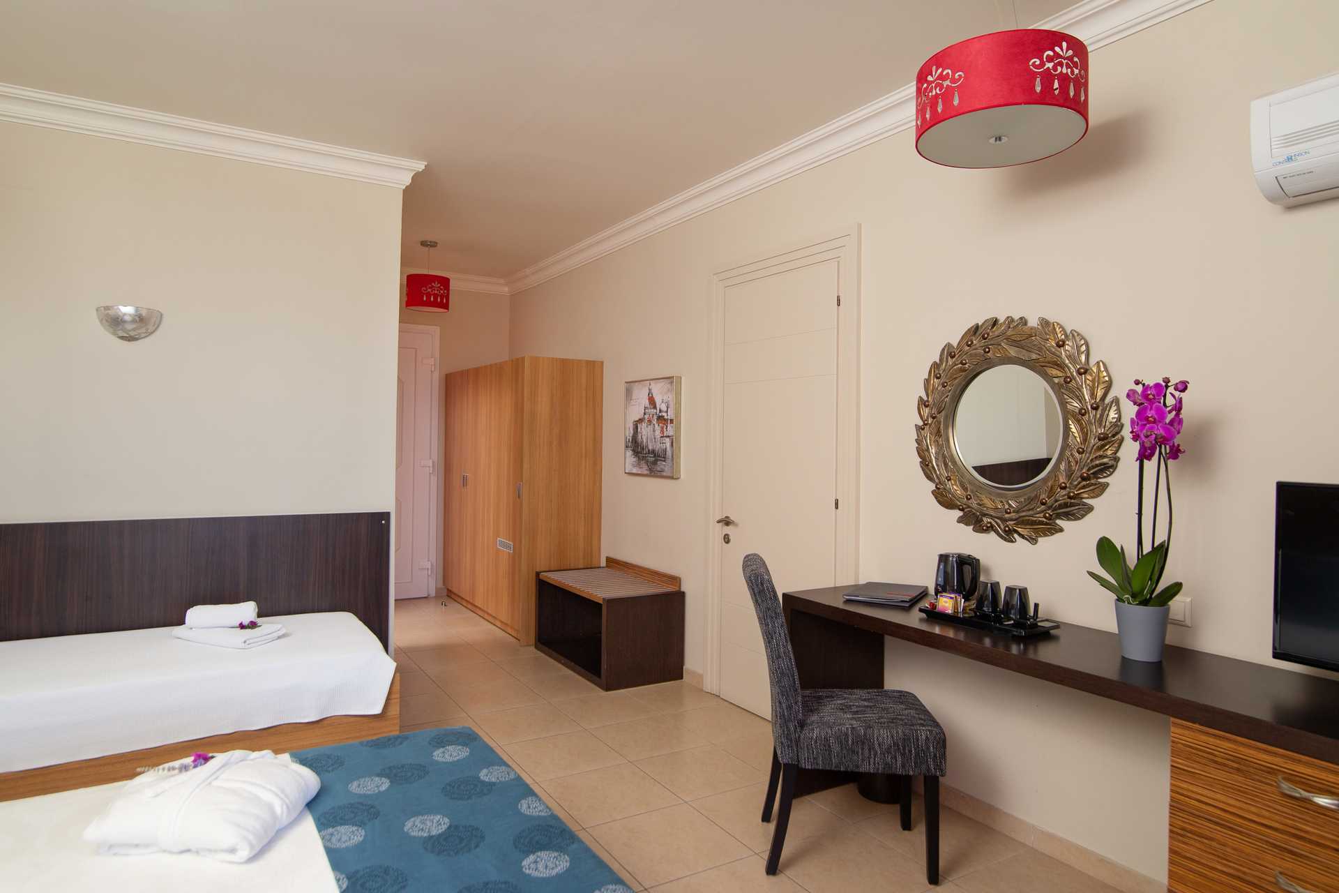 Tweepersoonskamer met balkon met uitzicht op zee. Een tweepersoonsbed of twee eenpersoonsbedden. Mogelijkheid tot een extra bed in de vorm van een eenpersoonsbed. Wifi, airconditioning en kluisje inbegrepen. Koelkast. Waterkoker, koffie en thee. Tv met internationale zenders. Badjassen en hotelslippers. Föhn. Badkamer met bad of douche en toilet. Schoonmaak 7 keer/week.