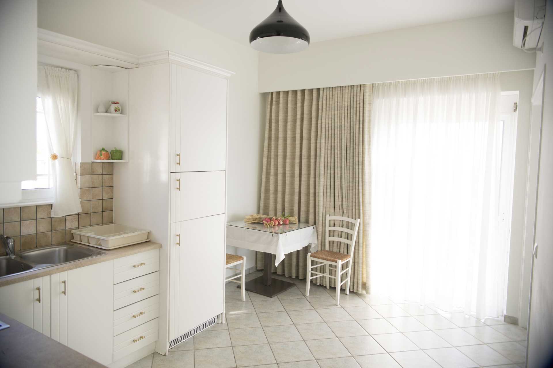 Driekamerappartement met balkon op de begane grond en uitzicht op zee. Twee slaapkamers en een gecombineerde woonkamer met kitchenette. Twee eenpersoonsbedden in elke slaapkamer. Mogelijkheid voor extra bed in de vorm van een slaapbank. Kitchenette met kookplaten, oven, koelkast, koffiezetapparaat, waterkoker, broodrooster en basiskeukengerei. Wifi en kluisje. Airconditioning tegen toeslag. TV met internationale zenders. Haardroger. Badkamer met bad en douche en toilet. Schoonmaak 5 keer per week.