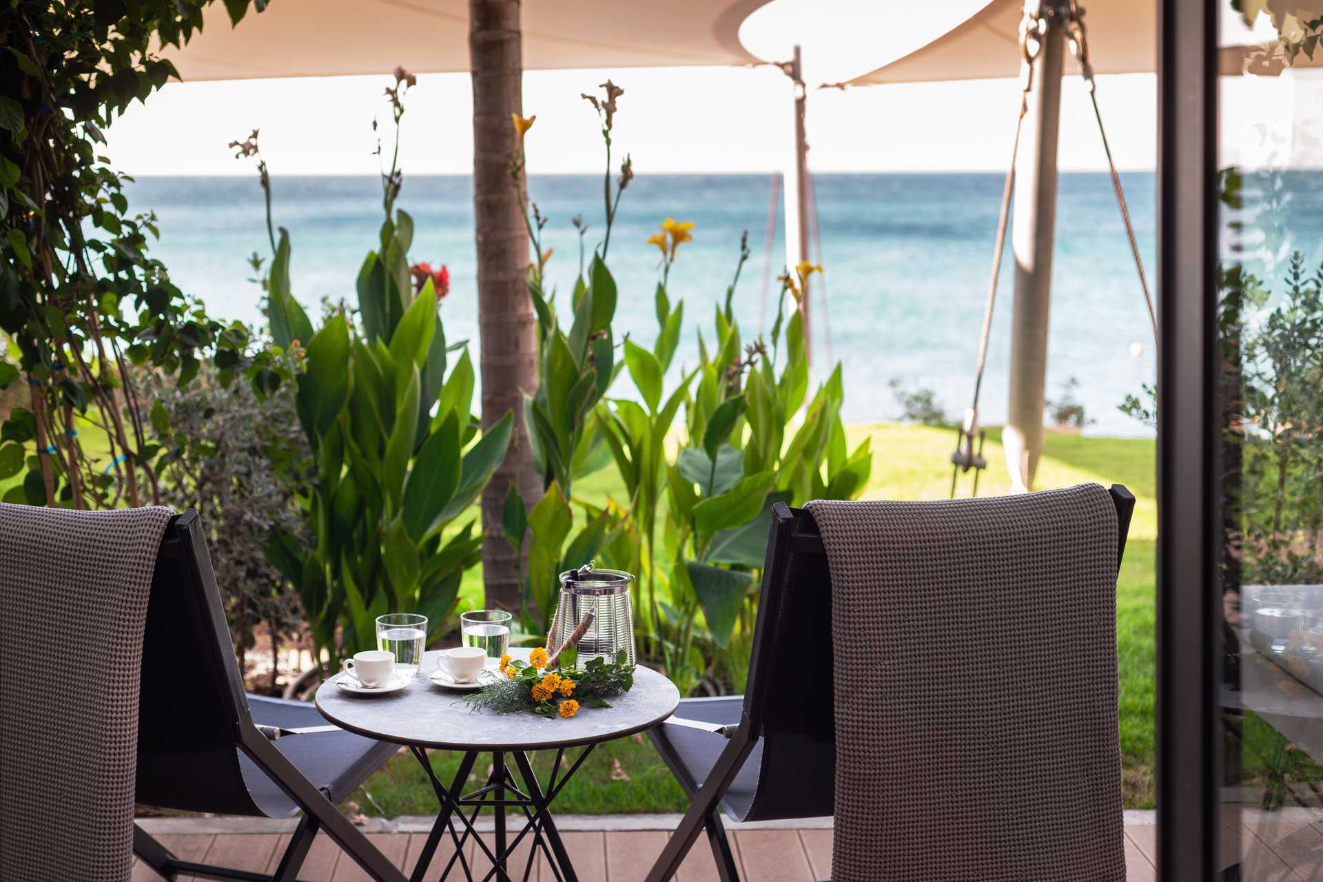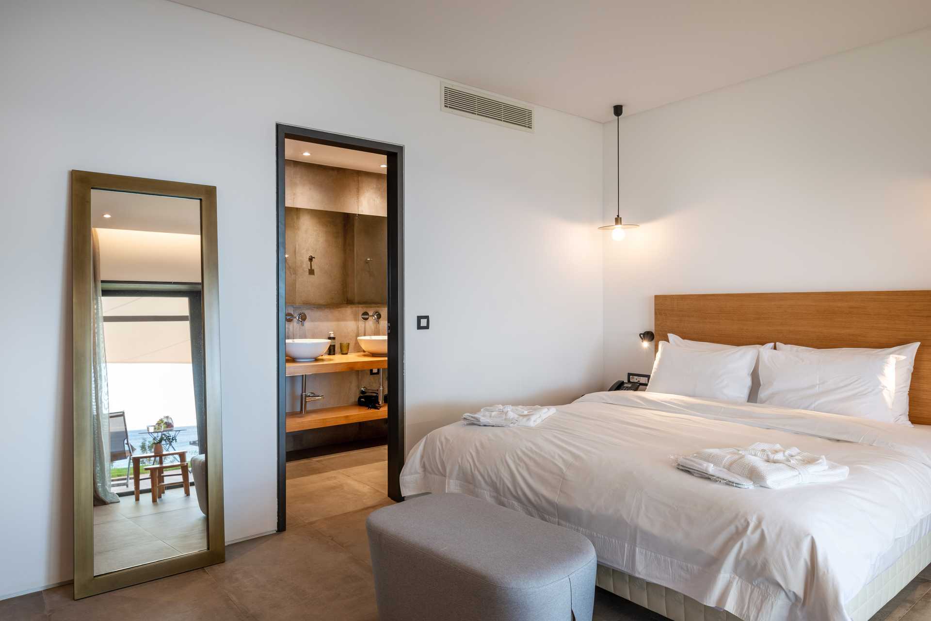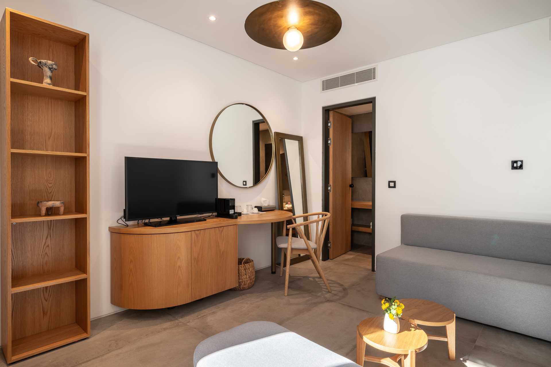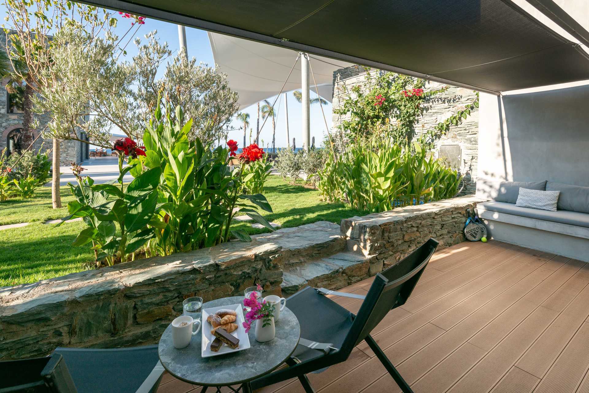 Junior suite met terras, sommige met zeezicht. Het slaapcomfort is uitzonderlijk met een comfortabel tweepersoonsbed en linnengoed van hoge kwaliteit. Wifi, airconditioning en kluisje inbegrepen. Minibar/koelkast. Nespresso-apparaat, vier koffiecapsules zijn inbegrepen, extra capsules zijn te koop bij de receptie. Er is een comfortabele zithoek in de kamer en op de patio. Bluetooth-luidsprekers kunnen tegen een toeslag worden geleend bij de receptie. Haardroger. Badkamer met douche en toilet. Om de dag schoonmaak.