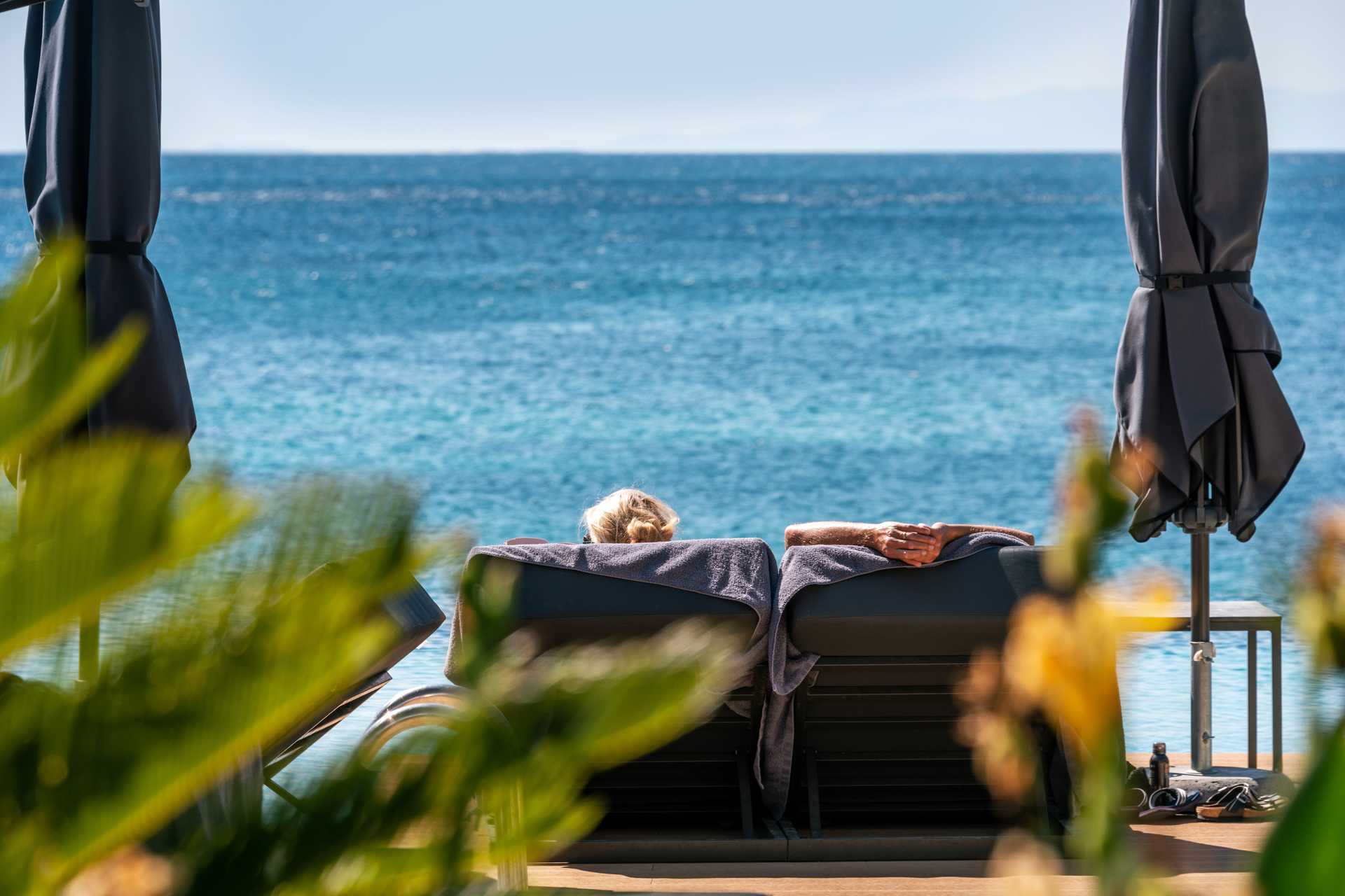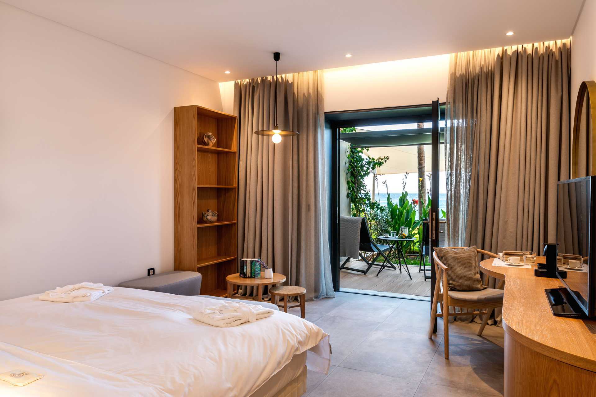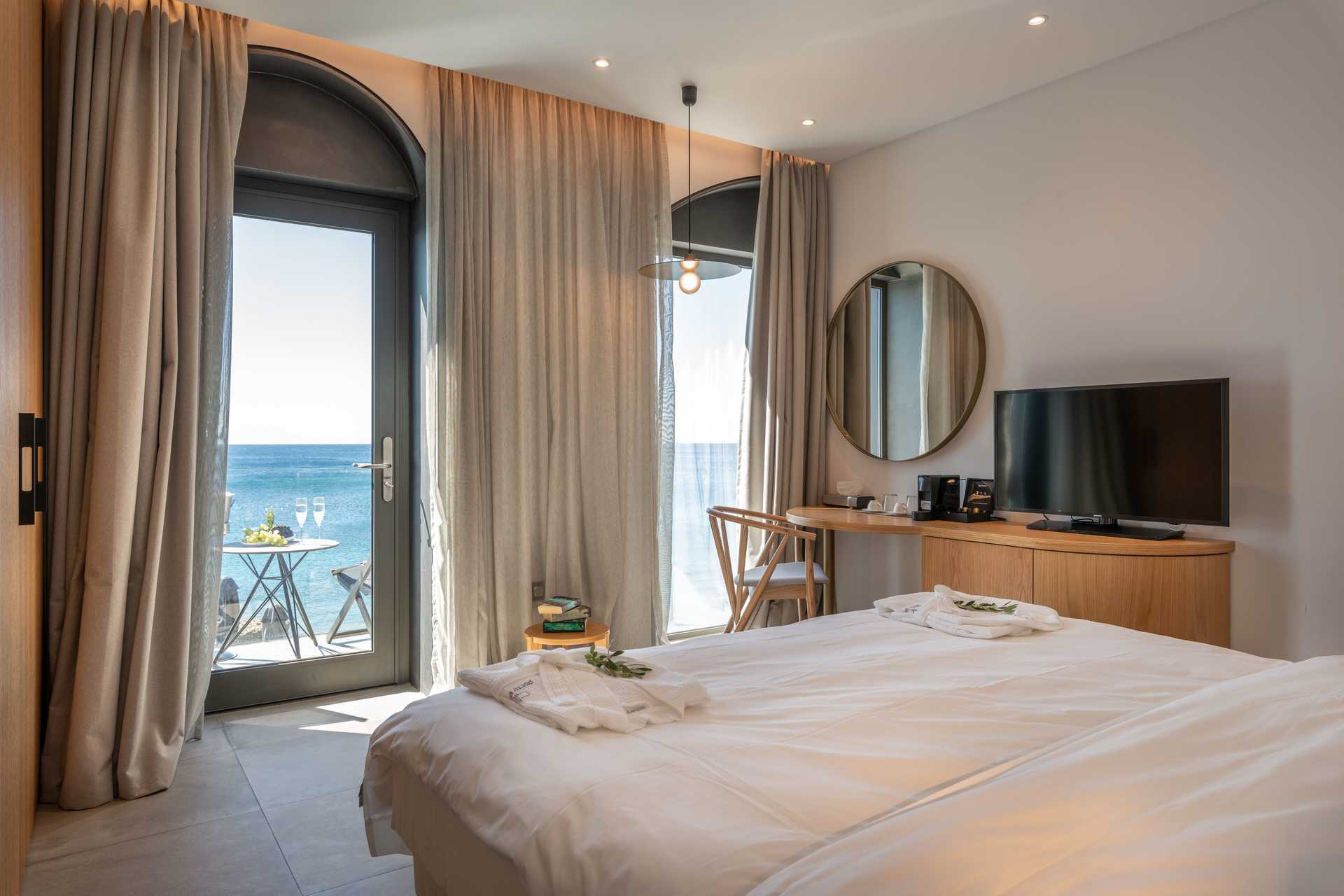 Deluxe kamer met terras en zeezicht. Het slaapcomfort is uitzonderlijk met een comfortabel tweepersoonsbed en linnengoed van hoge kwaliteit. Mogelijkheid tot een extra bed in de vorm van een eenpersoonsbed. Wifi, airconditioning en kluisje inbegrepen. Minibar/koelkast. Nespresso-apparaat, vier koffiecapsules inbegrepen, extra capsules zijn te koop bij de receptie. Bluetooth speakers zijn te leen bij de receptie tegen een toeslag. Badjassen. Haardroger. Badkamer met douche en toilet. Om de dag schoonmaak.